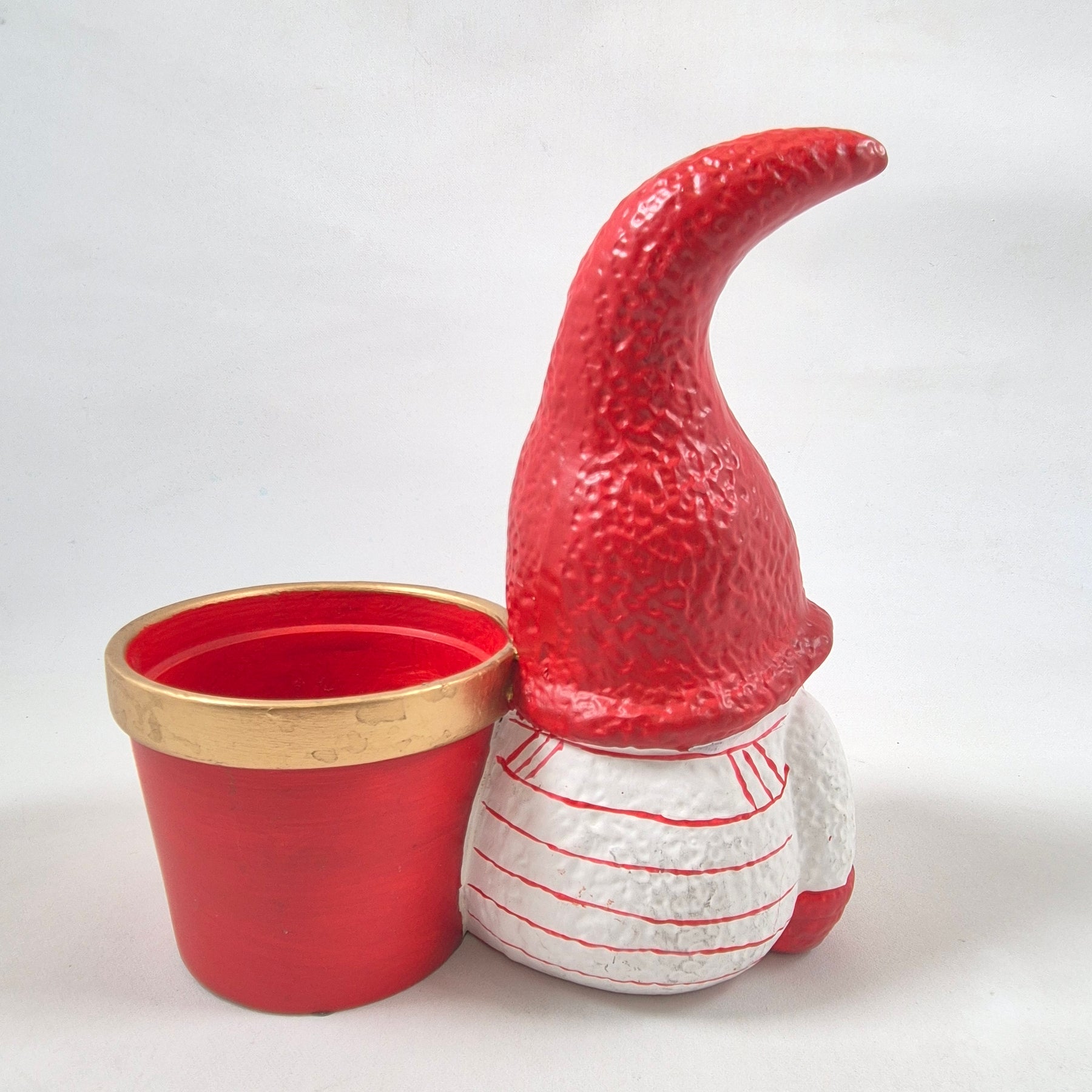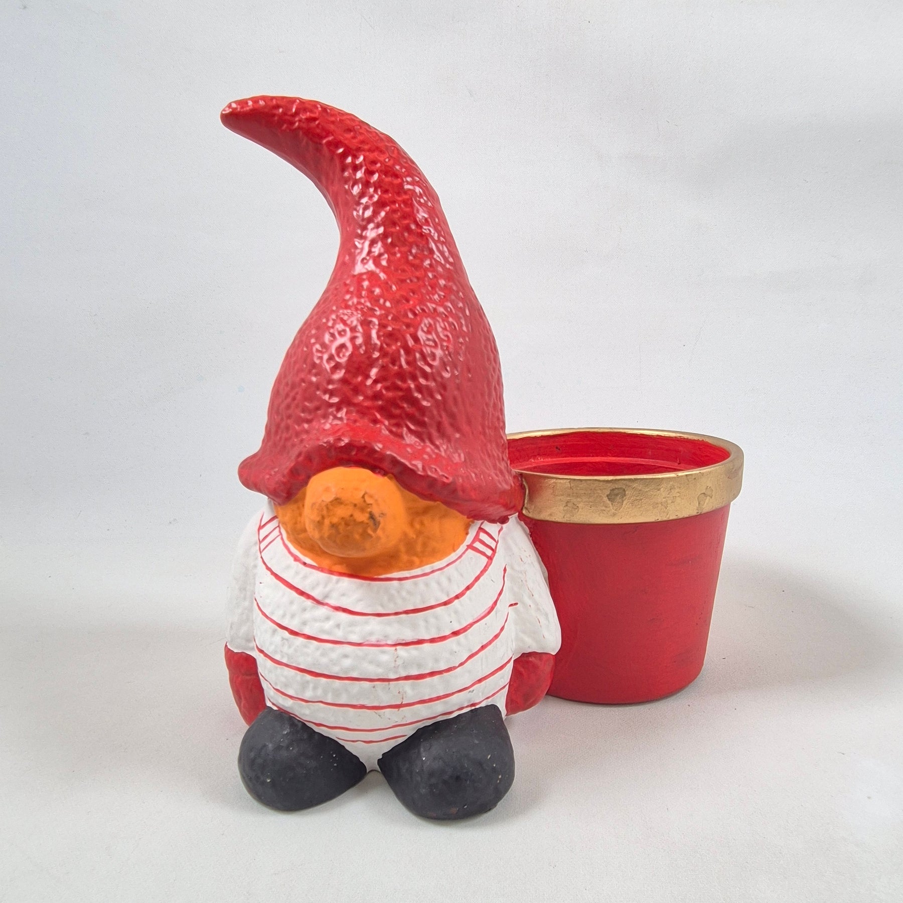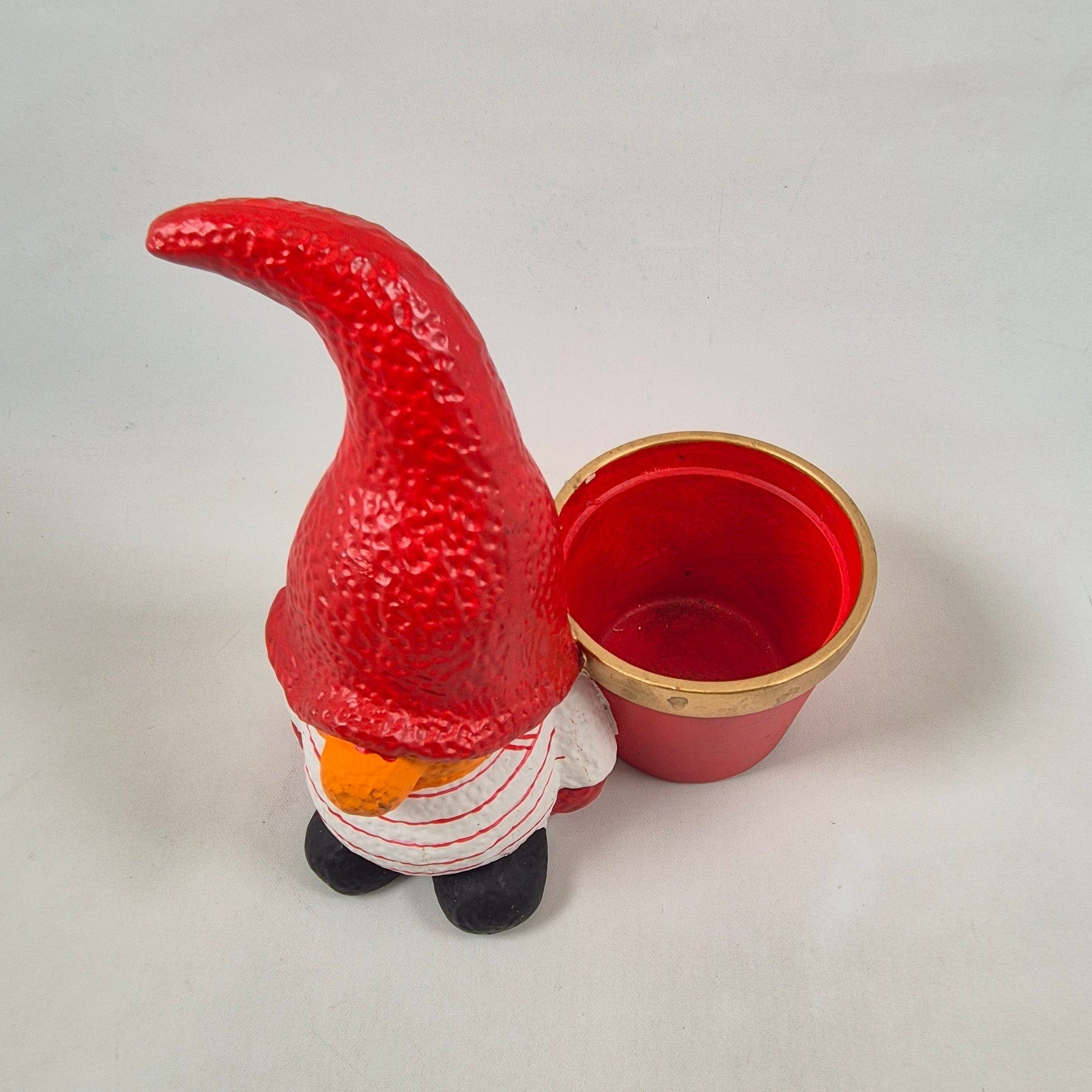 Denna särskilda trädgårdstomte är inte bara en dekorativ figur men också funktionell med en integrerad förvaringskruka, perfekt för små växter eller som en söt dekorationsdetalj inomhus eller i trädgården. Den är målad i livfulla färger med en glansig finish, vilket ger en glädjande och blickfångande effekt. Figuren är begagnad men har bevarats i mycket gott skick, vilket gör den till ett fantastiskt tillskott för både samlare och de som uppskattar en nostalgisk touch i sin heminredning.Produktspecifikationer