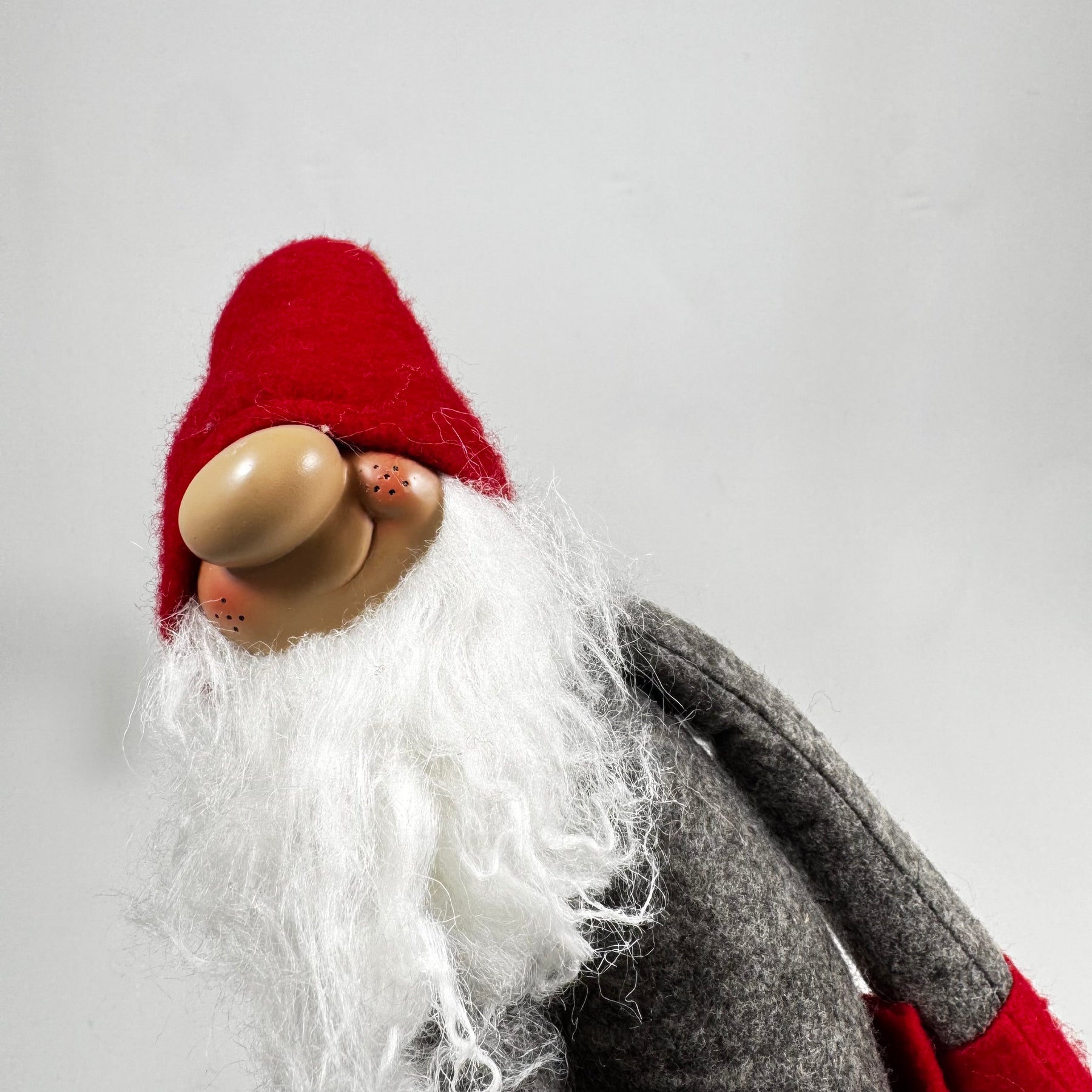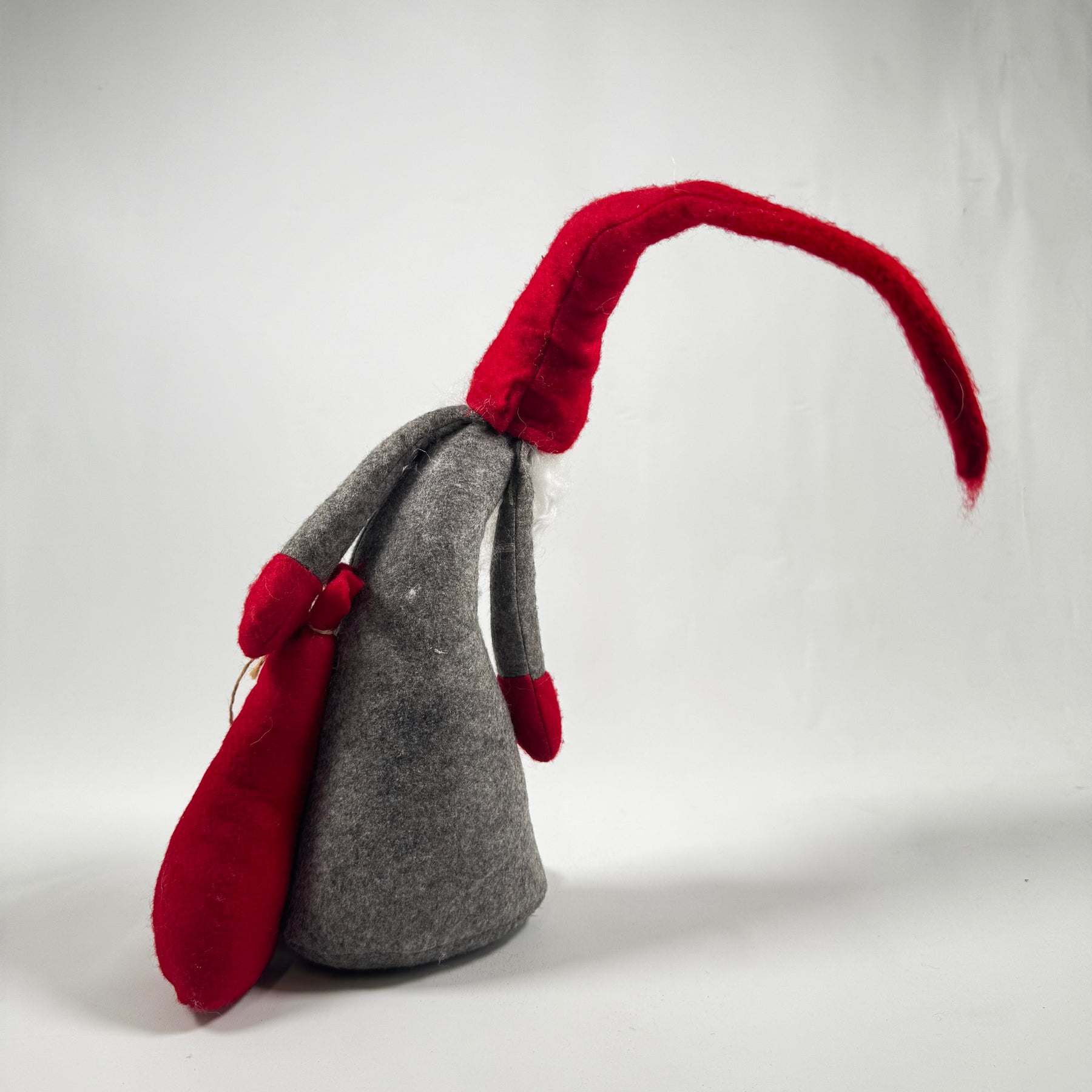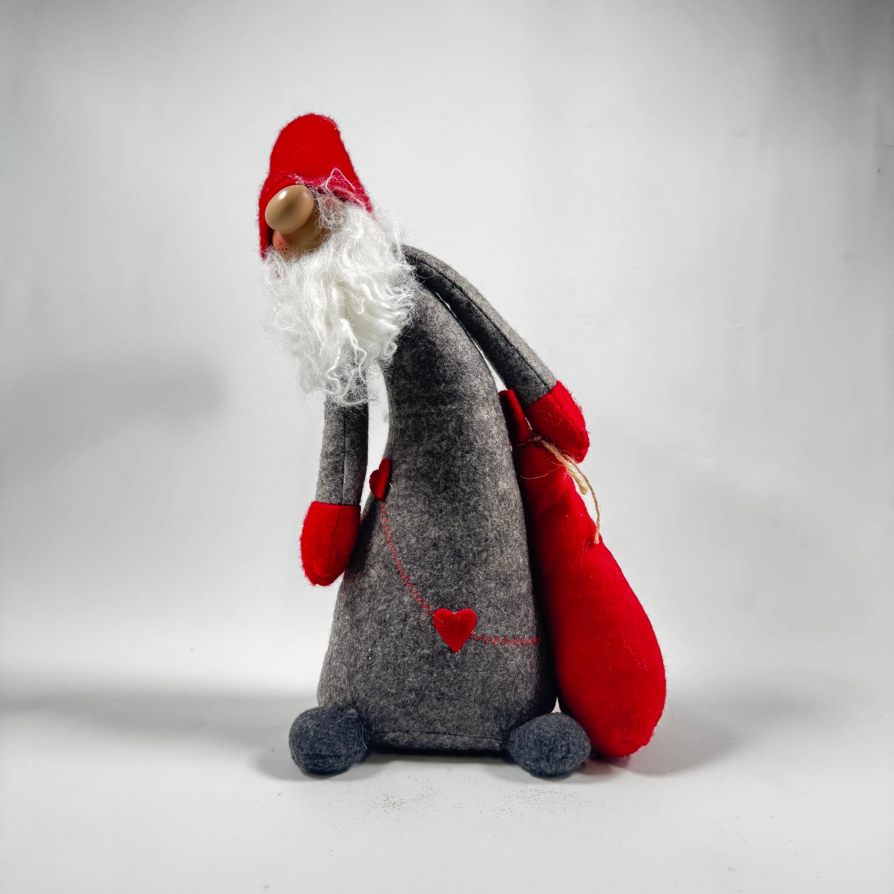 Denna dekorativa tomte är tillverkad i mjuka material som filtyg och ull, perfekt för att sprida julstämning i hemmet. Med sin röda mössa och grå kropp, är han en klassisk julfigur med detaljer som de små hjärtan anda en varm och inbjudande känsla. Trots sin användning är leksaken i utmärkt skick och redo att fortsätta sprida glädje.