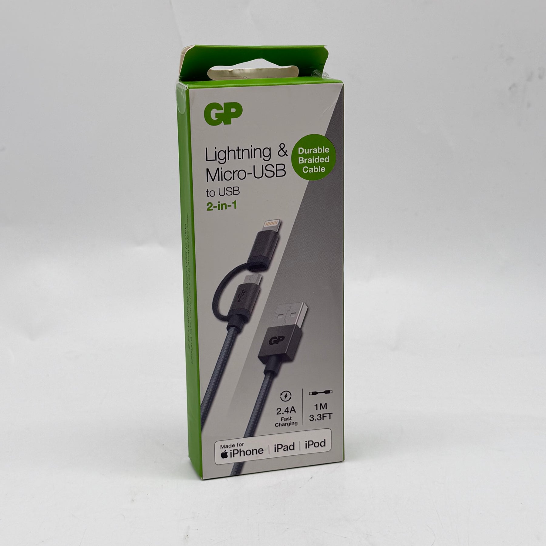 Denna GP Lightning & Micro-USB till USB-kabel är designad för att erbjuda både snabbladdning och effektiv dataöverföring. Den är tillverkad med slitstark nylonflätad kabel och robust anodiserat aluminiumhölje, vilket gör den både stilren och tålig. En perfekt lösning för att hålla dina enheter laddade och redo, oavsett vart du är. Produkten är ny och oanvänd och kommer i sin originalförpackning.3. Produktspecifikationer