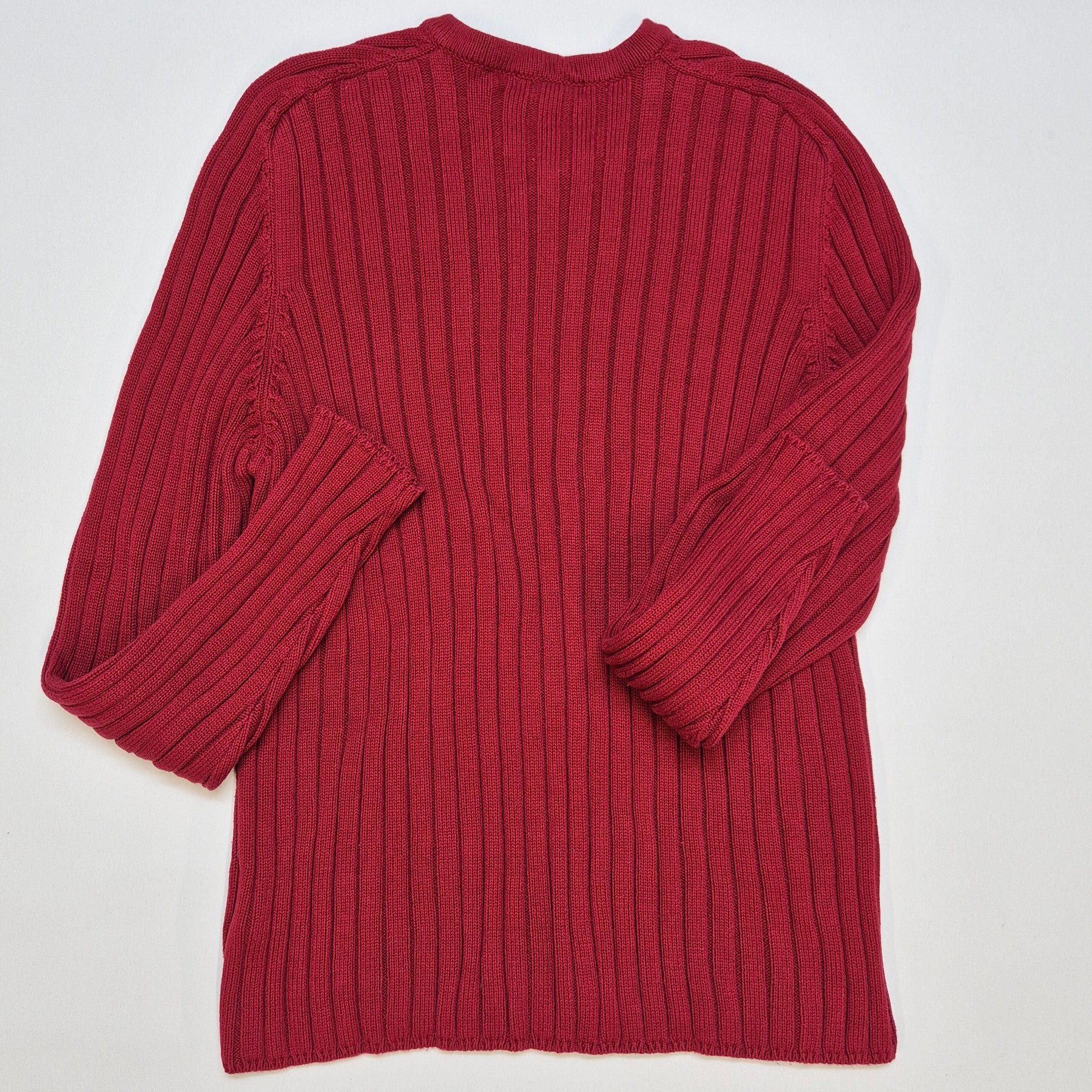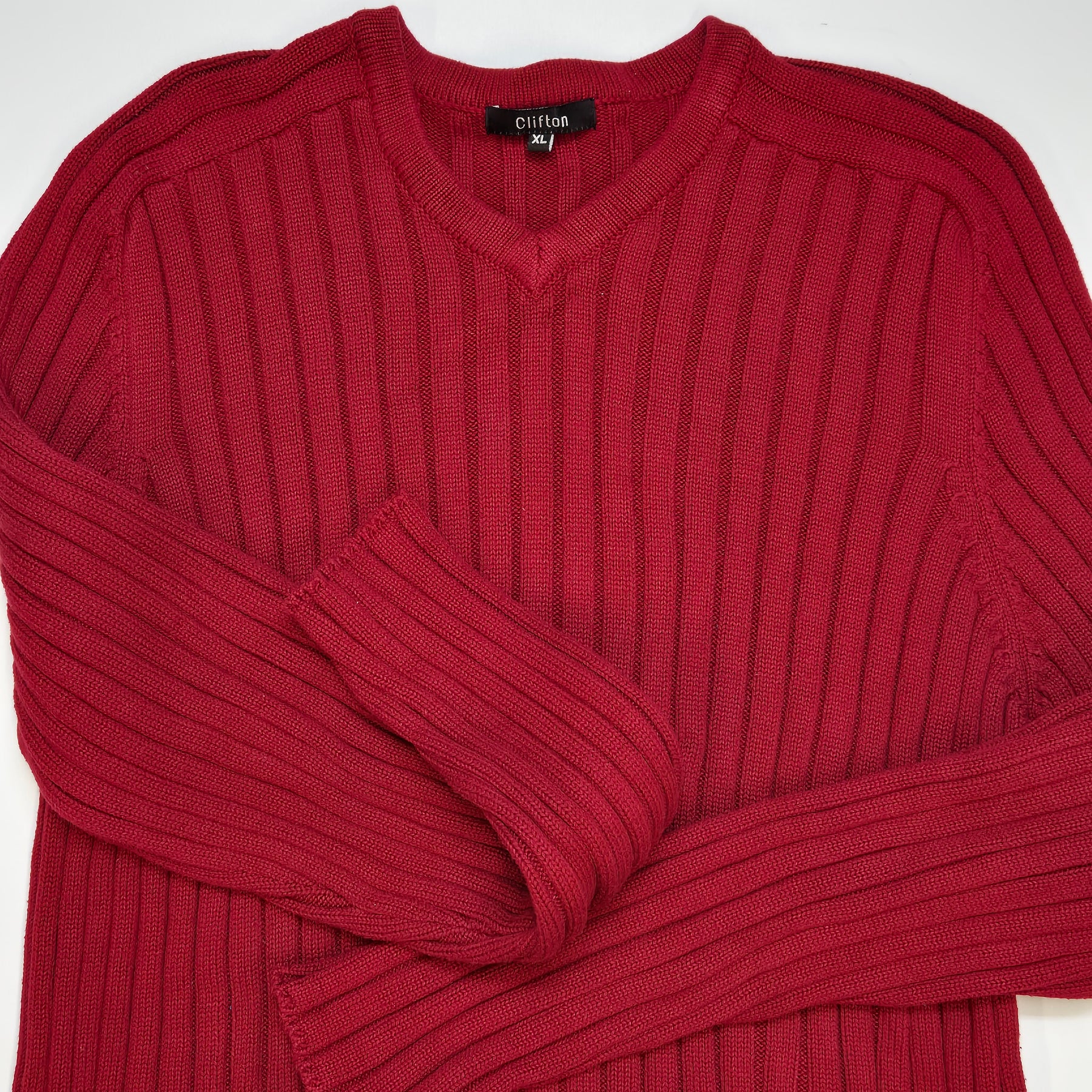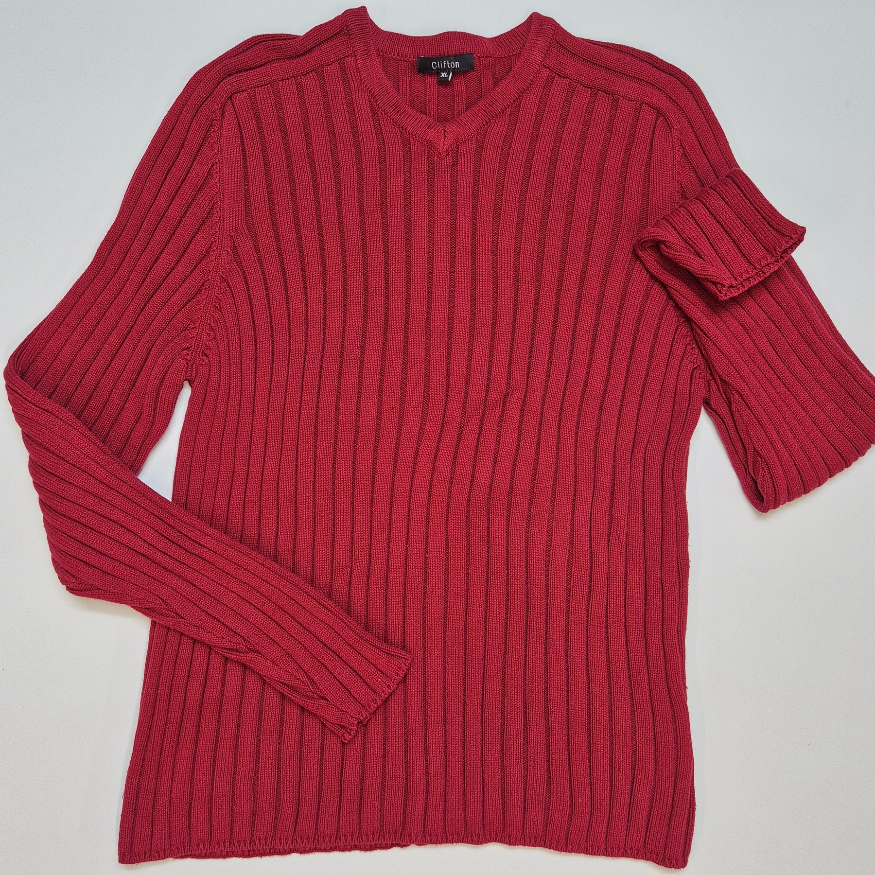 Denna tröja från Clifton är lika praktisk som den är elegant, tillverkad i ribbad stickning som ger både en anpassningsbar passform och håller dig varm. Med sin djupa röda färg och klassiska V-ringning, passar denna tröja perfekt till vardagsbruk samt semi-formella tillfällen. Tröjan är begagnad men har bevarats i mycket gott skick, vilket gör den till ett utmärkt köp för den modeintresserade.