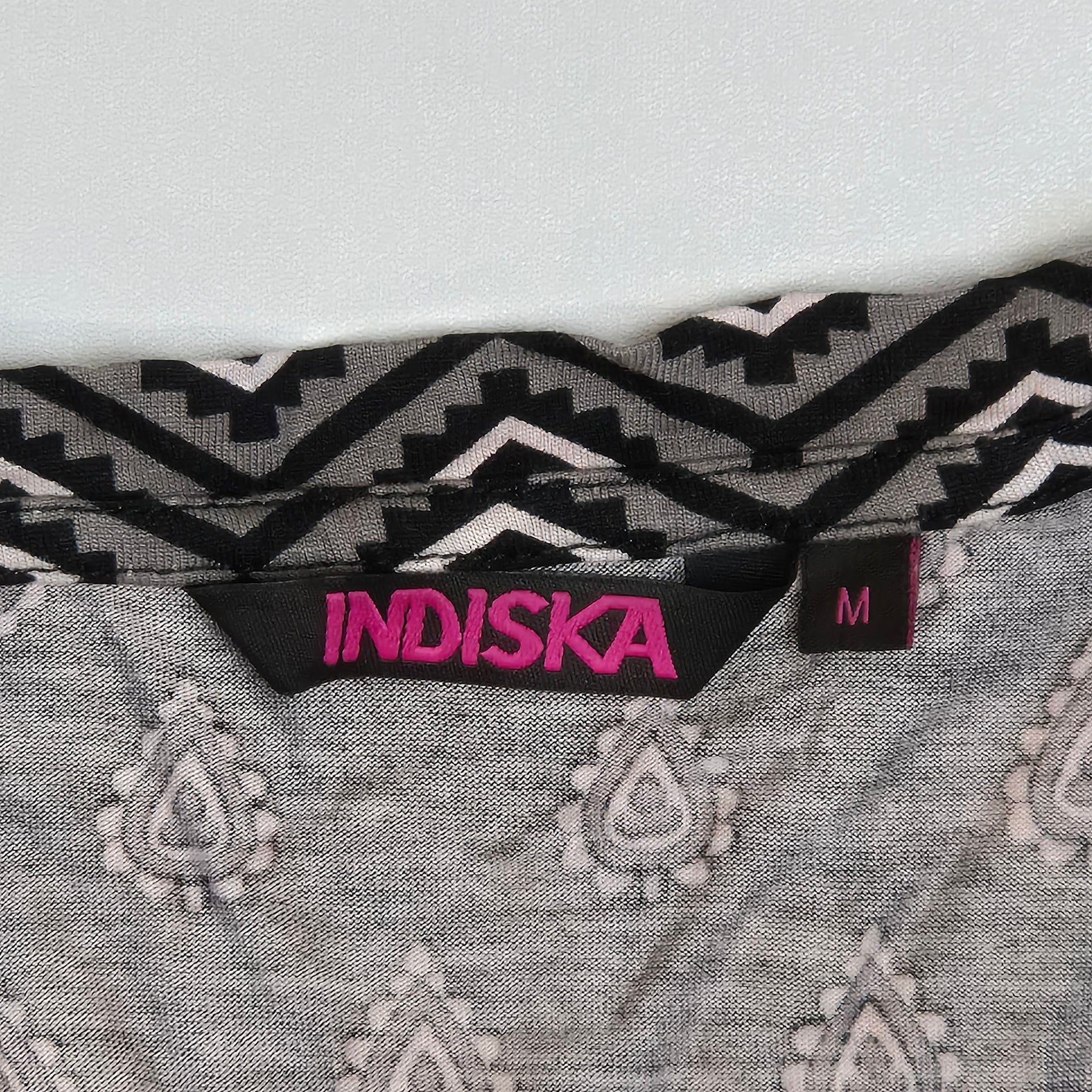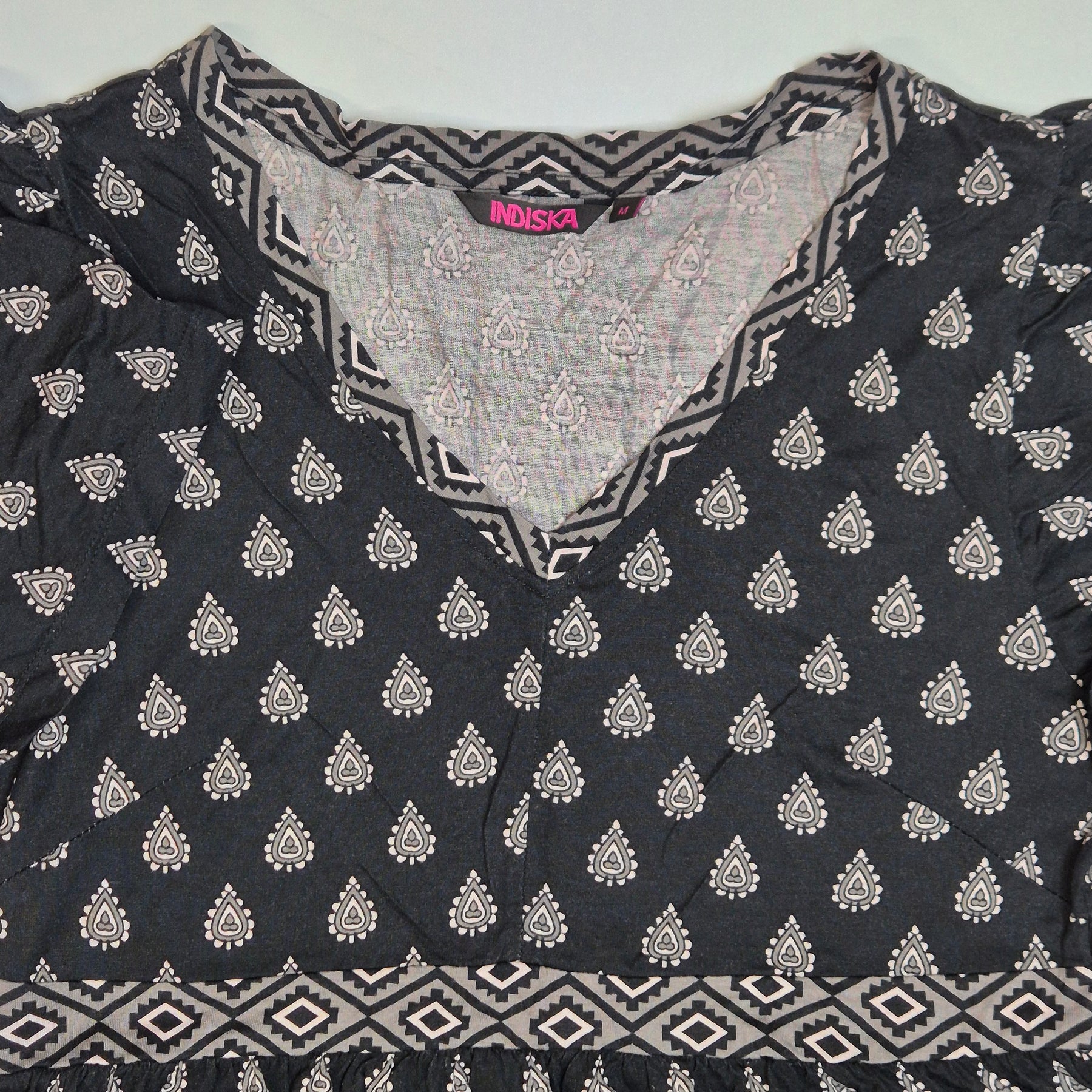 Denna eleganta klänning från Indiska är en verklig blickfångare med dess detaljrika mönster och klassiska snitt. Klänningen är tillverkad i ett behagligt material, vilket gör den idealisk för både festliga tillfällen och avslappnad alltagsbruk. Klänningen är begagnad men i mycket gott skick, vilket erbjuder en fantastisk möjlighet att äga ett unikt plagg till ett förmånligt pris.Produktspecifikationer