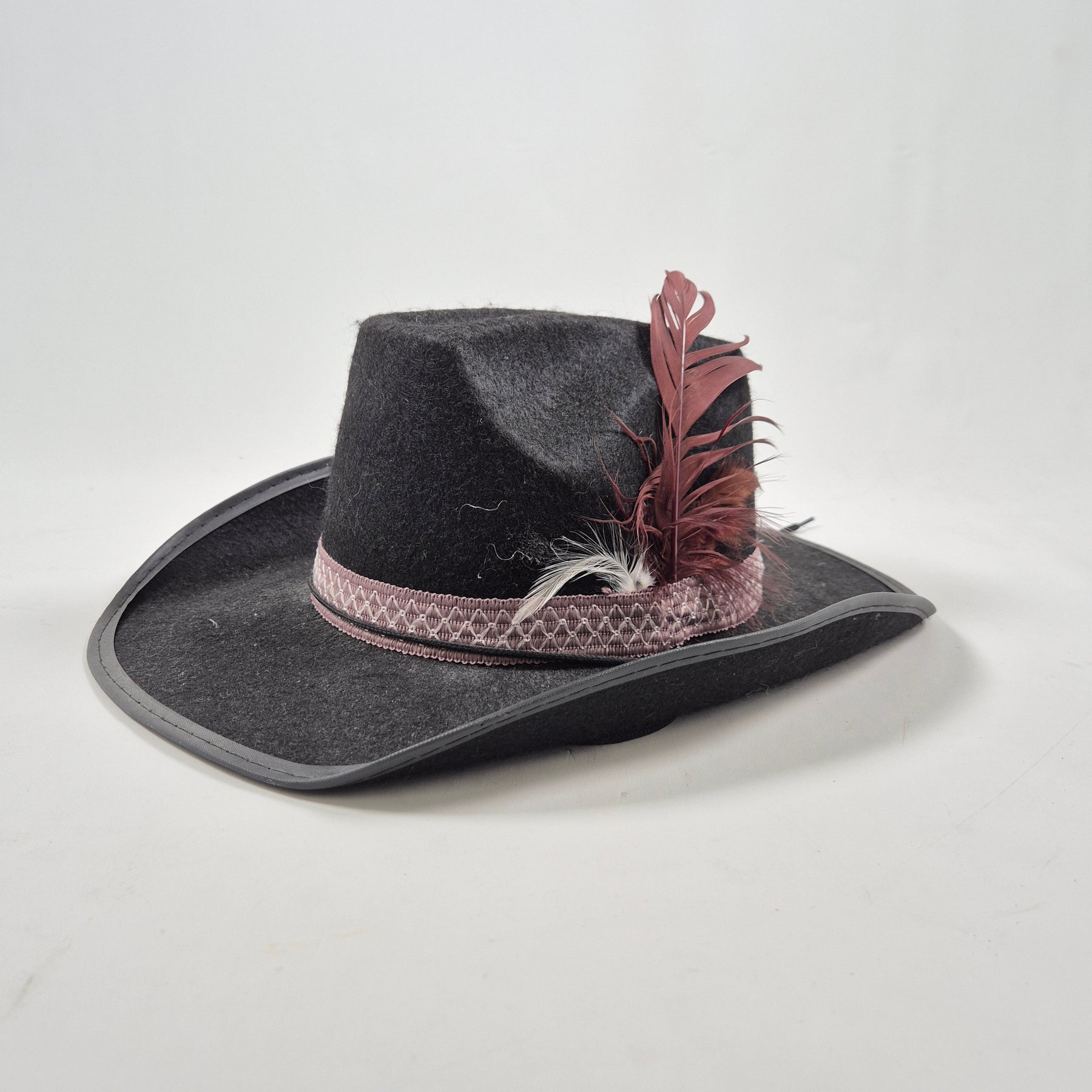 Denna distinkta herrhatt i mörkgrått filtmaterial är både stilfull och praktisk. Prydd med en dekorativ band och fjädrar som ger en unik touch, är hatten perfekt för både vardagligt bruk och speciella tillfällen. Den är tillverkad med omsorg för att ge en klassisk look, och dess högkvalitativa material garanterar hållbarhet och komfort. Hatten är i mycket gott skick och visar minimala tecken på användning.