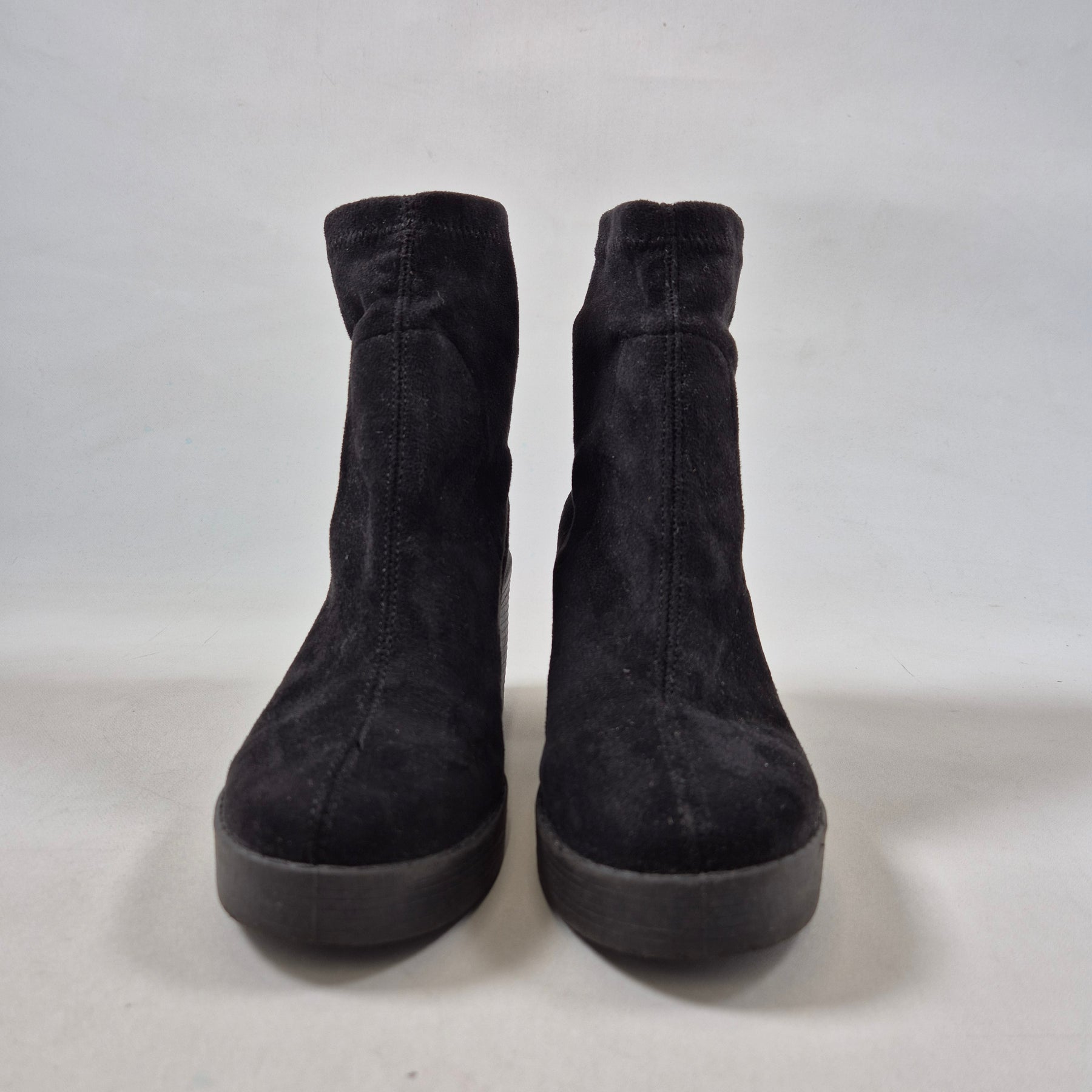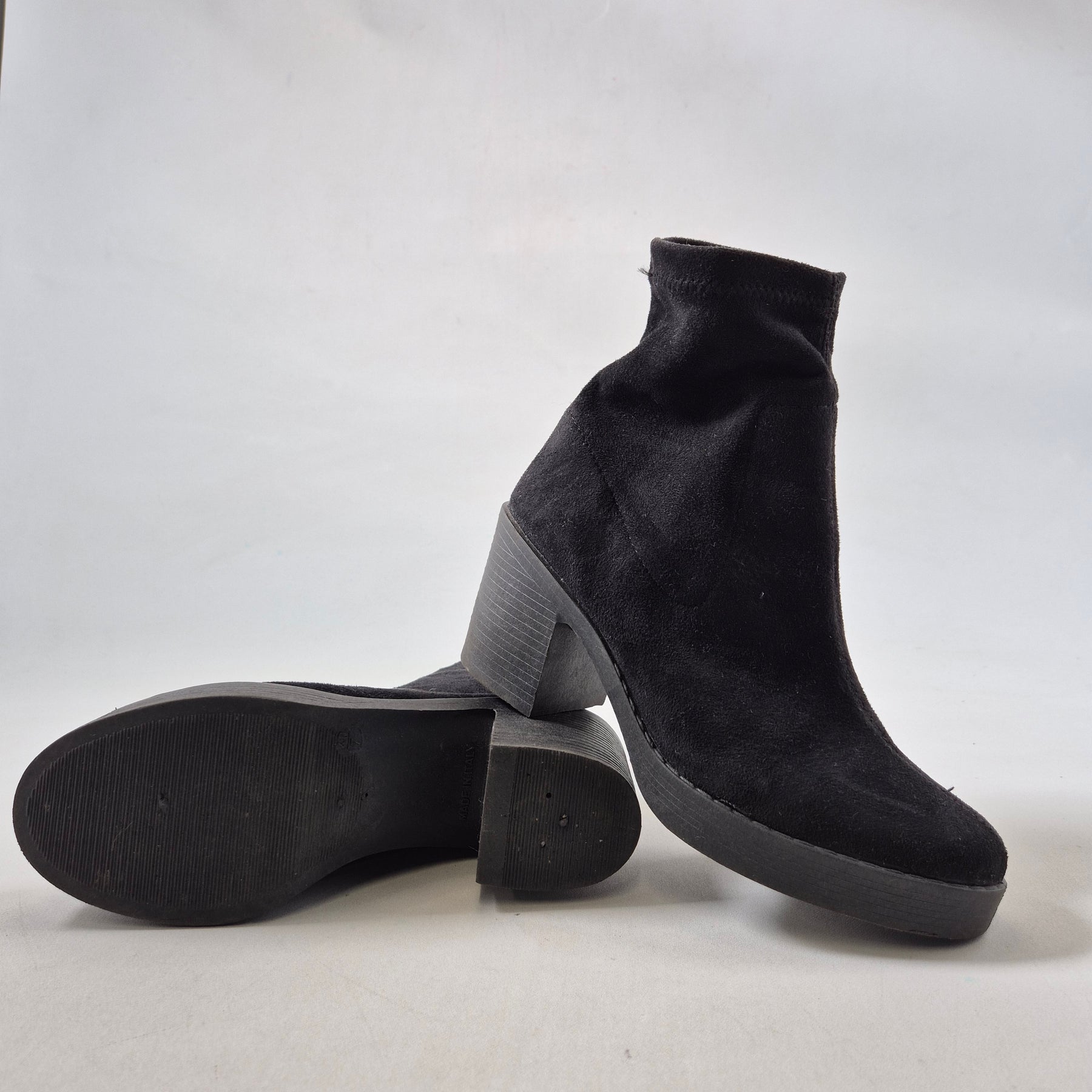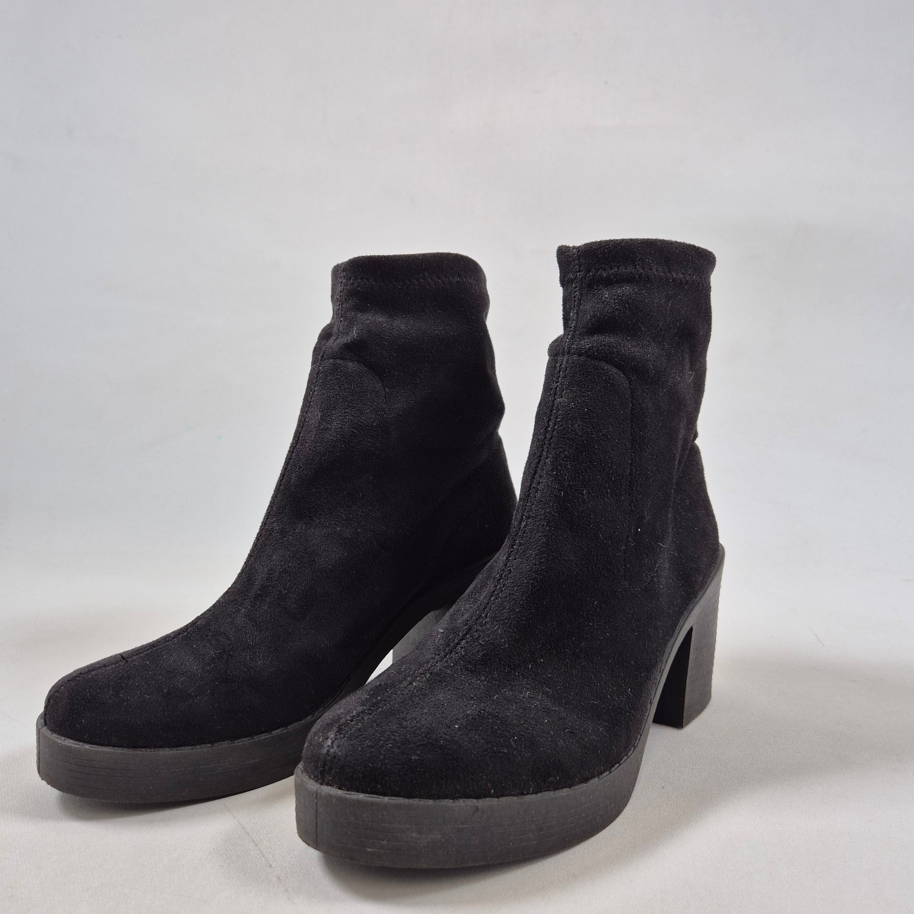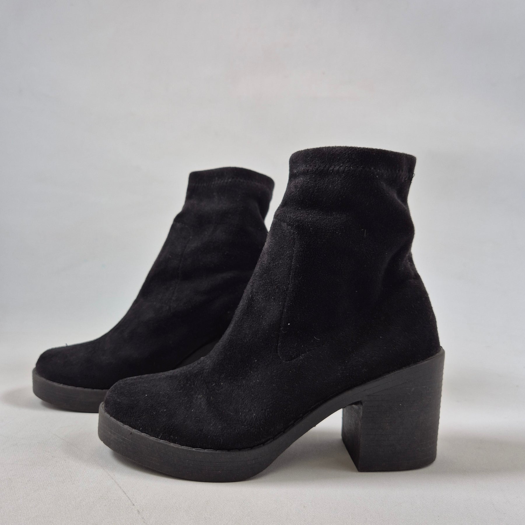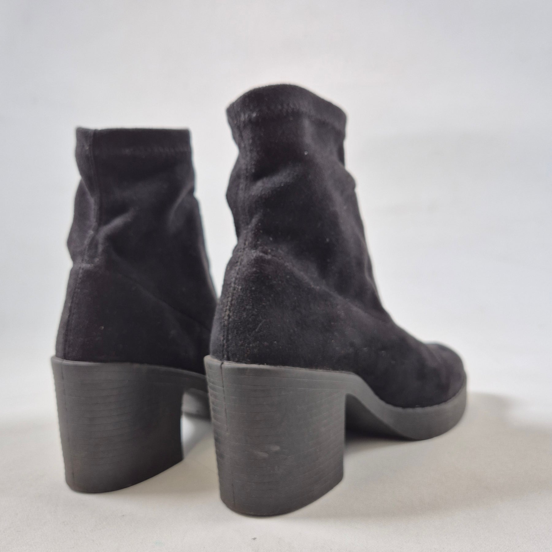 Dessa stilfulla svarta stövletter är av högsta kvalitet och tillverkade i Italien. Med ett klackhöjd som kombinerar komfort och elegans är de ett idealiskt val för både vardag och speciella tillfällen. Stövletterna är tillverkade i ett mjukt mockamaterial, vilket ger både komfort och en lyxig känsla. Trots att de är använda, är de i mycket gott skick och har endast mindre tecken på användning.