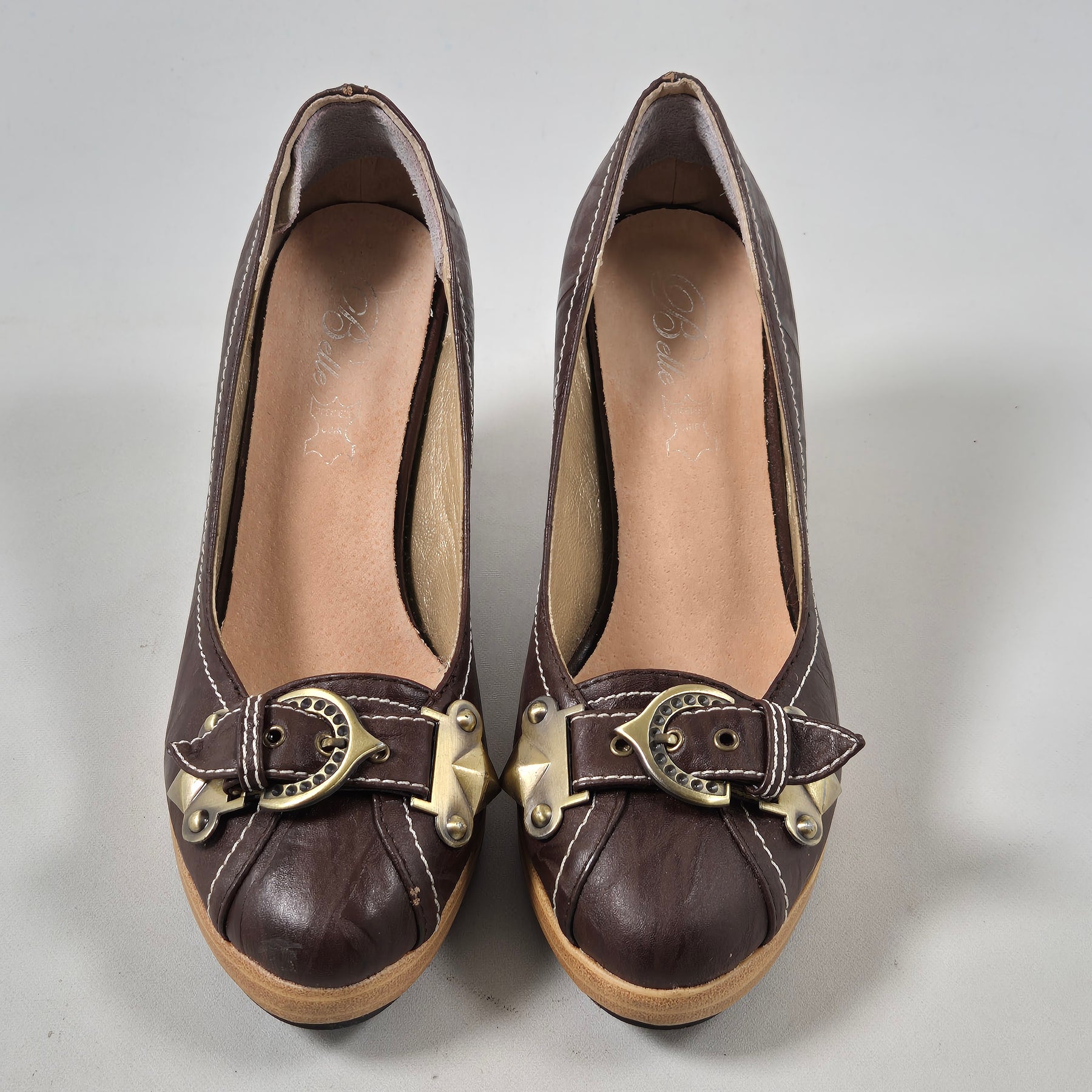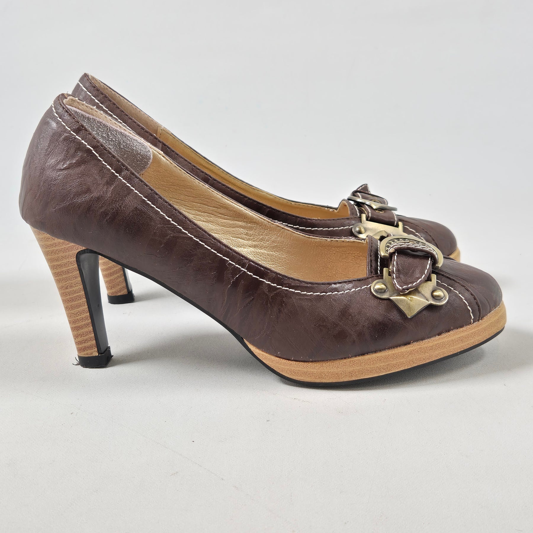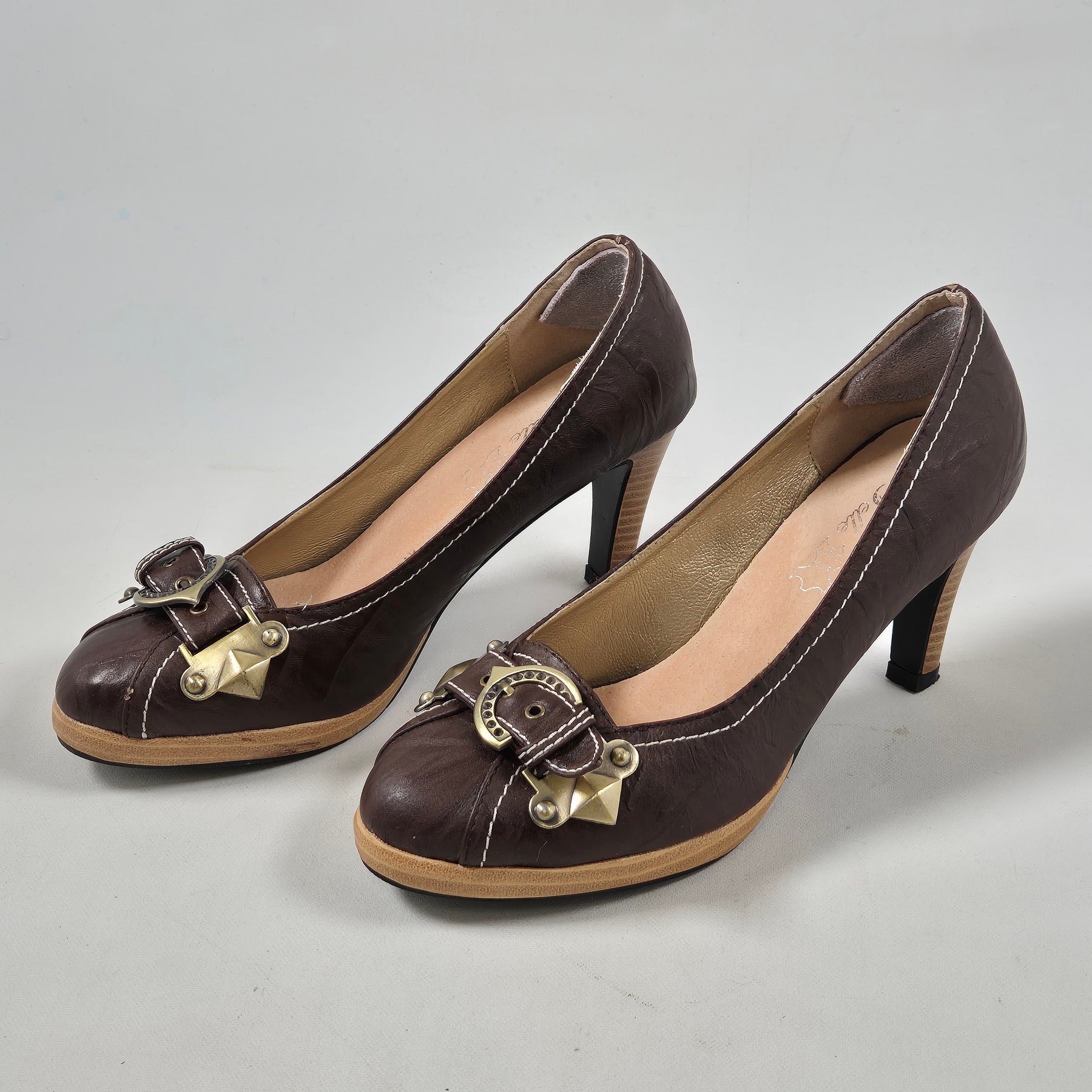 Dessa charmiga pumps är tillverkade i kvalitativt brunt läder med dekorativa spännen och gyllene detaljer som ger en unik touch. Perfekt för den som uppskattar vintagestil och elegans i sin garderob. Skorna är begagnade men i mycket gott skick, vilket gör dem till ett hållbart och stiligt val.Kategori | Damskor |