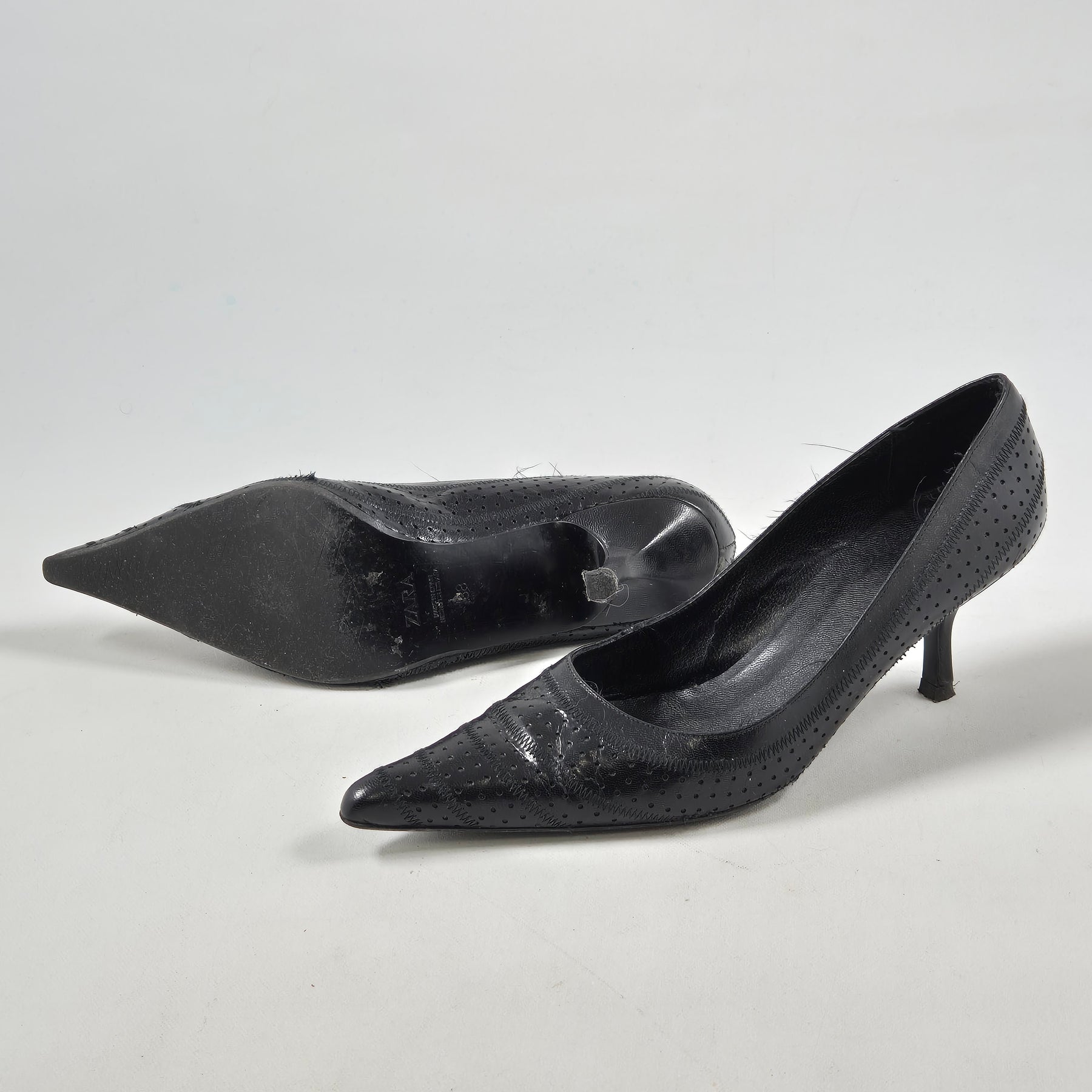 Dessa eleganta damskor från välkända märket Zara är utformade i en klassisk pumpstil med en sofistikerad perforering som bidrar med en unik touch. Skorna är tillverkade i Spanien och erbjuder både komfort och stil för festliga tillfällen eller kontoret. Trots att de är begagnade, är de i gott skick och kan ge ditt outfit det lilla extra.
