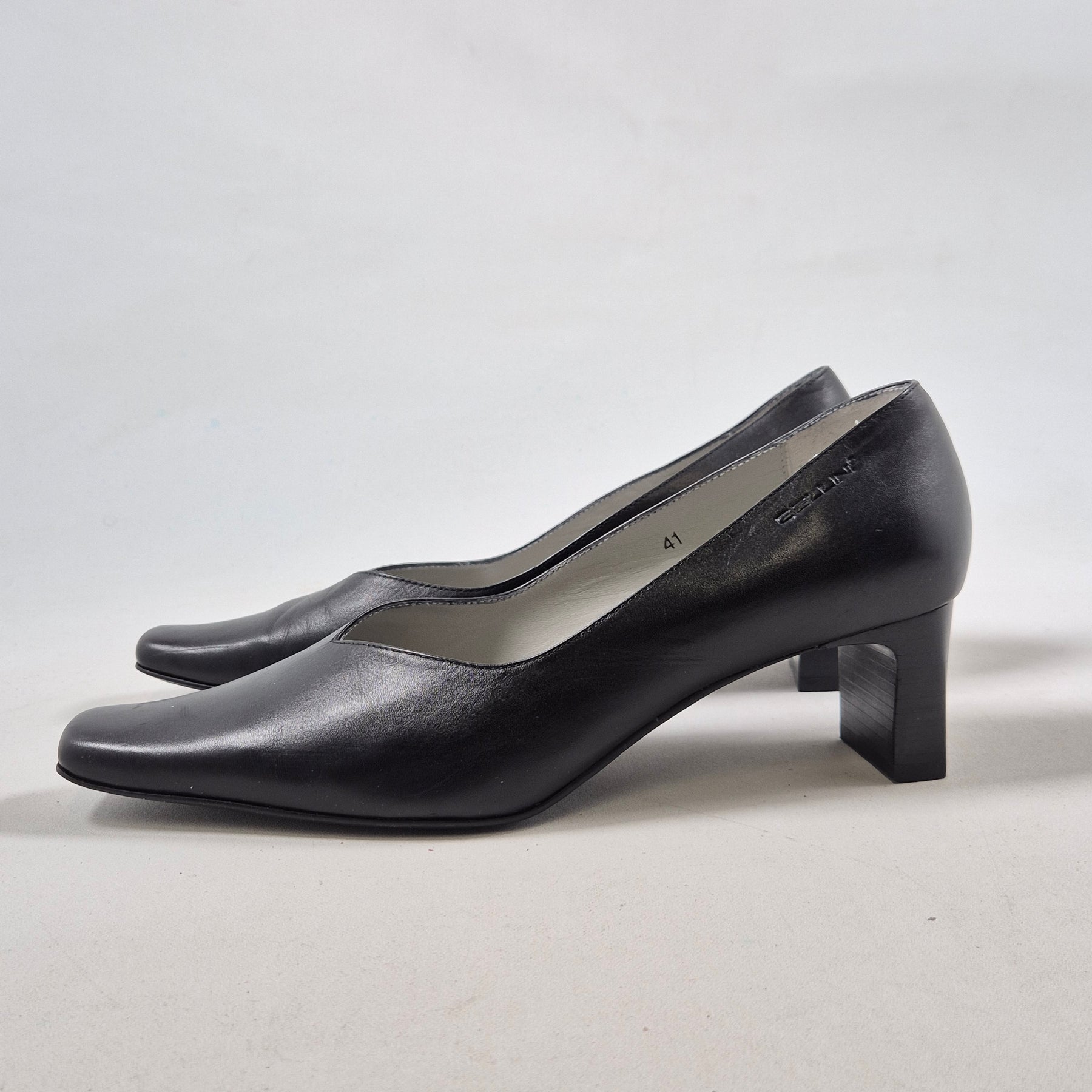 Dessa klassiska pumps är en grundläggande del av varje garderob. Tillverkade av slätt, svart läder med en bekväm klackhöjd som passar perfekt för både vardagligt och formellt bruk. Denna modell kombinerar funktionalitet med stil och ger en sofistikerad look. Skorna är begagnade men i mycket gott skick, med minimala tecken på användning.Produktspecifikationer