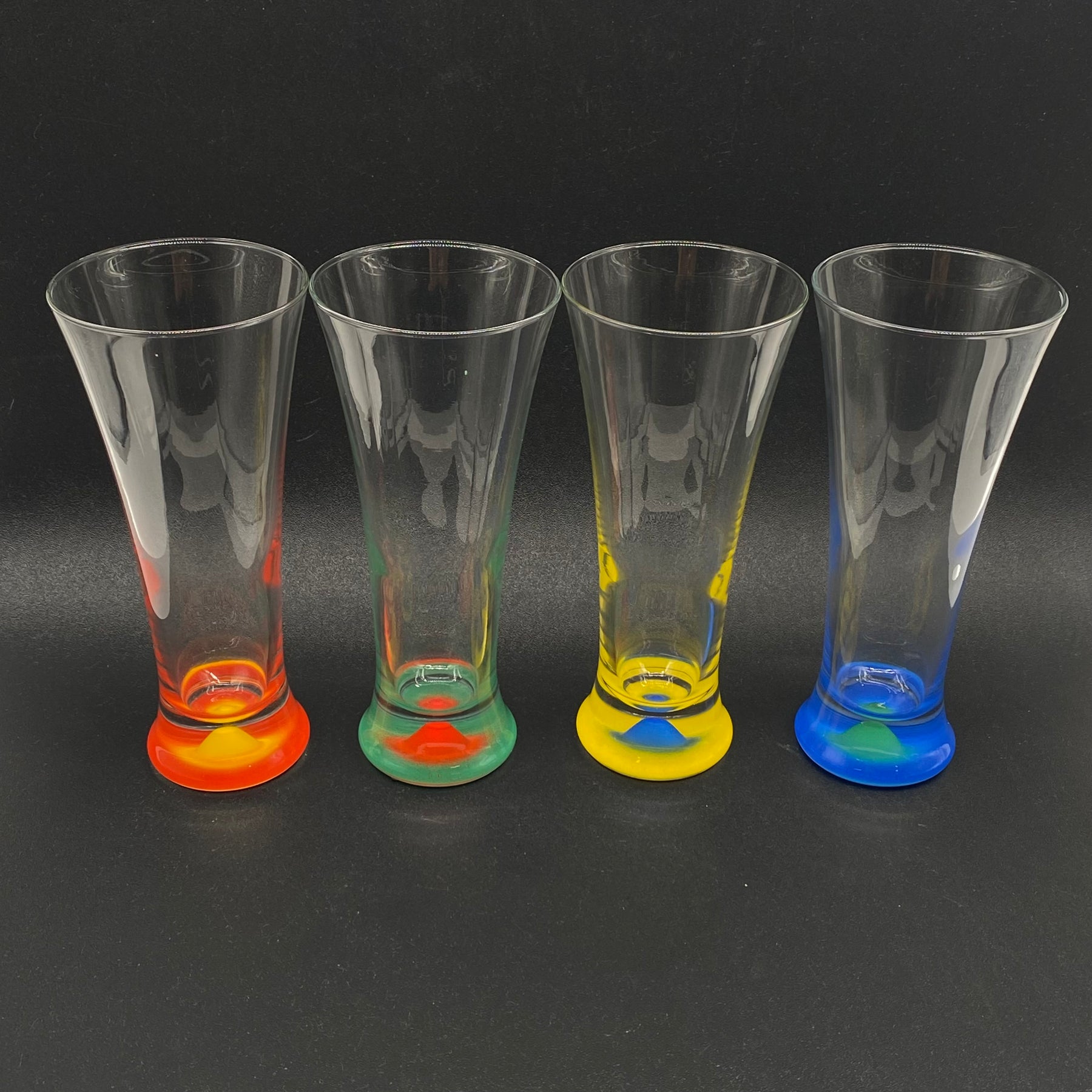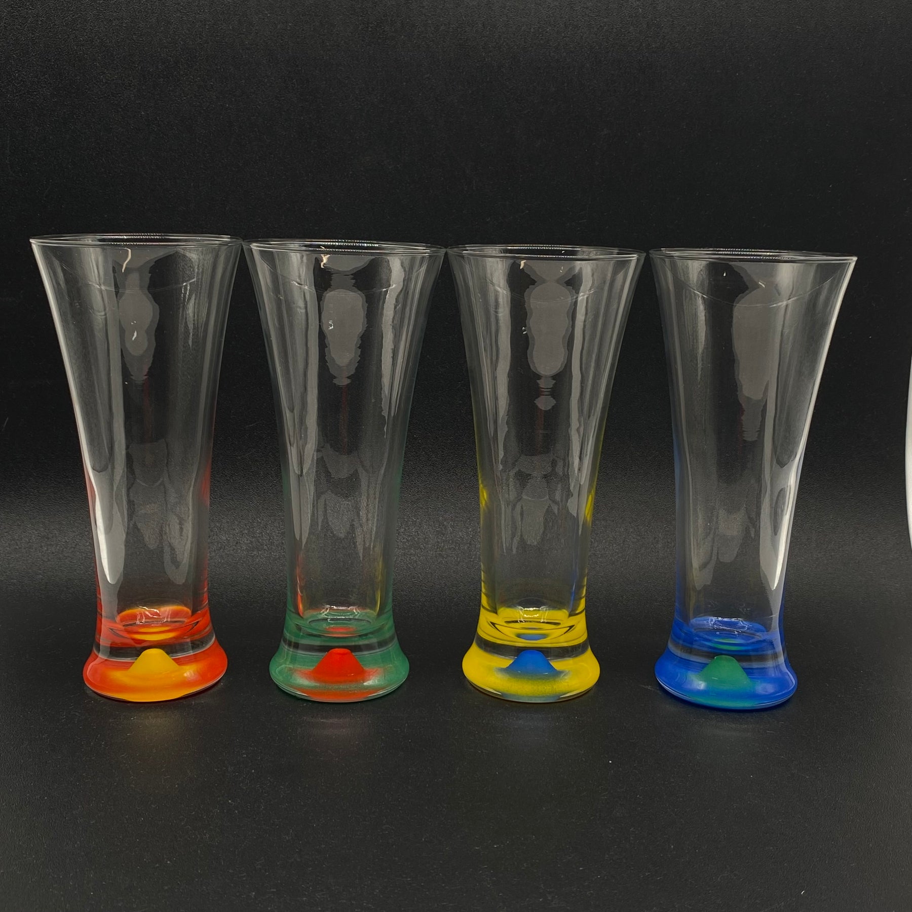 Dessa unika dricksglas kännetecknas av sina distinkt färgade baser i rött, grönt, gult och blått, som skapar en livlig och inbjudande atmosfär vid varje bordsdukning. Glasen är idealiska för allt från vardagligt bruk till festligare tillfällen. Deras eleganta design och levande färger gör dem till ett utmärkt tillägg i varje glas-samling. Glasen är begagnade men i mycket gott skick vilket bidrar till en hållbar konsumtion.