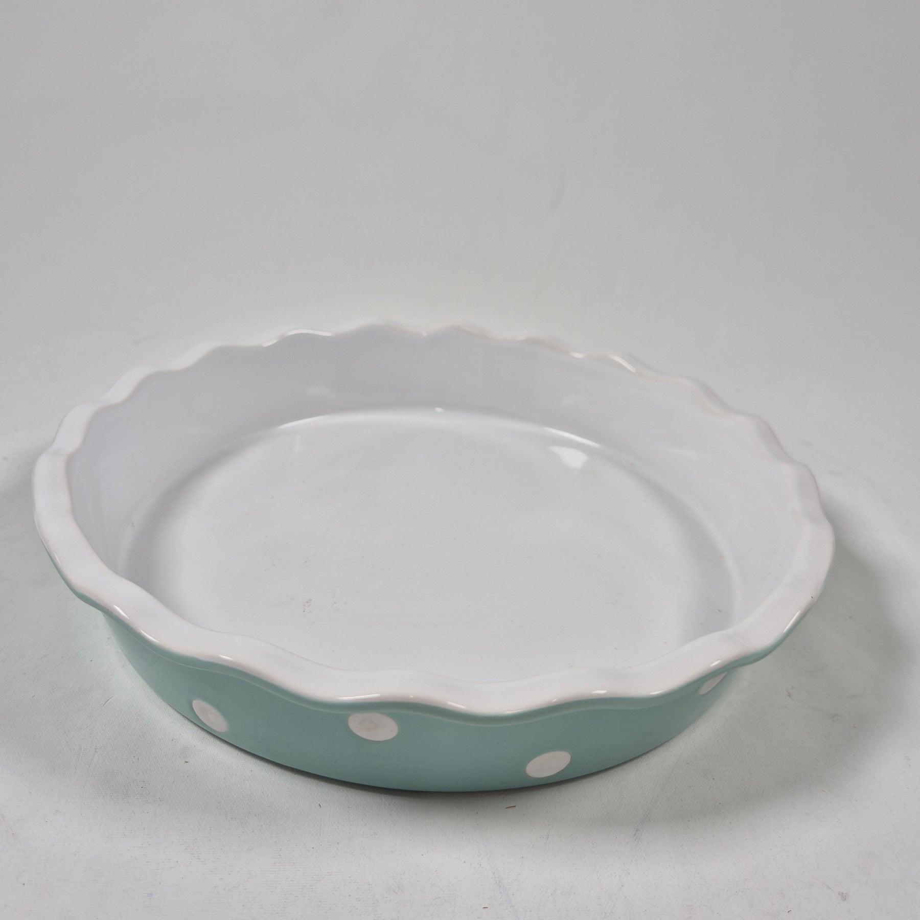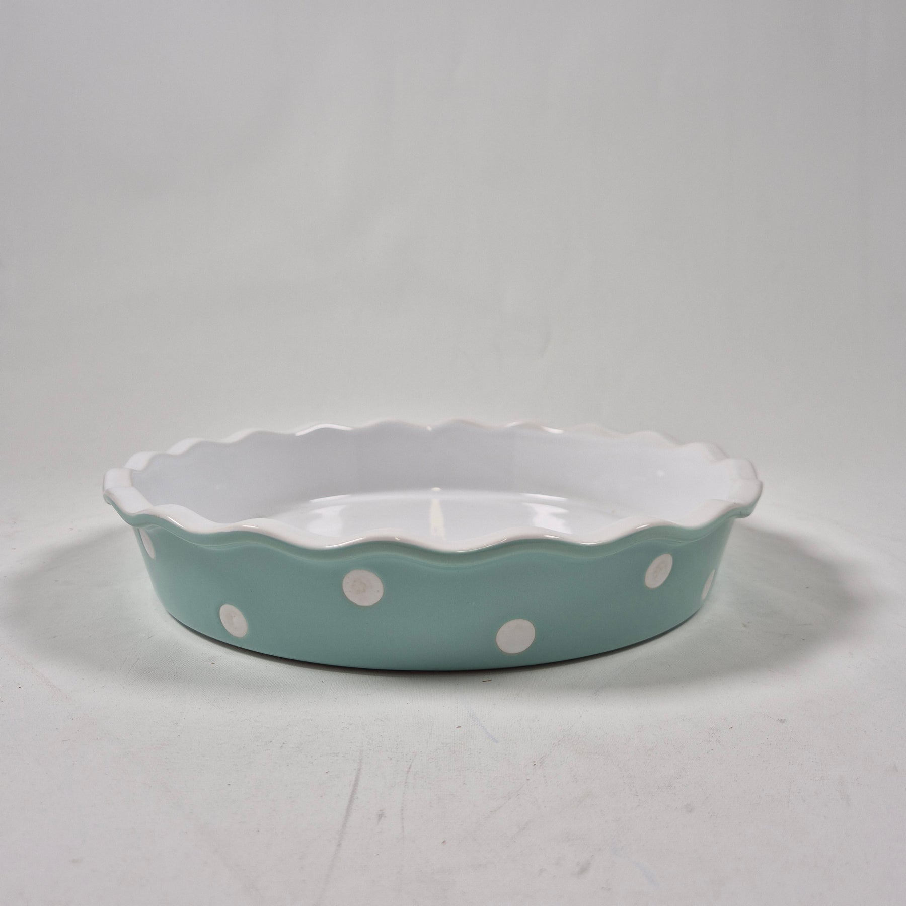 Denna vackra pajform pryds av ett nostalgiskt prickigt mönster och en elegant vågig kant, vilket gör den till en attraktiv del av dukningen. Pajformen tillhör GreenGate-serien, känd för sin höga kvalitet och tåliga material som är säkra för diskmaskin, ugn och mikrovågsugn. Perfekt för alla som uppskattar vacker men funktionell köksutrustning. Pajformen är begagnad men i mycket gott skick, nästan som ny.