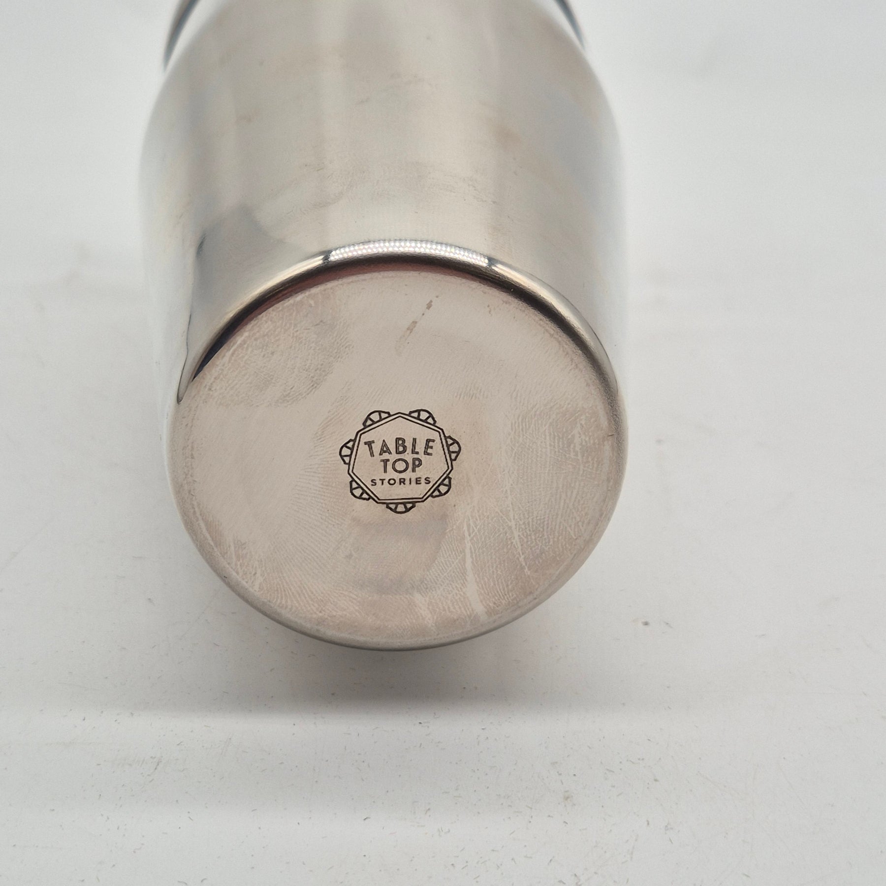 Denna klassiska cocktailshaker av rostfritt stål är ett måste för varje hemmabar. Dess glänsande yttre är inte bara attraktivt utan också funktionellt, perfekt för att blanda dina favoritcocktails med stil. Den är märkt med logotypen från Table Top Stories, vilket tillför en exklusiv touch. Shaker är begagnad men i mycket gott skick, enastående för den entusiastiska bartendern.