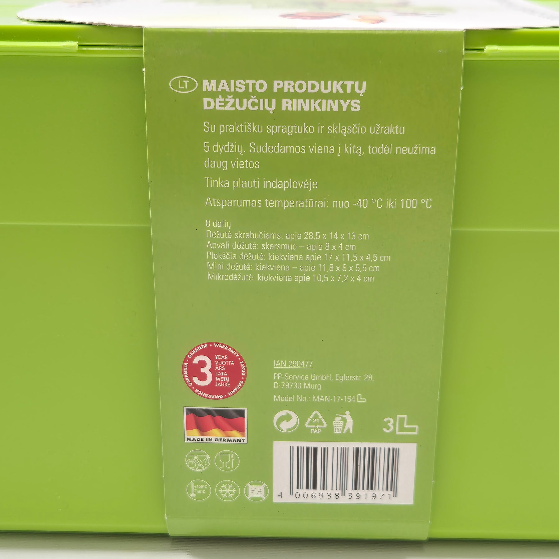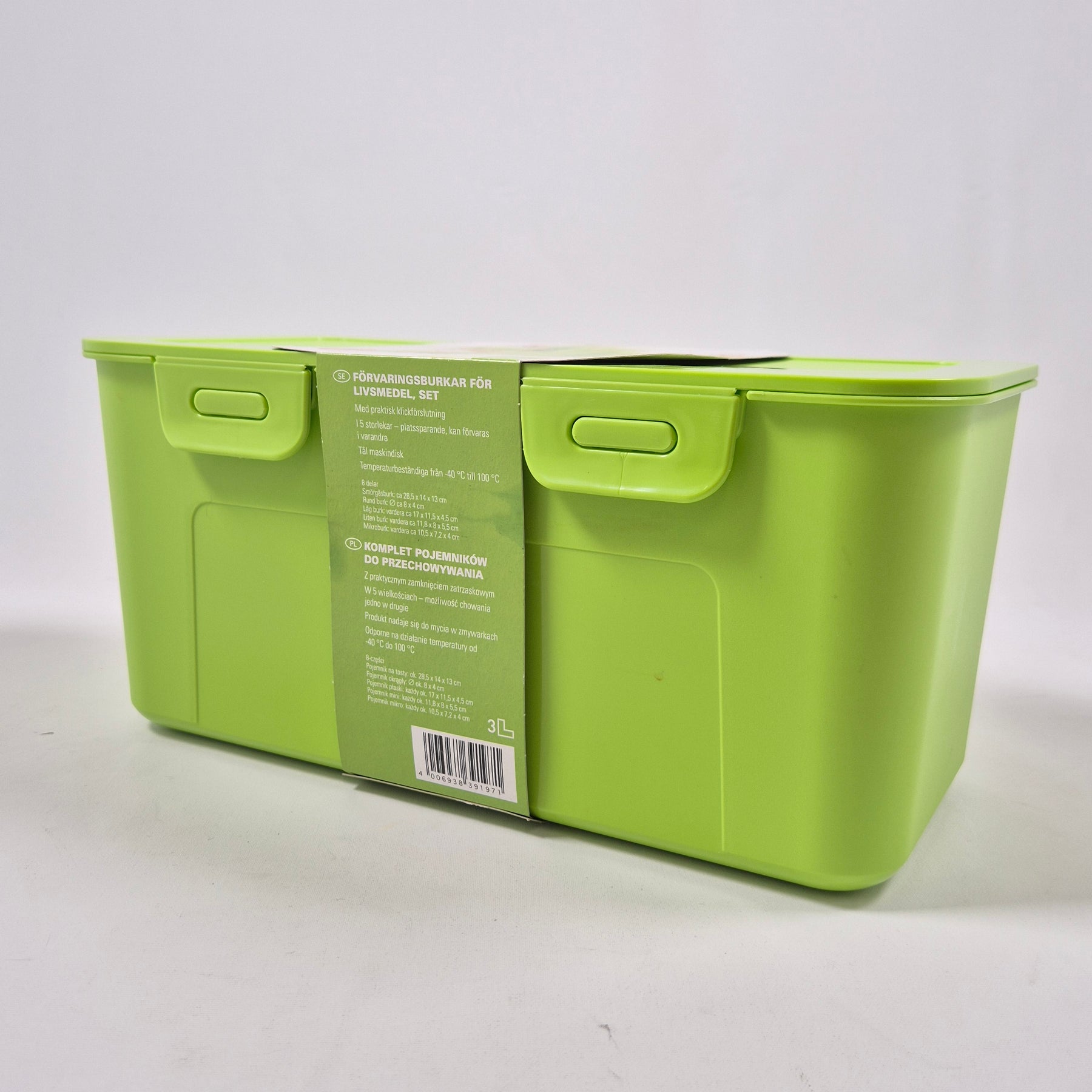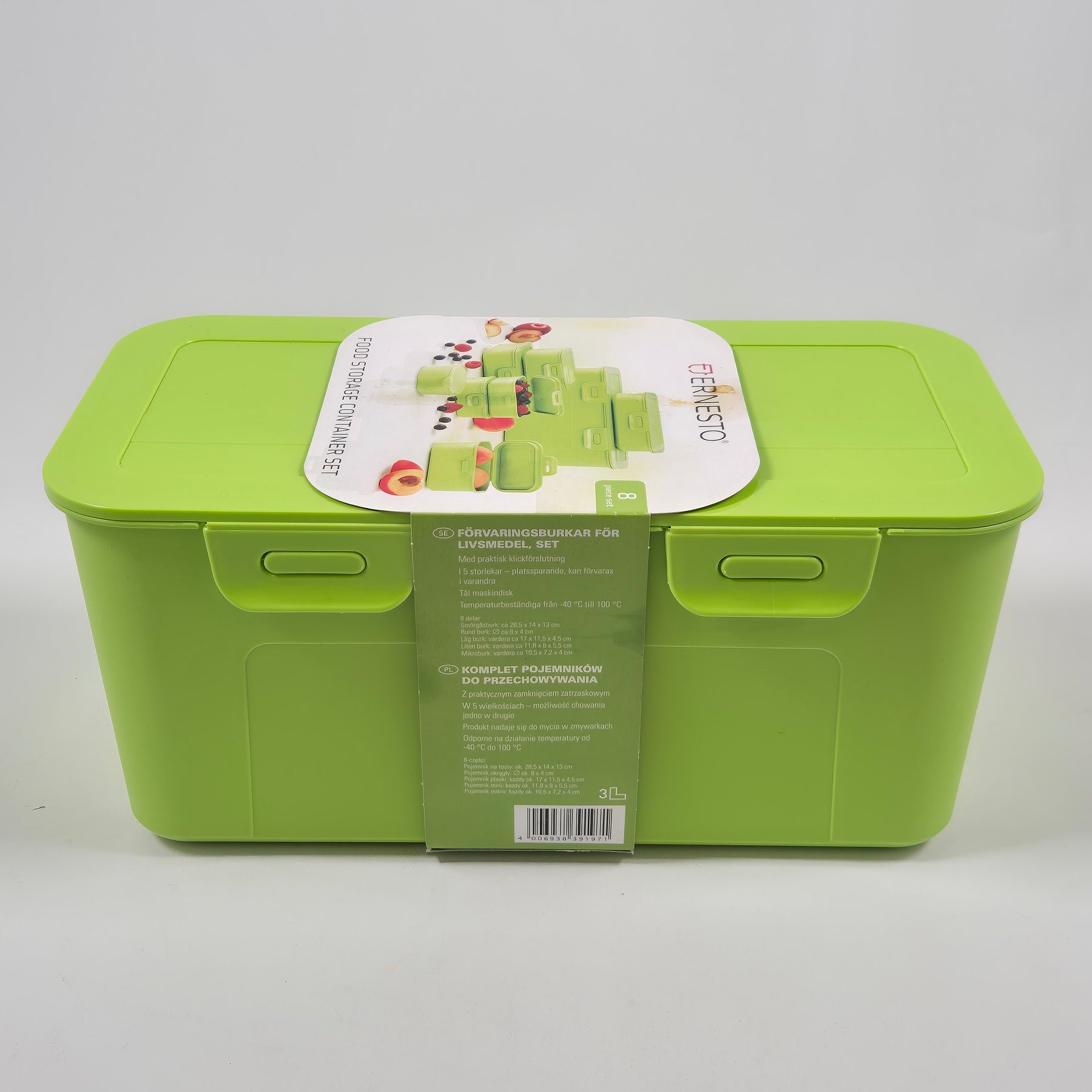 Denna förvaringslåda är tillverkad för att hålla livsmedel fräscha och organiserade. Setet innehåller lådor i olika storlekar som kan staplas inuti varandra för att spara utrymme. De är tillverkade av hållbart material och är både diskmaskinssäkra och mikrovågssäkra. Lådorna är praktiska för allt från förvaring i kylskåp till matlådor för jobbet