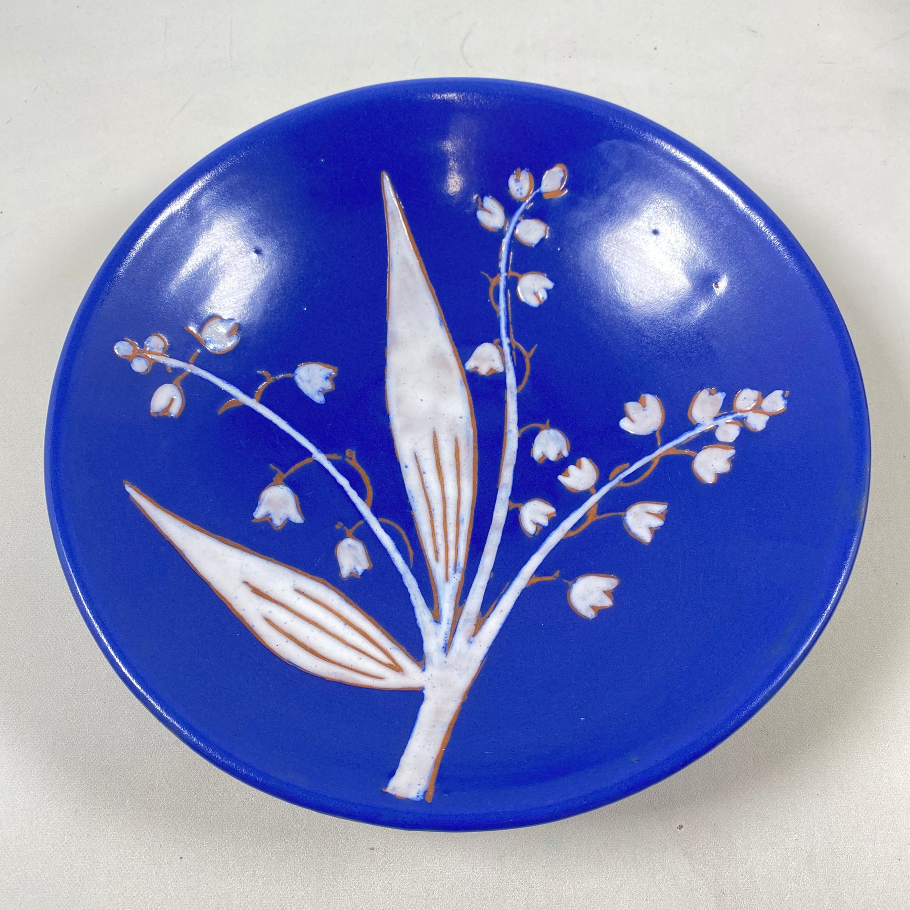 Blått handgjort keramikfat – med liljekonvaljmotiv 22cm