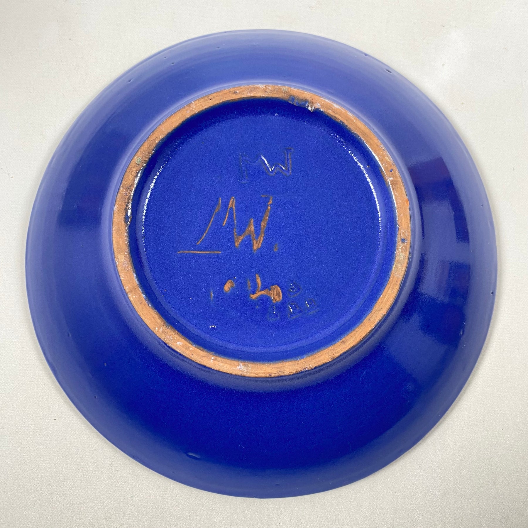 Denna dekorativa keramiktallrik framhäver ett distinkt och konstnärligt lila blommotiv mot en djupt blå bakgrund. Tillverkad och handmålad av den erkända konstnären, markerad av initialerna "AW". Denna tallrik är inte bara ett praktverk utan också ett stycke konsthistoria, perfekt för att pryda vilket hem eller samling som helst. Skicket är begagnat men välbevarat utan synliga skador.