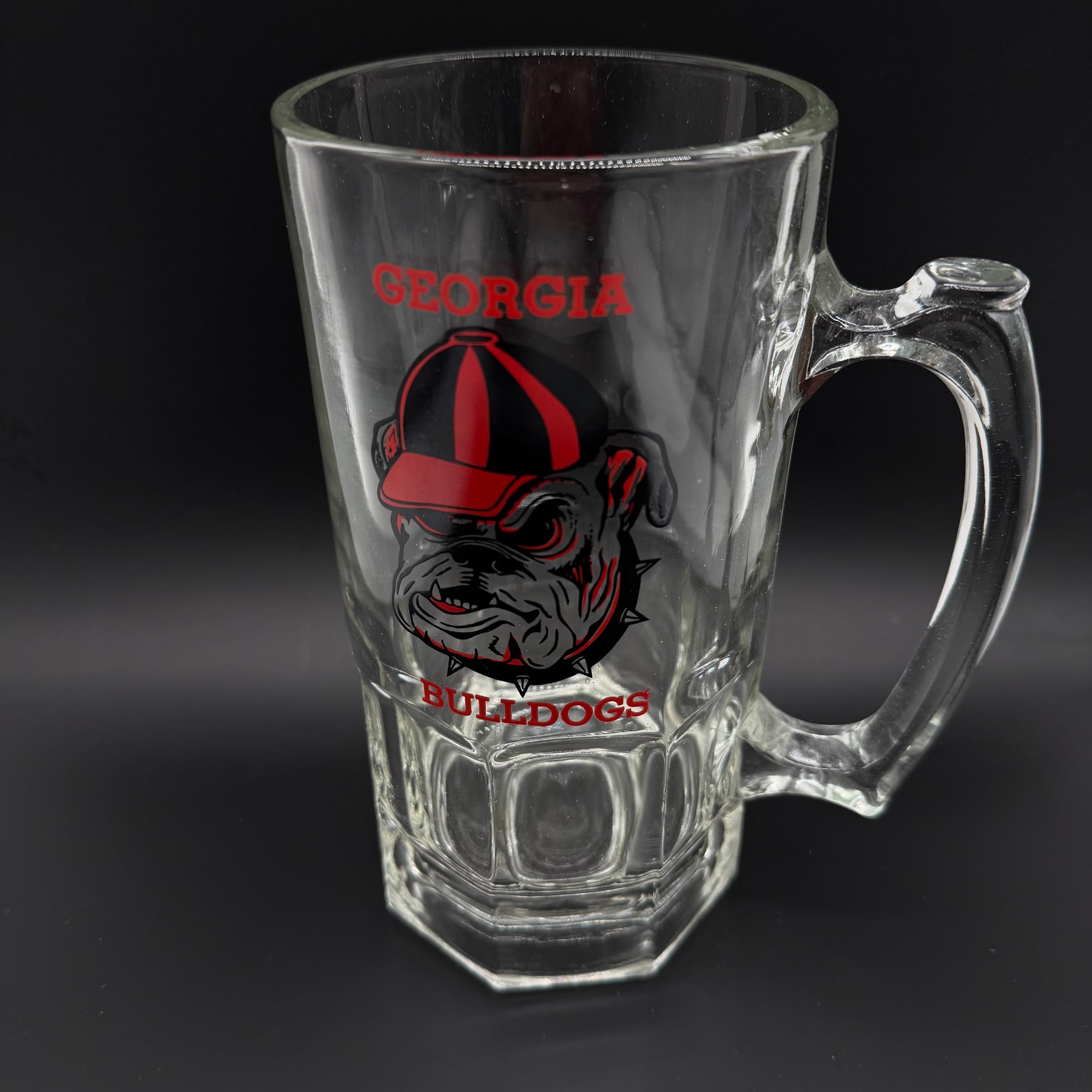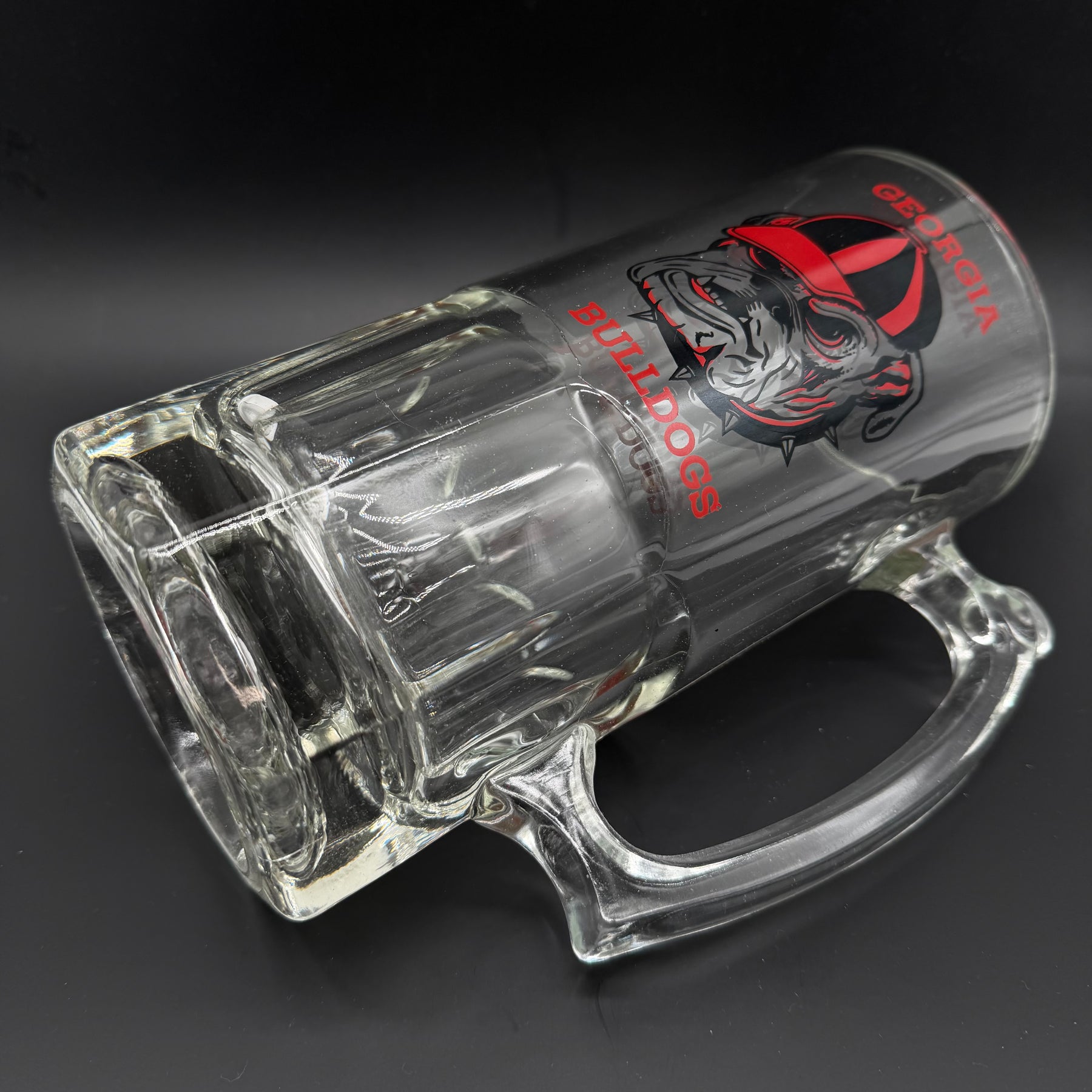 Denna ölsejdel pryds av Georgia Bulldogs emblem, perfekt för den sportintresserade samlaren. Den robusta glaskonstruktionen och det distinkta, färgrika trycket gör denna sejdel till en standout pjäs i varje samling. Sejdeln är begagnad men i mycket gott skick, vilket gör den till ett utmärkt tillägg för både användning och utställning.