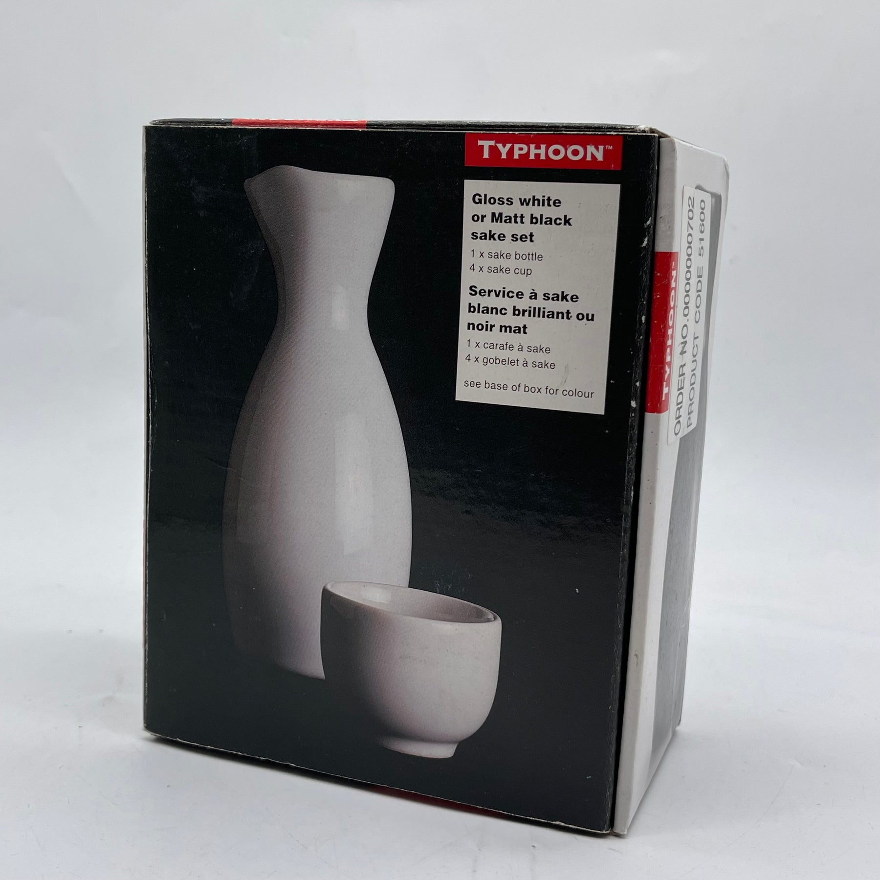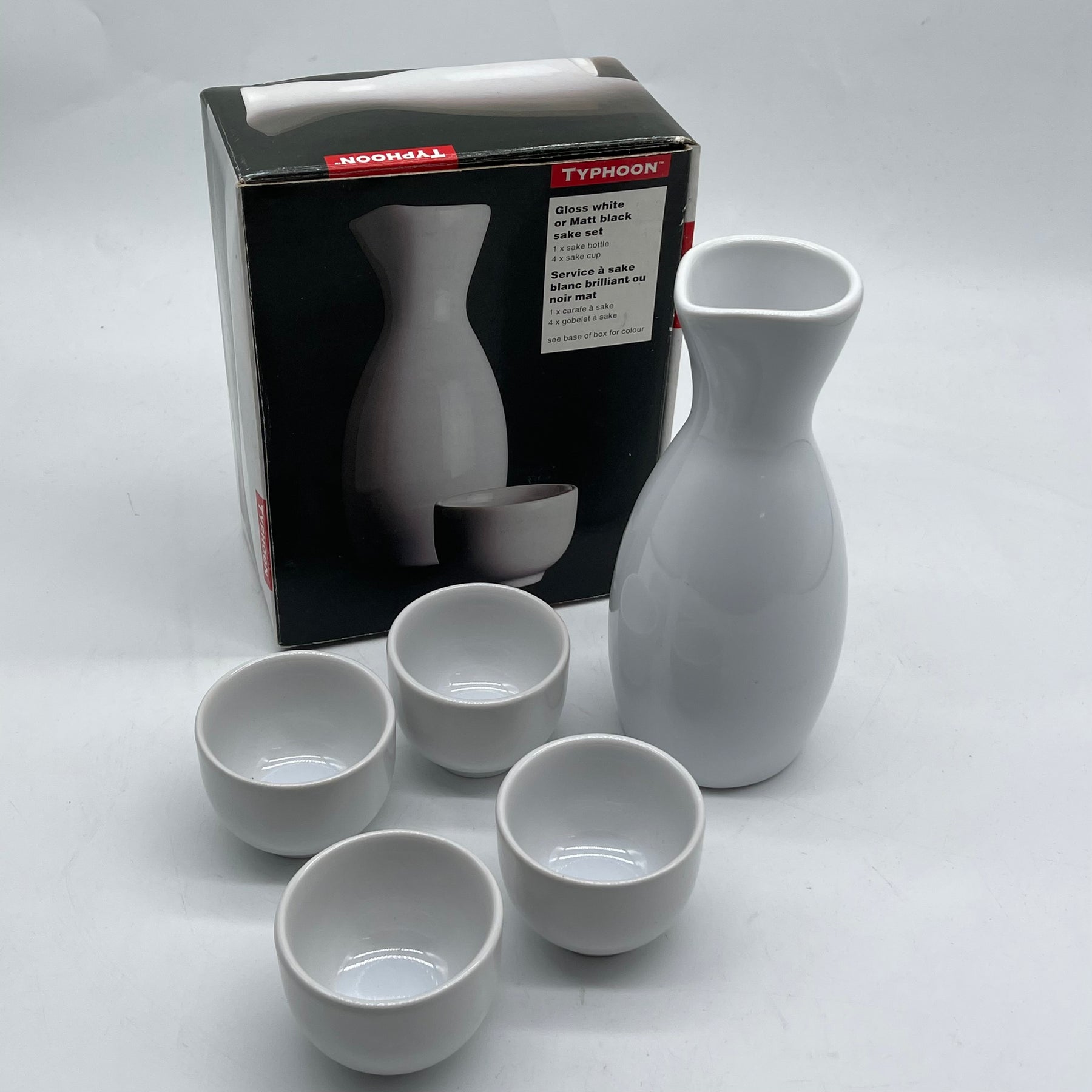 Denna stilrena uppsättning inkluderar en karaff och fyra tillhörande koppar, perfekt för att servera sake eller andra varma drycker. Tillverkad i högkvalitativ keramik med en matt vit finish, erbjuder setet en modern touch till din serveringskollektion. Setet är nytt och förblir i originalförpackningen vilket garanterar dess skick som oskadat och fläckfritt.