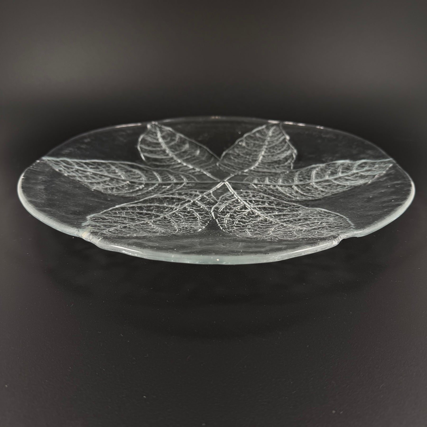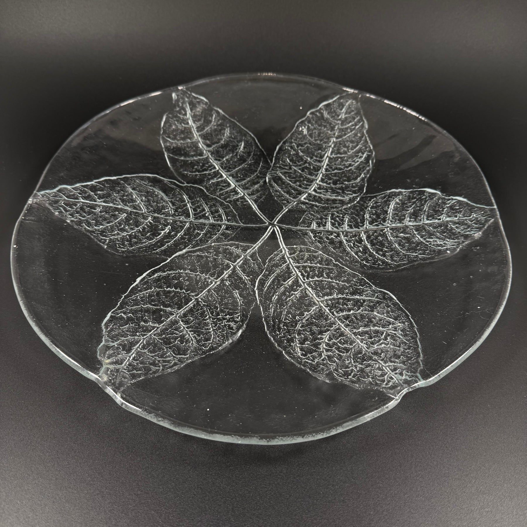 Denna unika kosta Boda glastallrik pryds av en vacker ingraverad lövdesign som skapar en tredimensionell känsla. Den är inte bara ett utmärkt konversationsstycke utan också praktisk som en dekorativ tallrik för till exempel frukt eller som en del av en dukning. Tallriken är begagnad men i mycket gott skick, utan synliga tecken på slitage och ger ett elegant intryck på varje bordsservering.