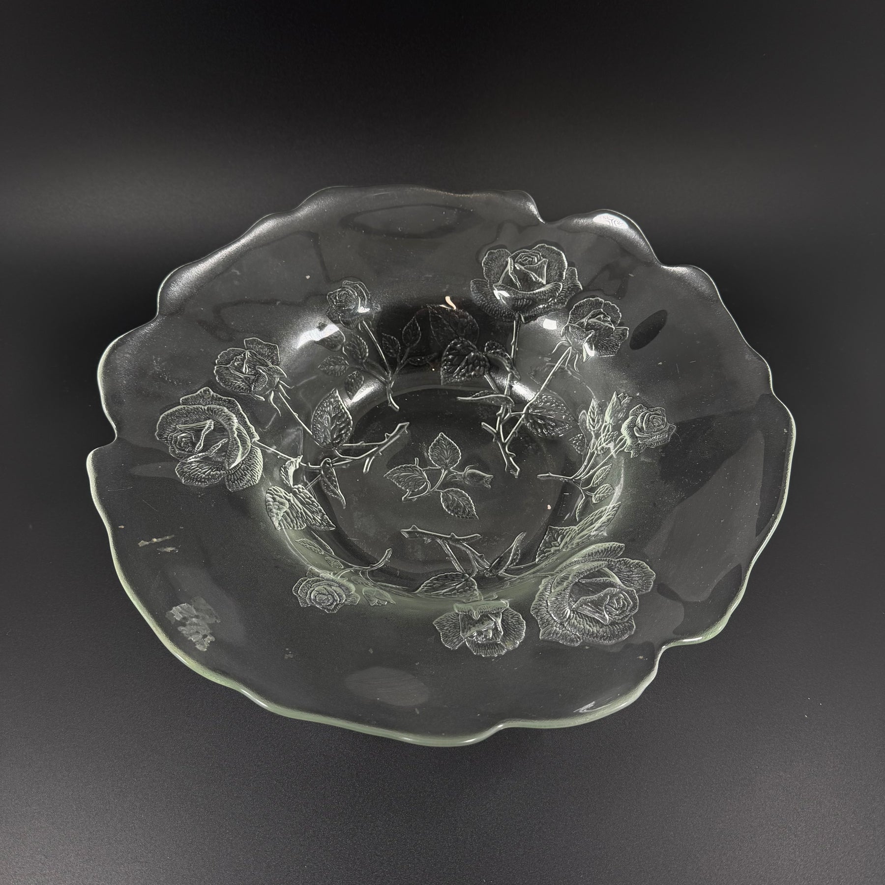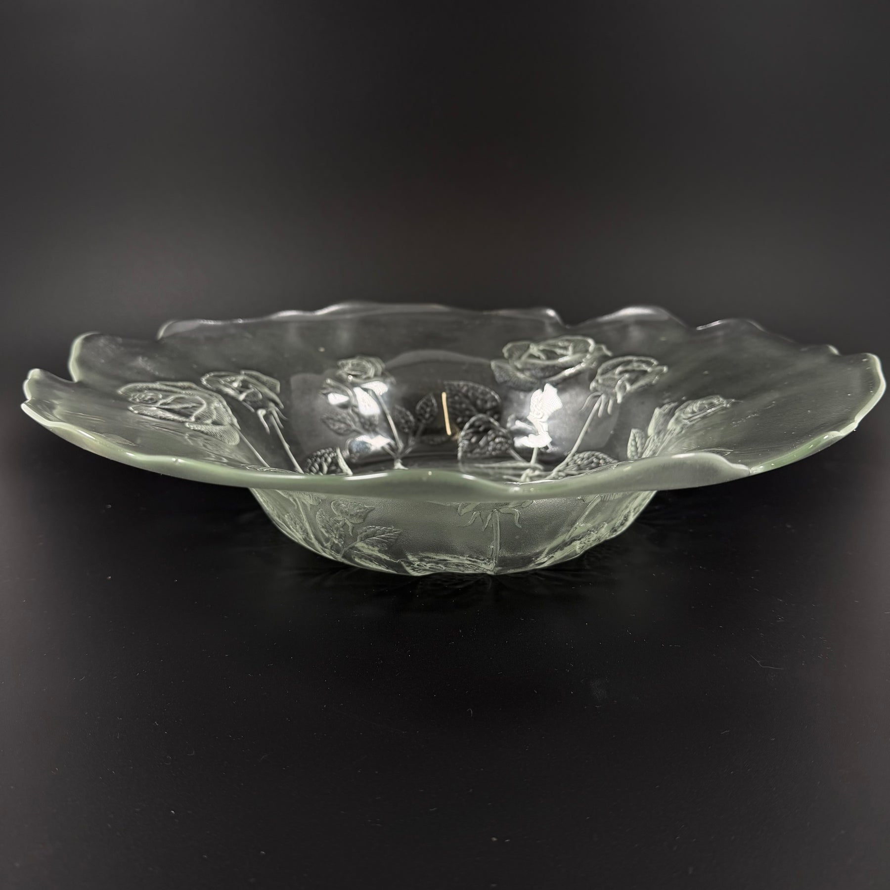 Ett stort dekorativt glasfat med vacker rosdekor och mjukt vågiga kanter. Passar fint som fruktfat, serveringsfat eller som en elegant dekoration på bordet. Klassisk och tidlös design. Trots att den är begagnad.