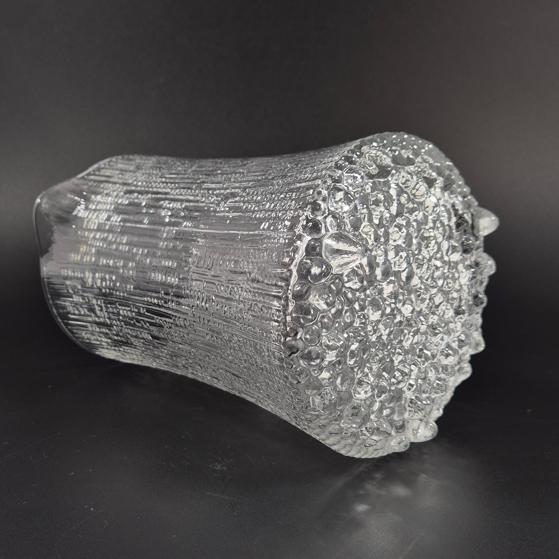 Detta är en dekorativ glasbringare med tydlig reliefstruktur som ger ett vackert ljusspel och bra grepp. Perfekt för att servera vatten, saft eller drinkar vid både vardag och fest, och lika fin som inredningsdetalj på hyllan. Begagnad men i mycket gott skick med endast lätta bruksspår.