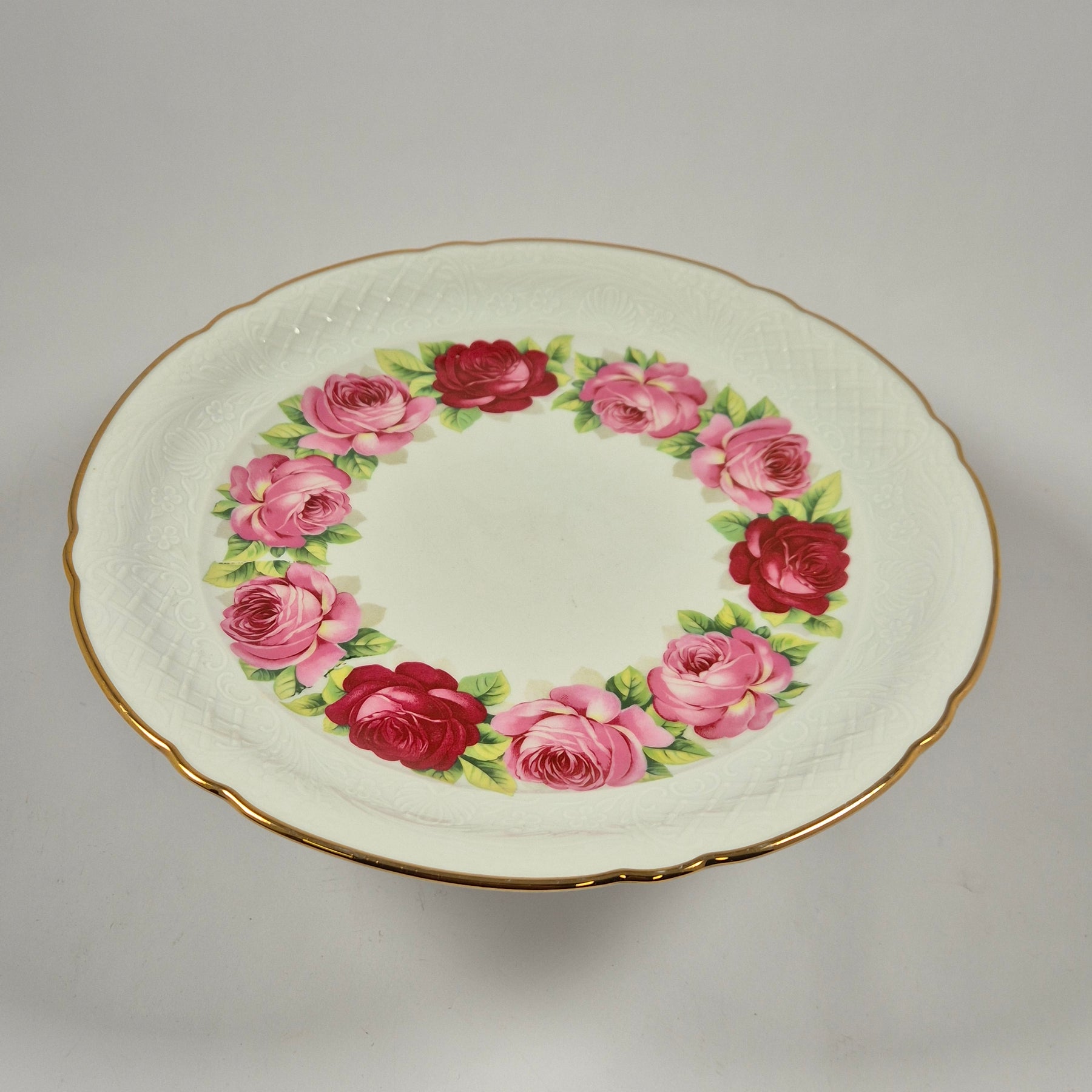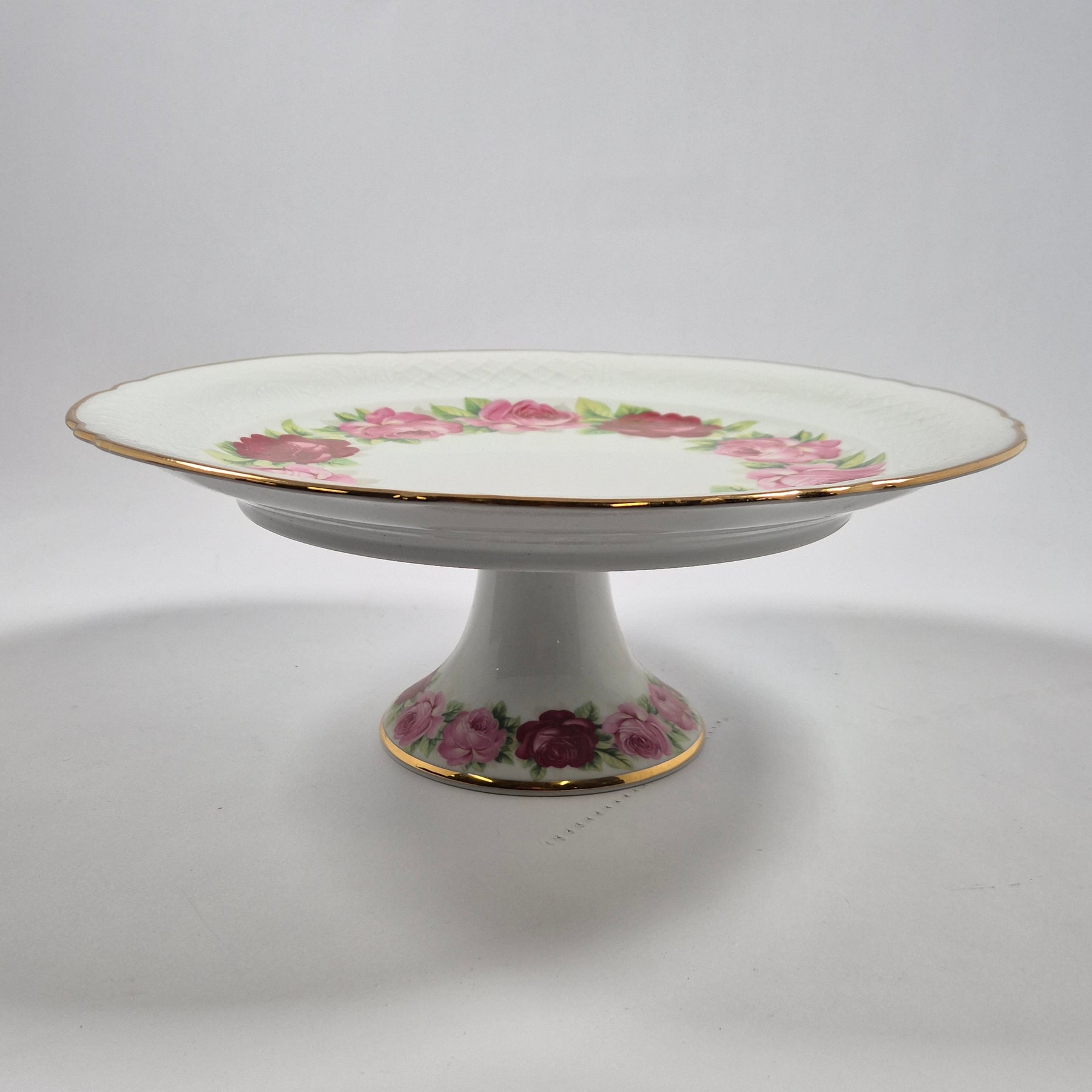 Elegant kakfat på fot i fin porslin från Schumann Arzberg Bavaria med romantiskt rosdekor och guldkant – ett riktigt retrofynd till fikastunden.