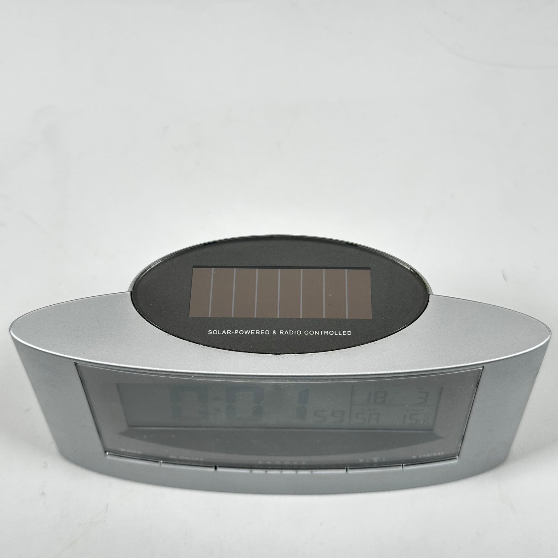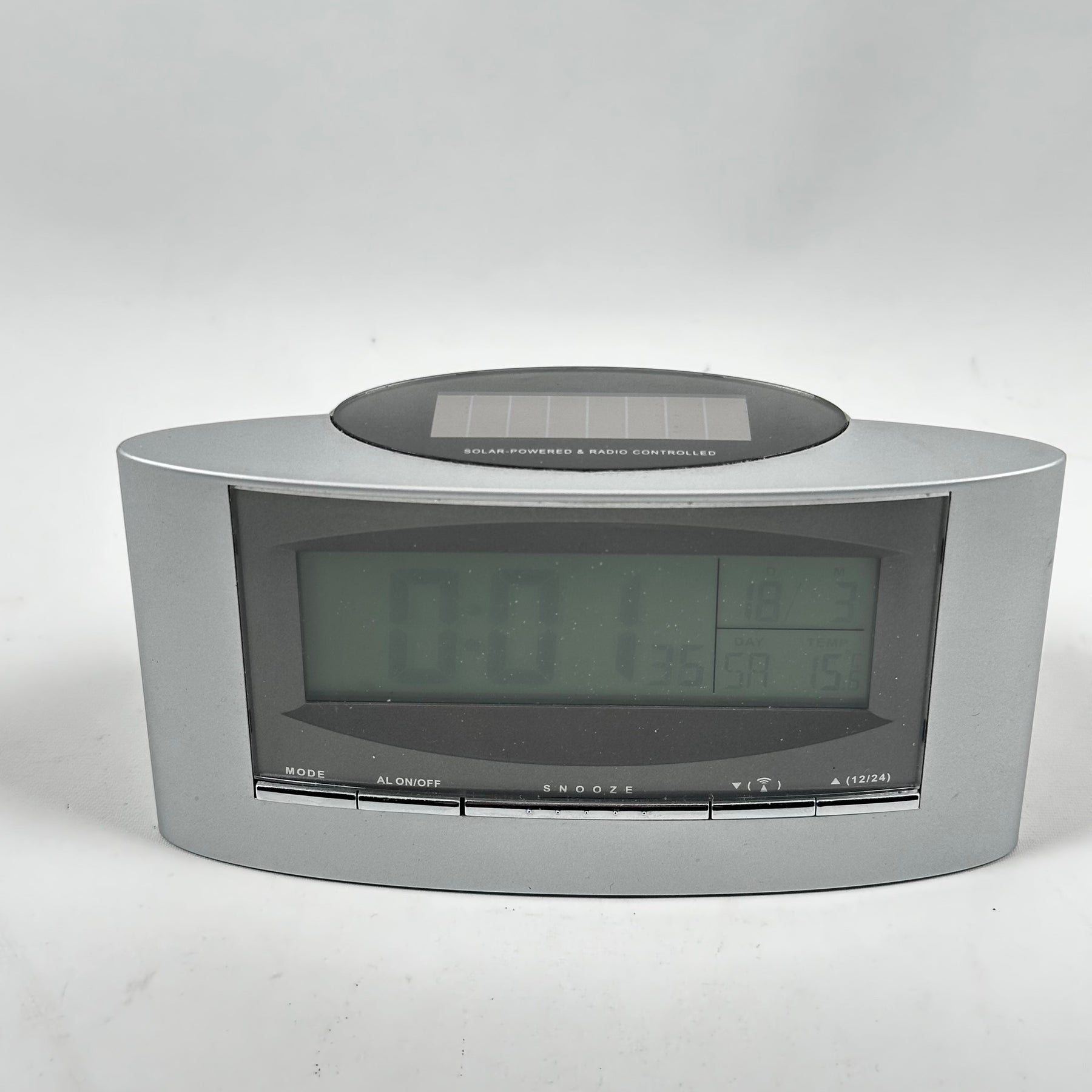Denna snygga väckarklocka är inte bara praktisk utan också miljövänlig tack vare dess solcellsdrivet system. Den är utrustad med funktioner som radiostyrd tid och inbyggd temperaturmätare, vilket gör den perfekt för den teknikintresserade eller miljömedvetna köparen. Trots att den är använd, är den i mycket gott skick och kommer att addera både funktionalitet och stil till vilket rum som helst.