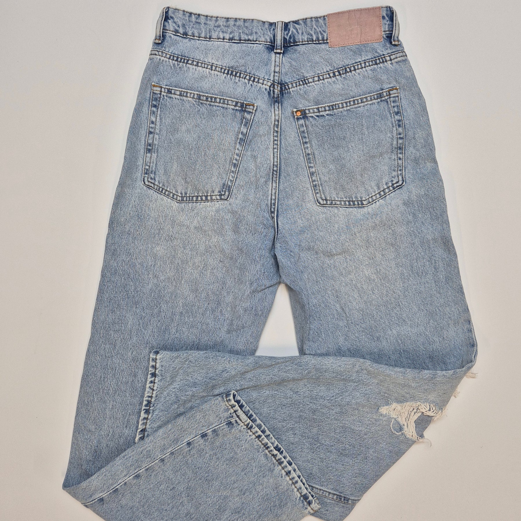Dessa jeans är inte bara bekväma men också stilfulla med sin höga midja och raka passform som ger en avslappnad silhuett. De har en distinkt design med nötta och slitna detaljer som lägger till en ungdomlig och kaxig touch. I utmärkt skick, dessa jeans är ett måste för alla som uppskattar en modern twist på klassisk denim.Produktspecifikationer