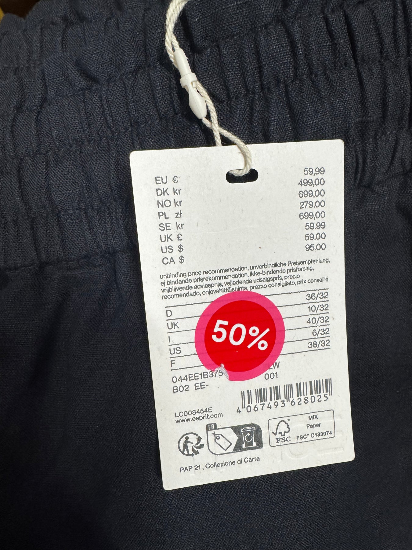 Dessa trendiga svarta vida byxor är designade av det välkända märket Esprit. De är tillverkade i ett lättviktsmaterial, vilket gör dem perfekt för såväl vardag som fest. Byxorna har en elastisk midja med dragsko, vilket garanterar en bekväm och justerbar passform. De är oanvända med originalmärken kvar och erbjuds till ett attraktivt pris.Produktspecifikationer