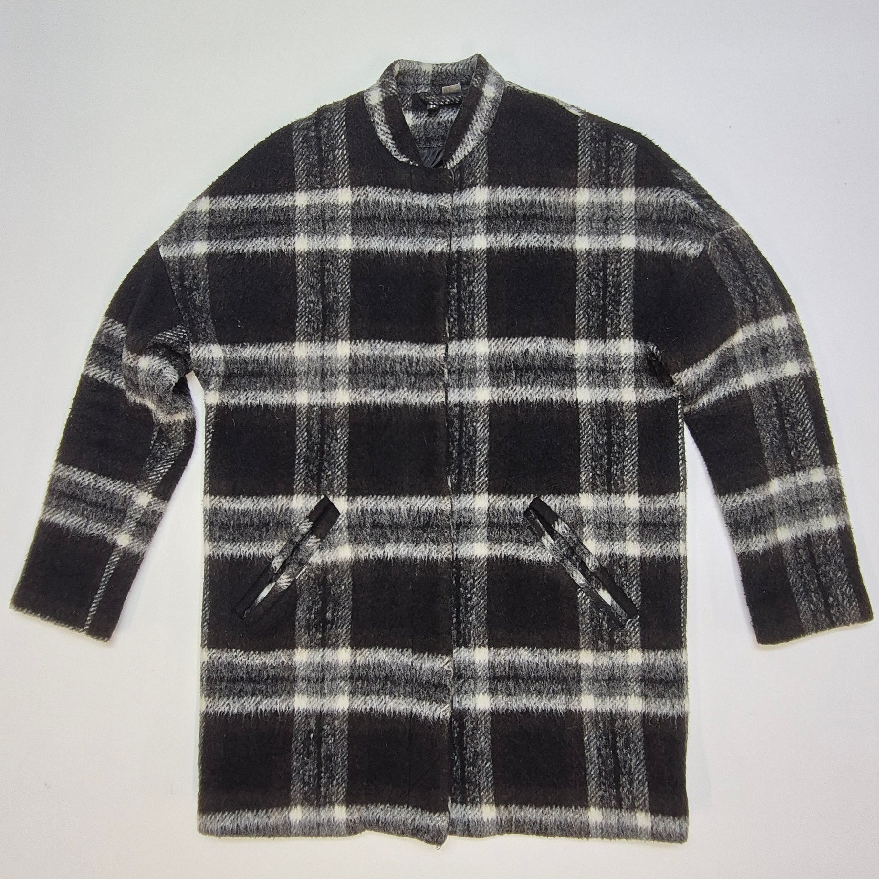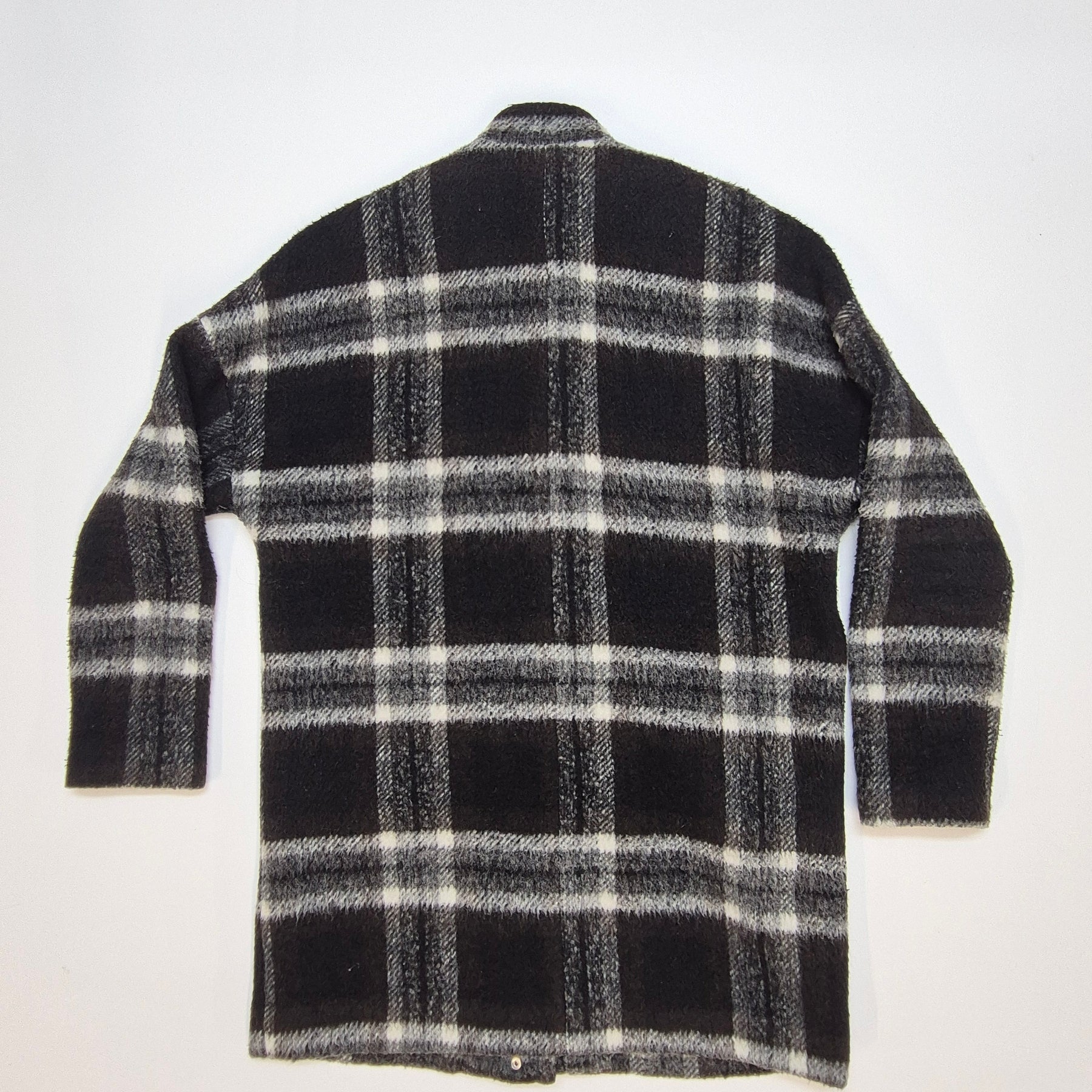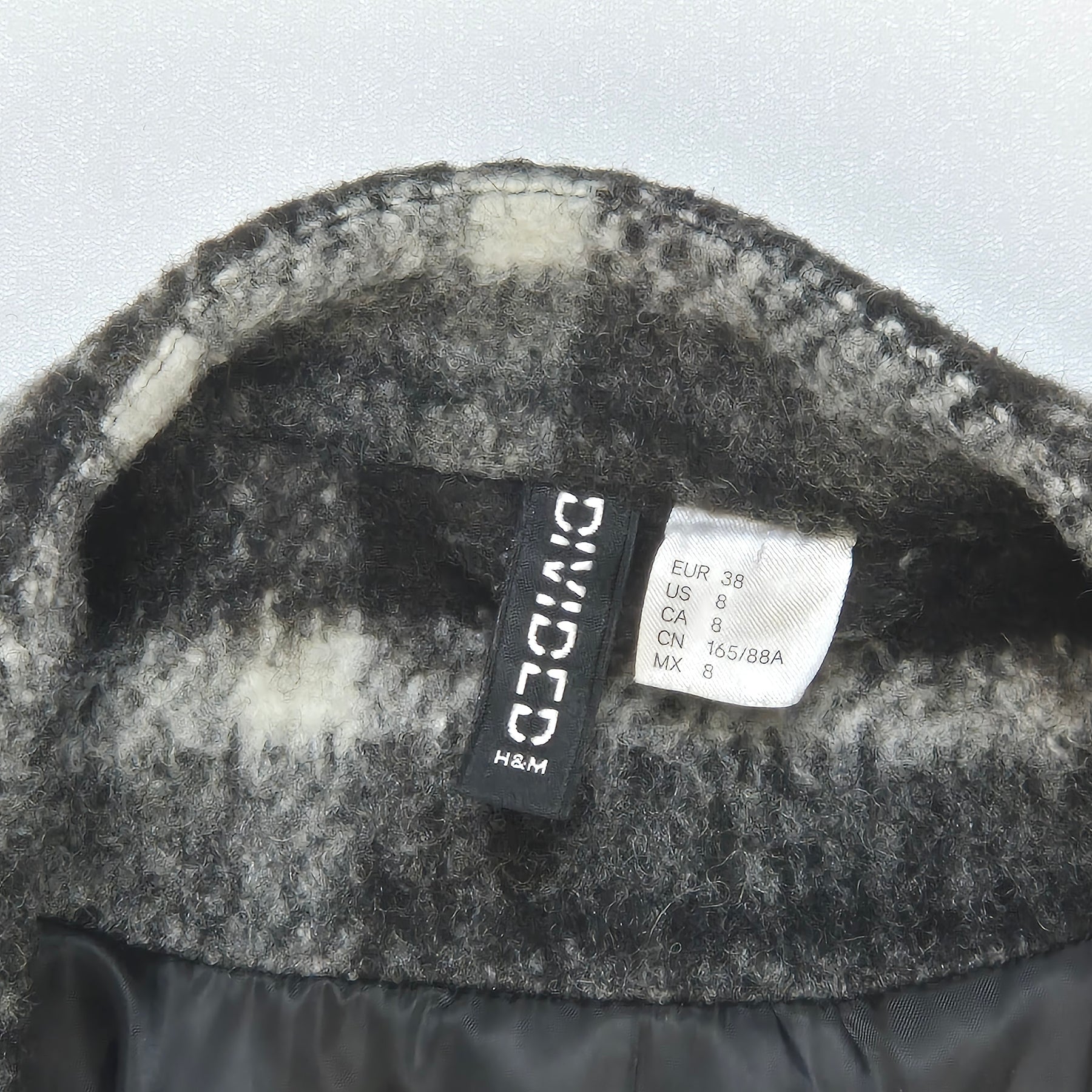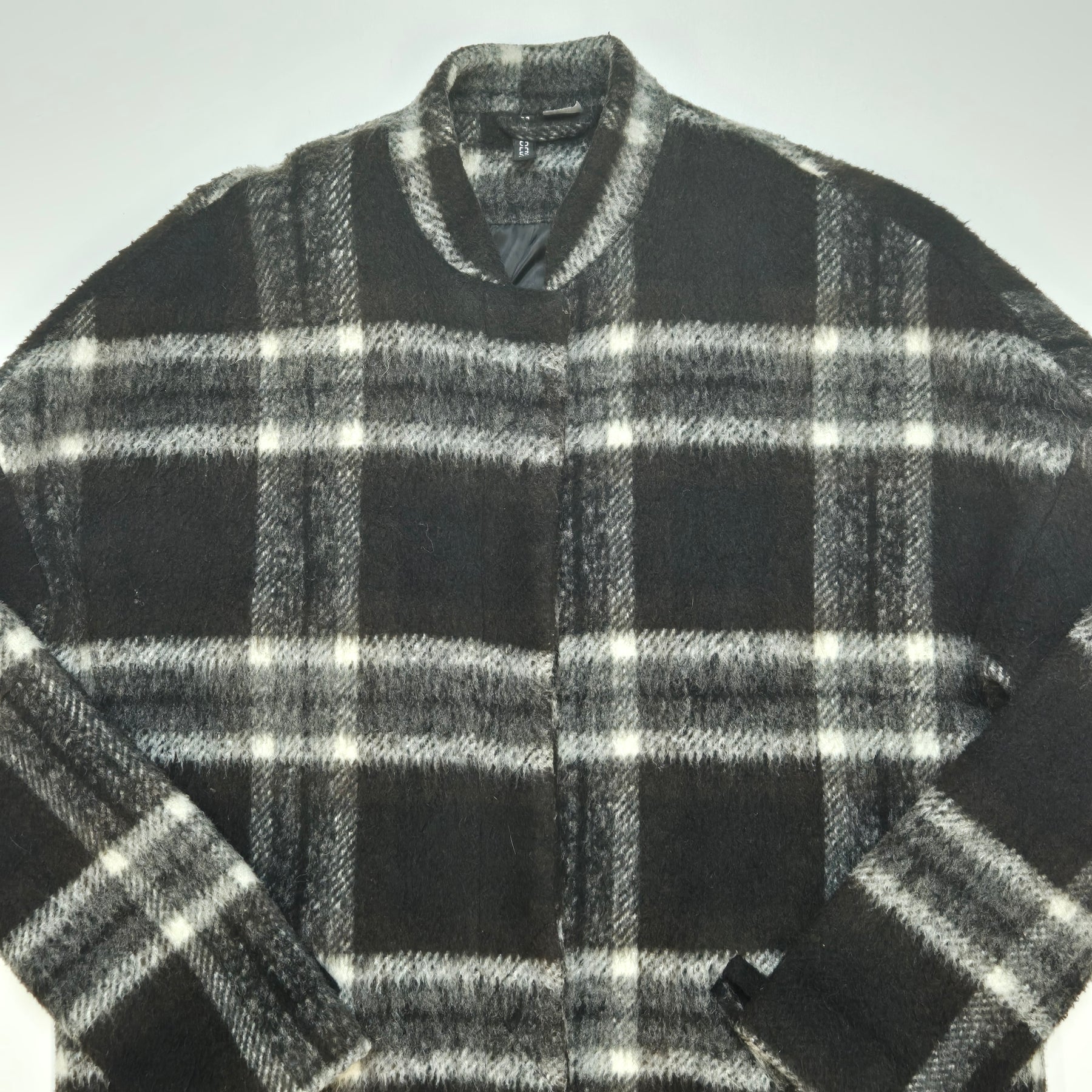 Detta är en trendig plädjacka från H&M i klassiskt svart och vitt mönster, idealisk för kyliga dagar. Jackan är utrustad med två praktiska fickor och en mjuk, värmande innerfoder. I mycket gott skick, den här jackan kombinerar funktionalitet med tidlös stil för den modeintresserade.