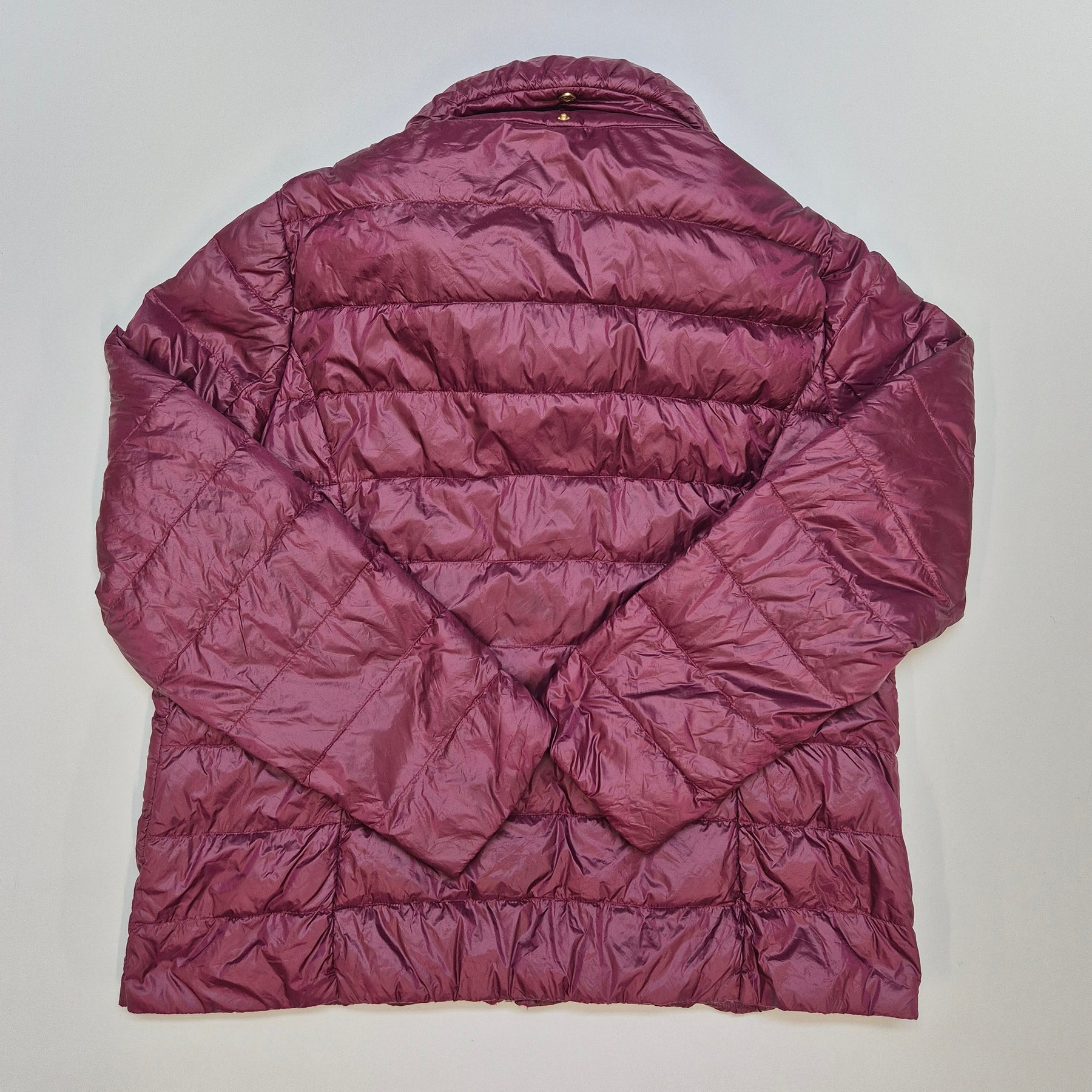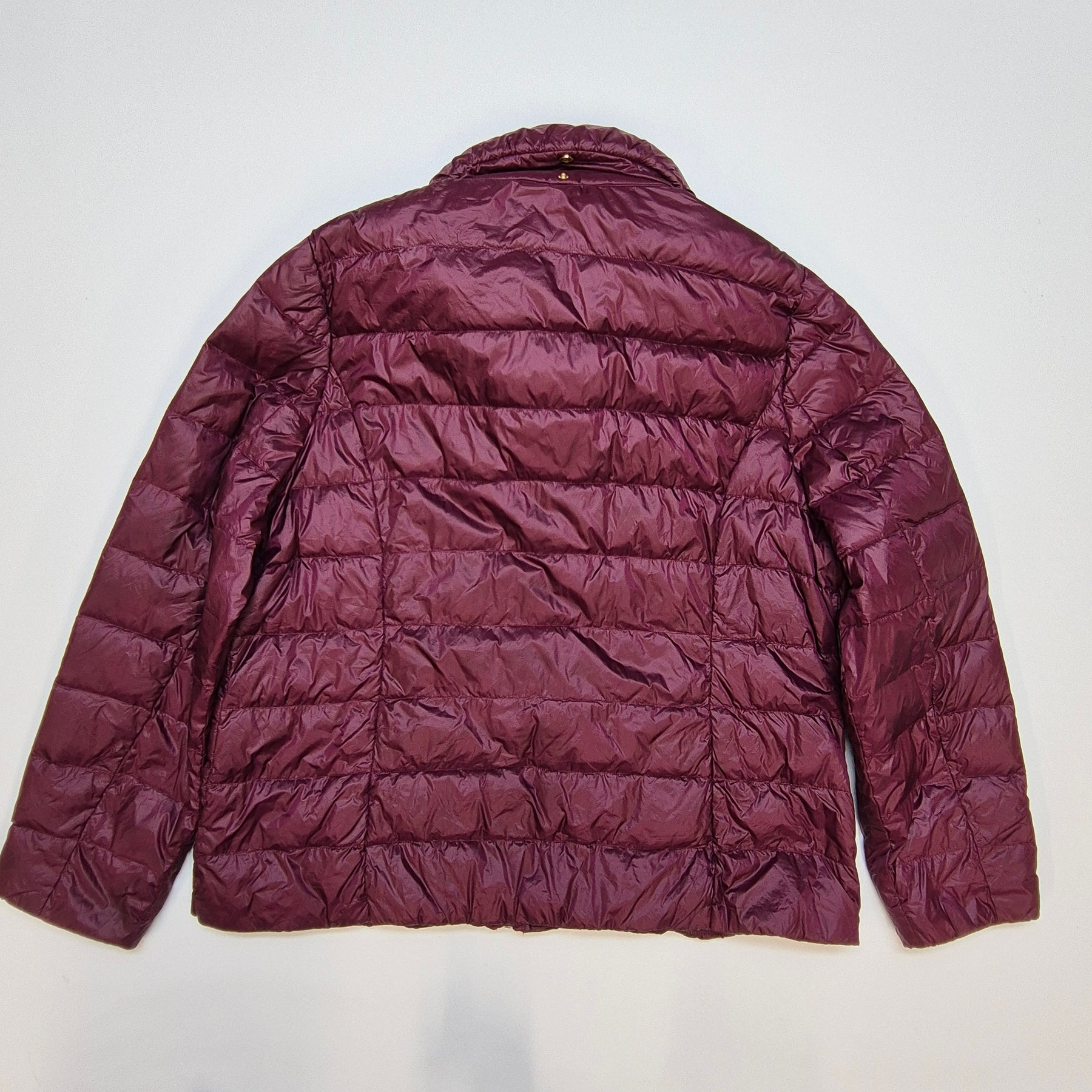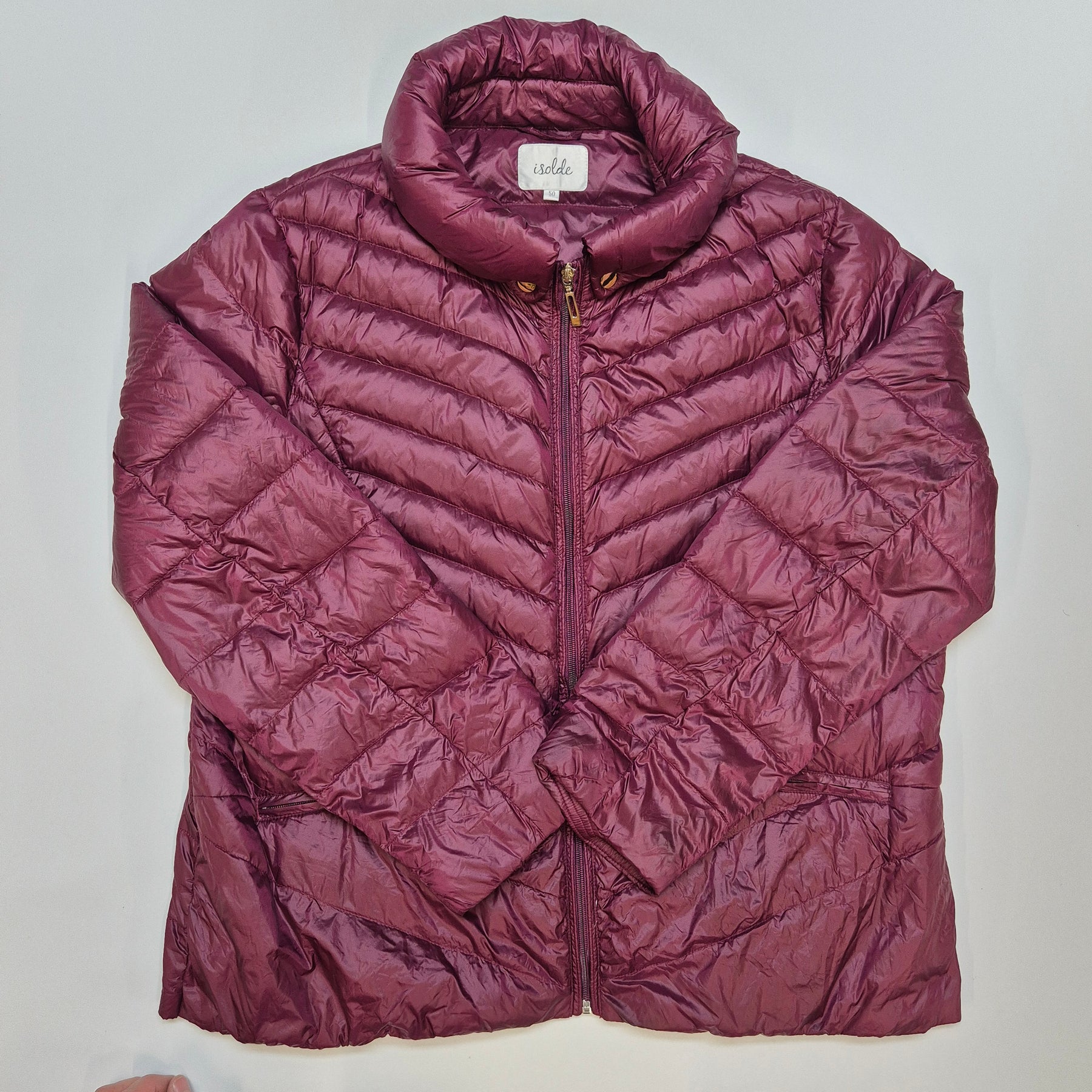Denna vinröda damjacka från Isolde kombinerar stil och funktionalitet i ett kompakt format. Den har en trendig quiltad design och guldtonade dragkedjor som adderar en lyxig touch till din garderob. Jackan är idealisk för övergångsperioderna och erbjuder både värme och komfort. Skicket är begagnat men i mycket gott skick, vilket gör den till ett smart köp för mode- och miljömedvetna konsumenter.Produktspecifikationer