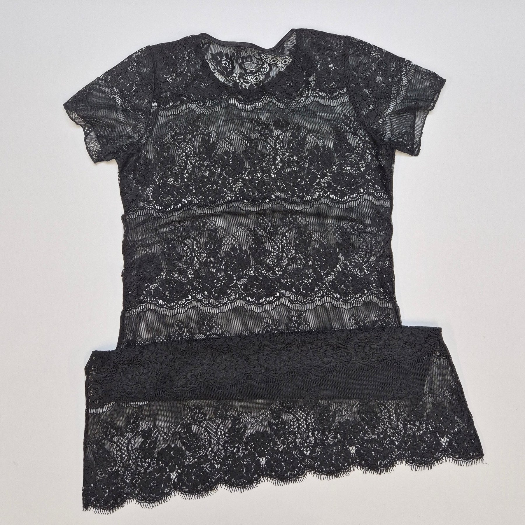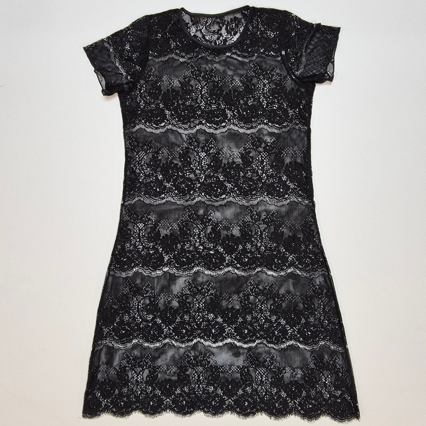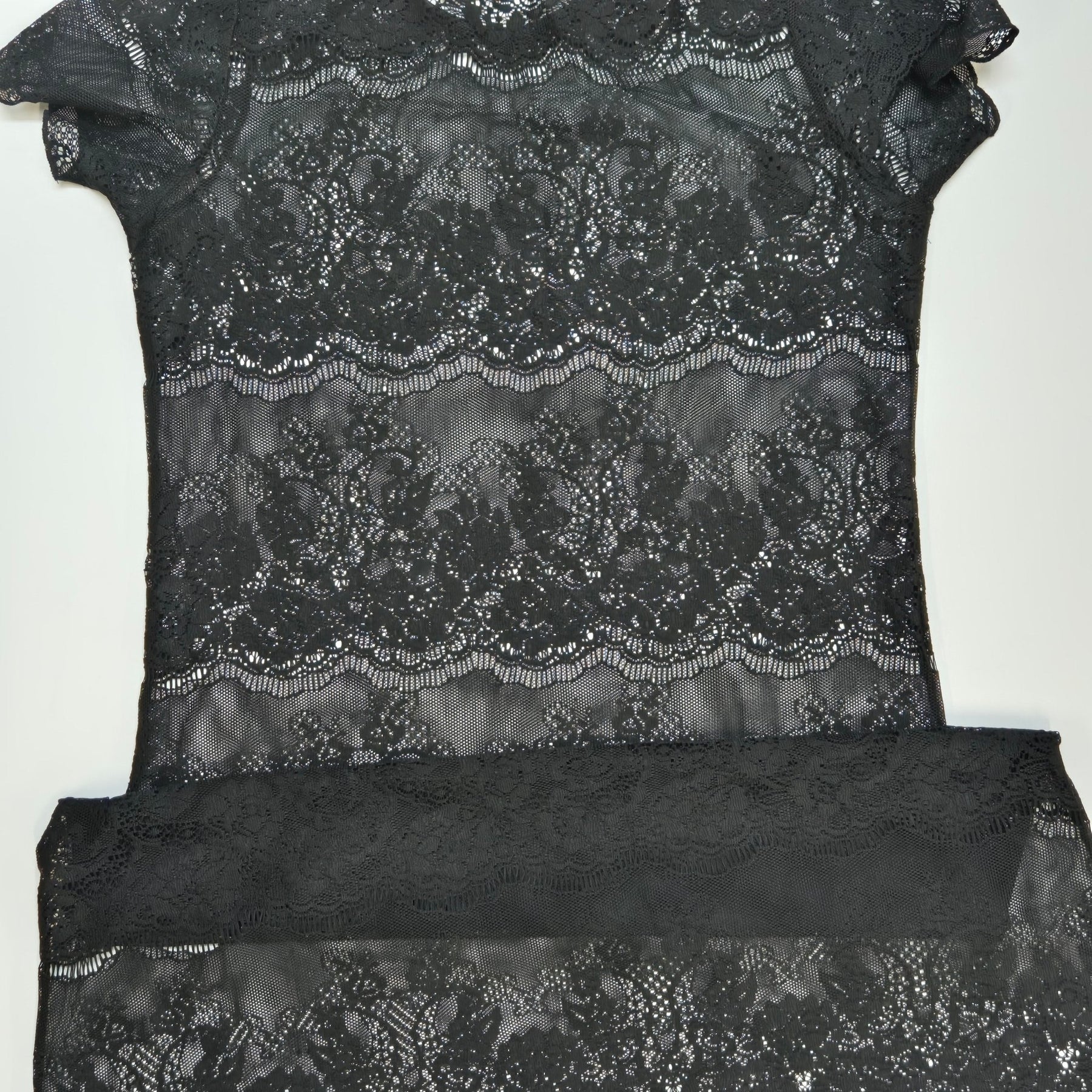 Denna kvinnliga svarta klänning är gjord av fin detaljerad spets som skapar en sofistikerad och förförisk look. Klänningen är kortärmad och utformad med ett mönster av genombrutna blommor som ger en unik charm. Perfekt för speciella tillfällen eller en elegant kväll ute. Klänningen är begagnad men i mycket gott skick.3. Produktspecifikationer