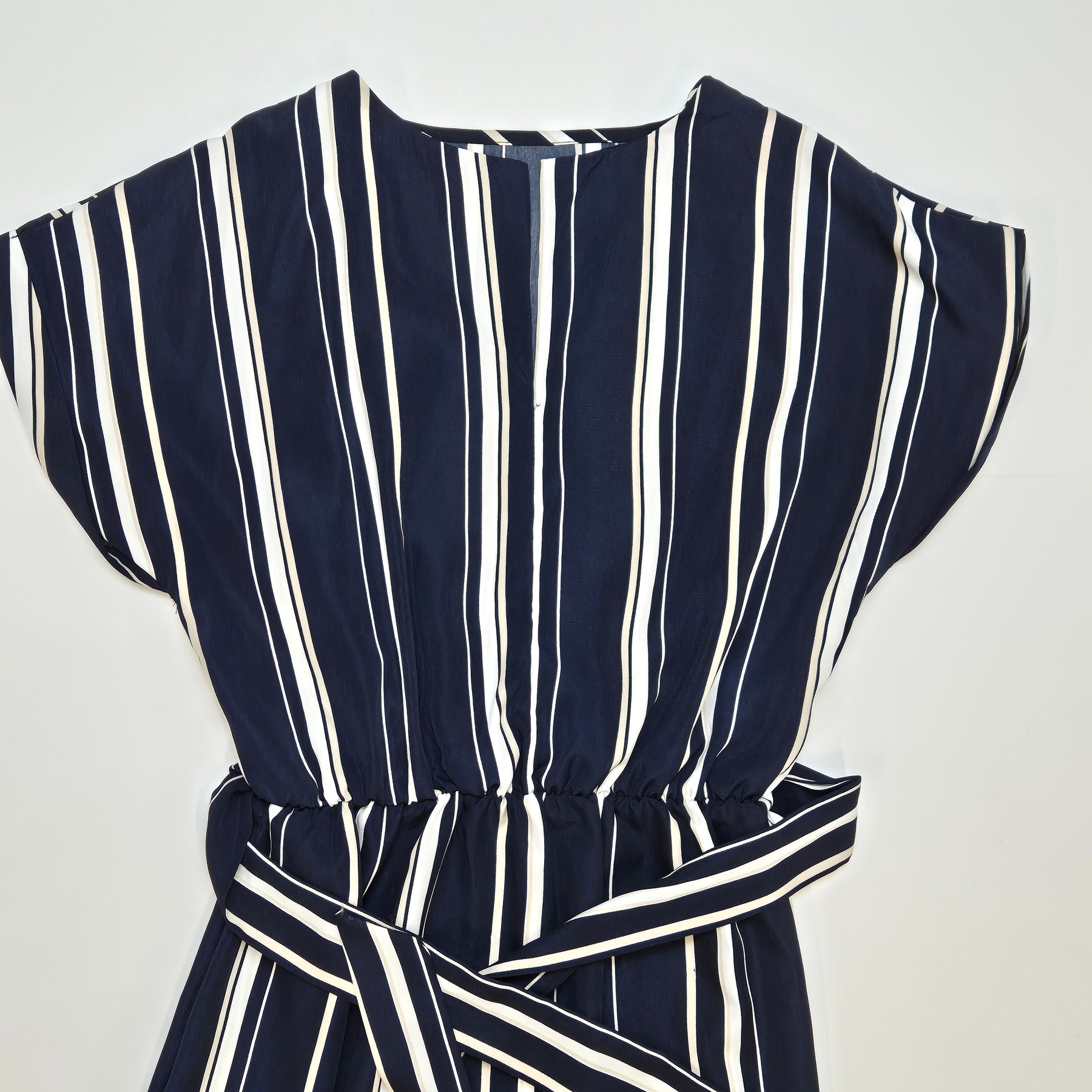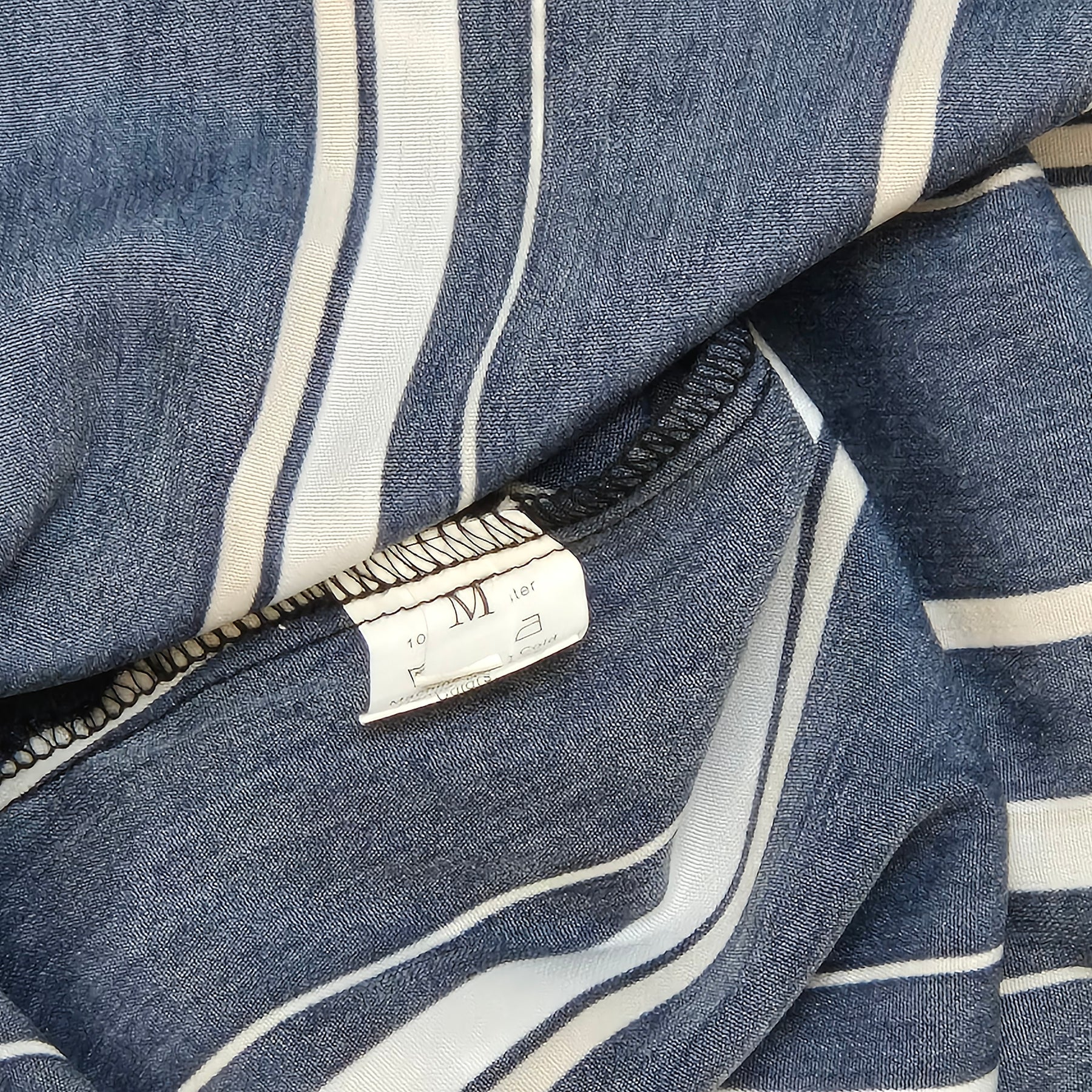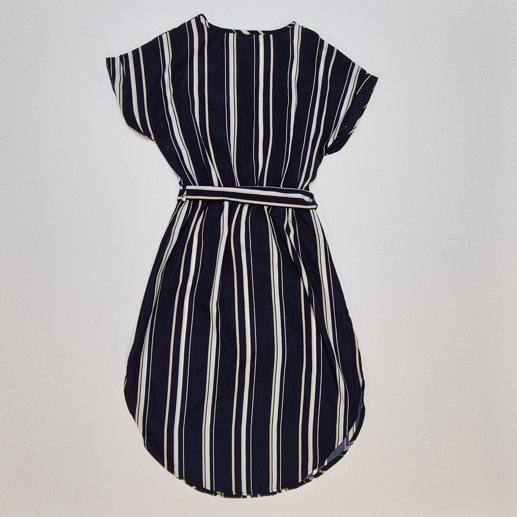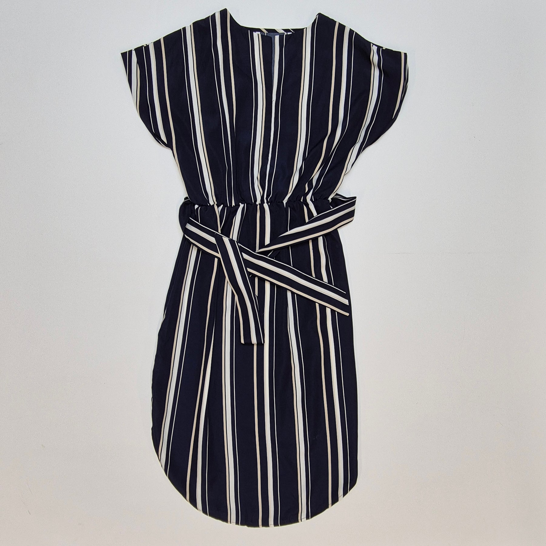 Denna charmiga klänning är tillverkad i en klassisk marinblå färg med vita och ljusblå ränder, vilket skapar en stilren och modern look. Klänningen är från märket "Zara" och designad med en avslappnad passform och skärp i midjan för att framhäva silhuetten. Den är idealisk för såväl formella som informella tillfällen och är i mycket gott skick.Produktspecifikationer