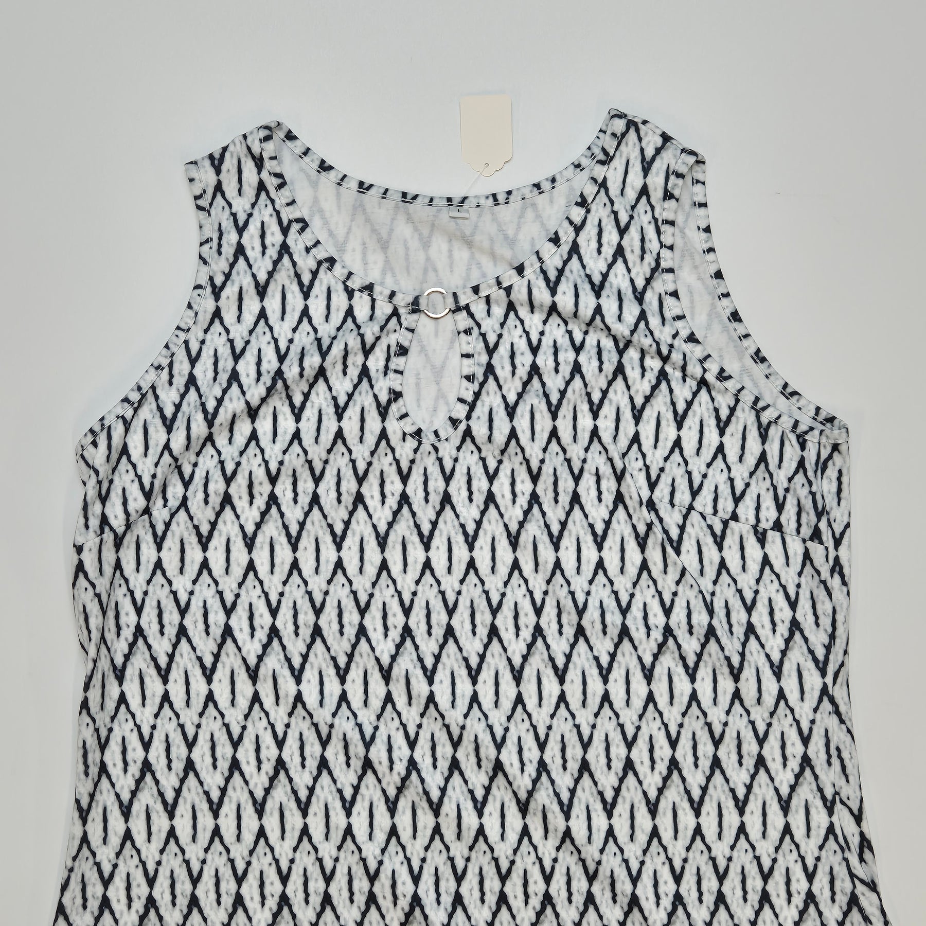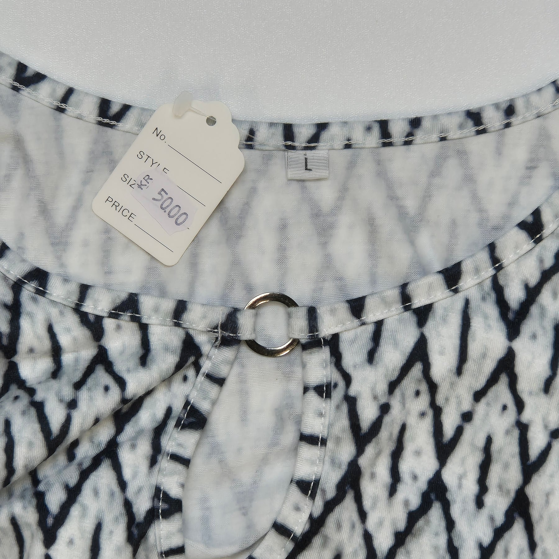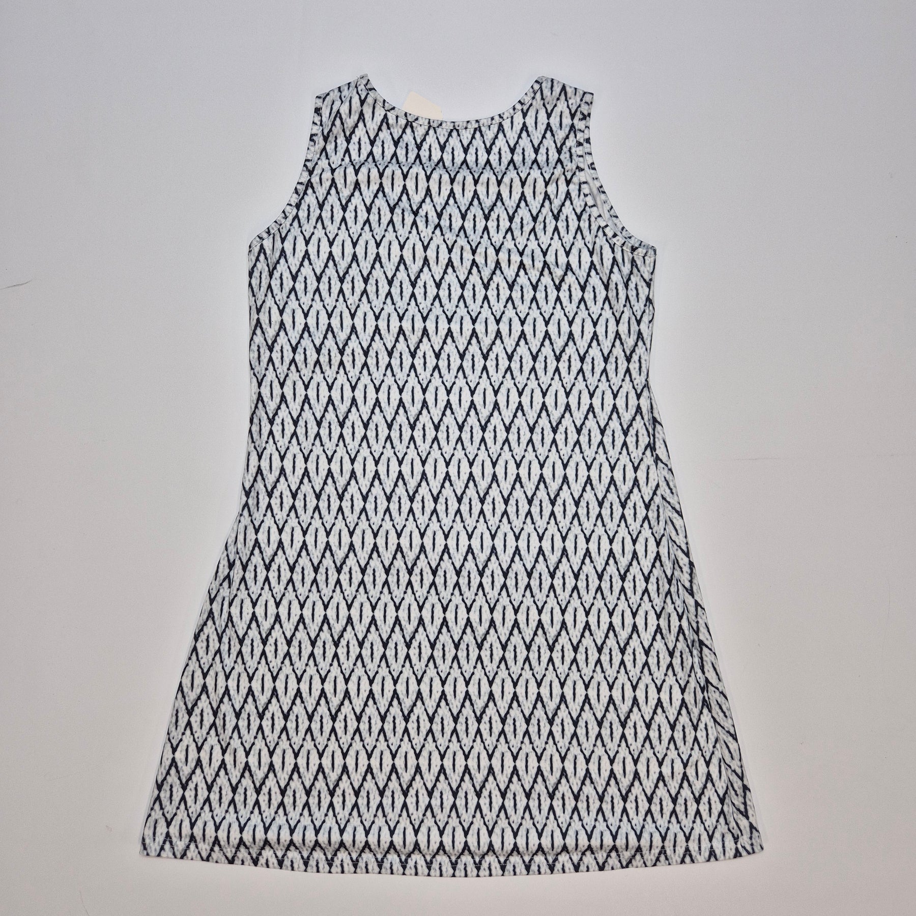 Denna eleganta klänning i ett ikoniskt svartvit mönster kombinerar klassisk design med en modern twist. Klänningen har en a-linjeformad silhuett som passar de flesta kroppstyper och är detaljerad med en dekorativ metallring vid halsen. Perfekt för både vardag och speciella tillfällen. Klänningen är begagnad men i mycket gott skick, vilket gör den till ett hållbart val.
