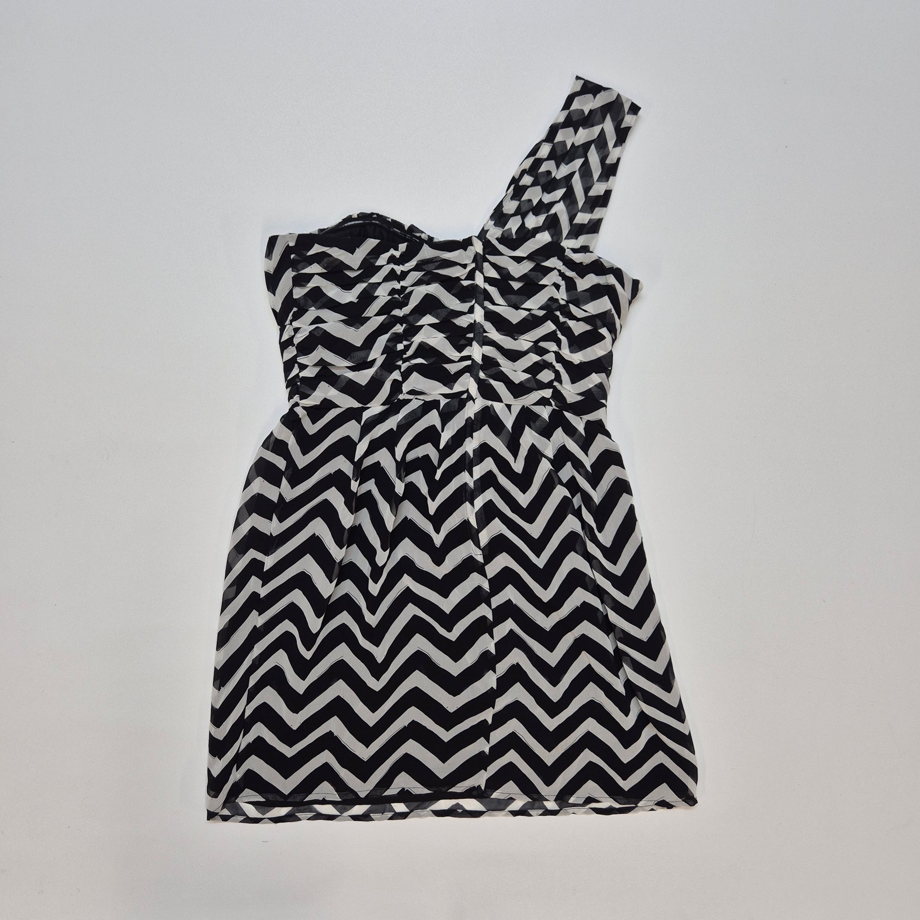 Denna trendiga klänning har en distinkt svart-vit zigzagmönster och en asymmetrisk one-shoulder design som skapar en elegant och modern silhuett. Märket H&M är välkänt för dess hållbara och stilsäkra mode. Klänningen är tillverkad i en bekväm bomullsblandning, är lätt att sköta och passar utmärkt för såväl festliga som mer formella sammanhang. Den är begagnad men i mycket gott skick vilket gör den till ett både smart och miljövänligt val.