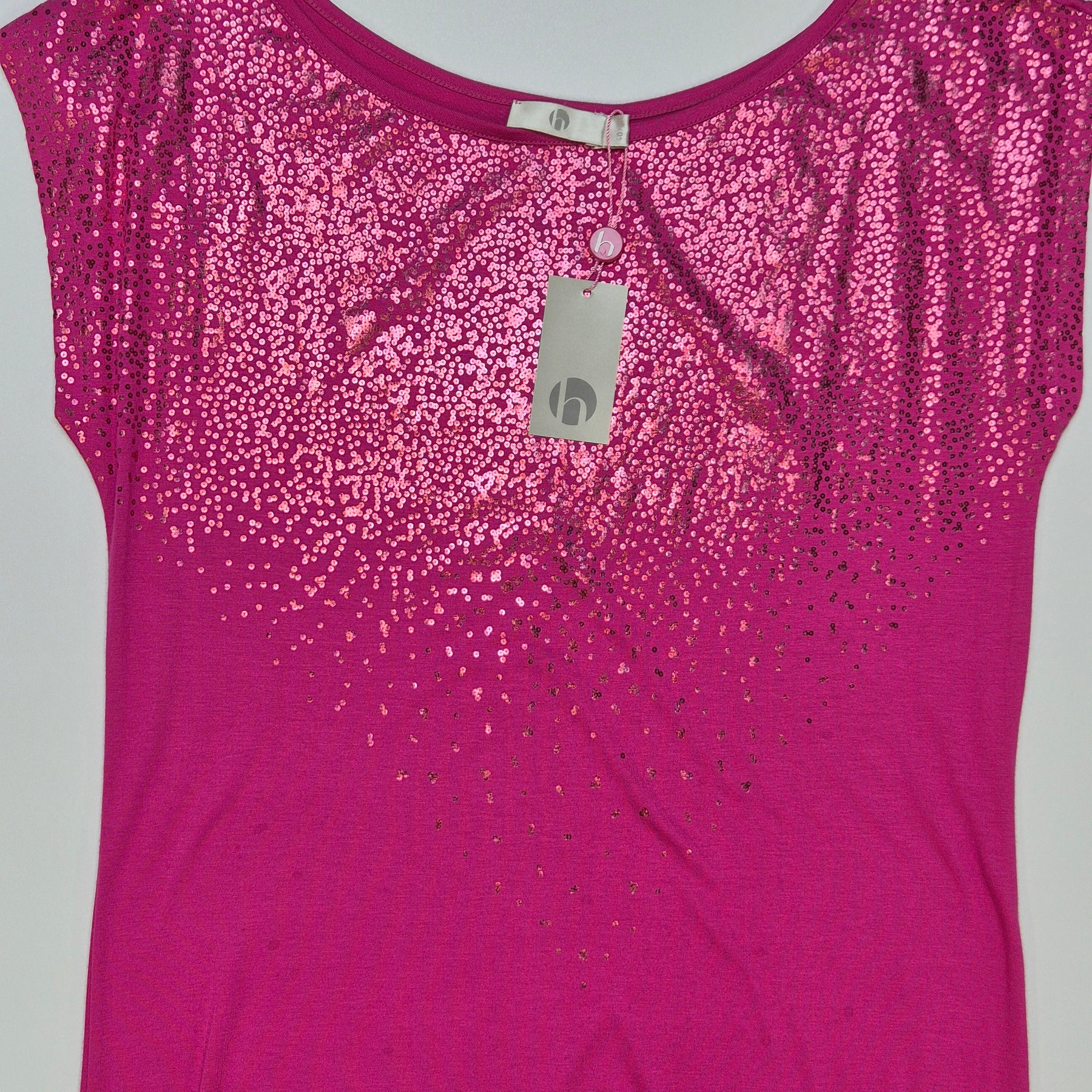 Denna unika magenta klänning präglas av dess glittrande paljettdetaljer som skapar en iögonfallande look. Tillverkad av Homy, är detta plagg perfekt för både festliga tillställningar och vardagligt bruk. Den är begagnad men i mycket gott skick, vilket gör den till ett hållbart och modeinriktat val.