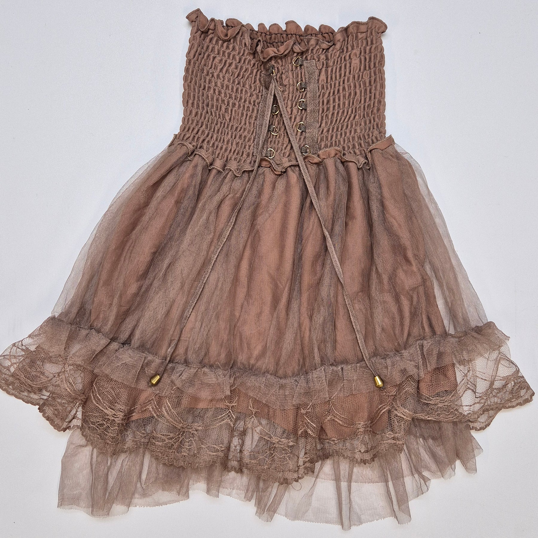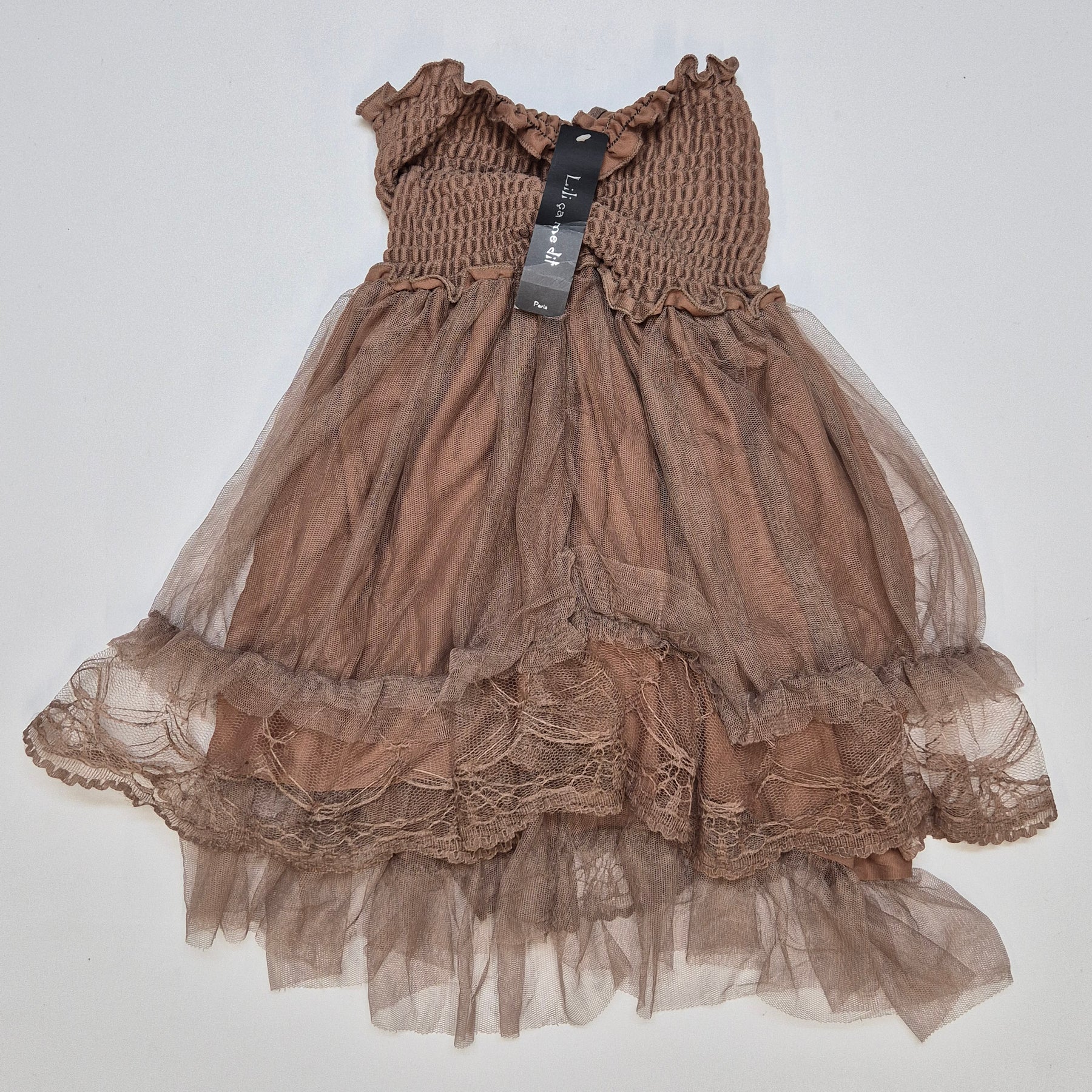 Denna underbara klänning kommer i en varm brun ton och har en fantastiskt romantisk design. Livdelen är smockad och elastisk för bekväm passform, och kjolen består av flera lager mjuk tyll med spets- och volangdetaljer som ger en fluffig och elegant siluett.