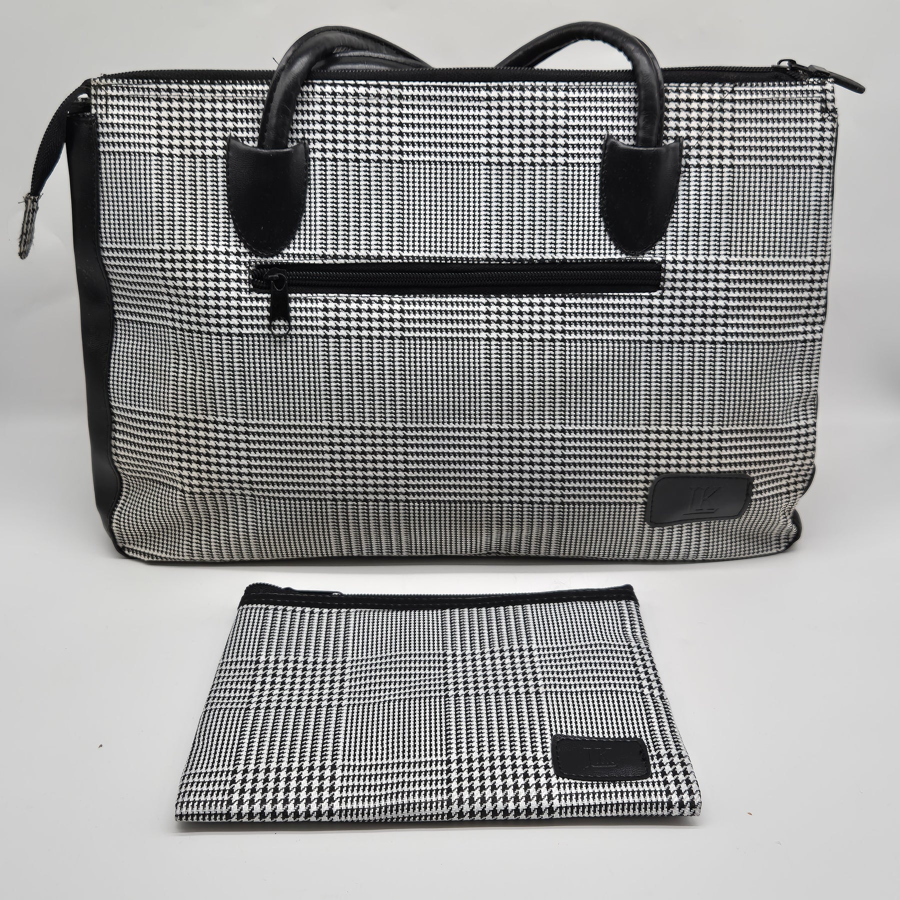 Denna eleganta väskduo inkluderar en rymlig datorväska och en praktisk plånbok, perfekt för den professionella vardagen. Båda är utsmyckade med ett klassiskt pied-de-poule-mönster och detaljer i svart skinnimitation som tillför en modern touch. Väskan är utrustad med välorganiserade fack som gör det enkelt att hålla ordning på dina saker. Plånboken är kompakt men rymlig nog för de nödvändigaste korten och kontanterna. Båda produkterna är begagnade men i mycket gott skick, vilket gör dem till ett ansvarsfullt och stiligt val.Kategori | Väskor & plånböcker |