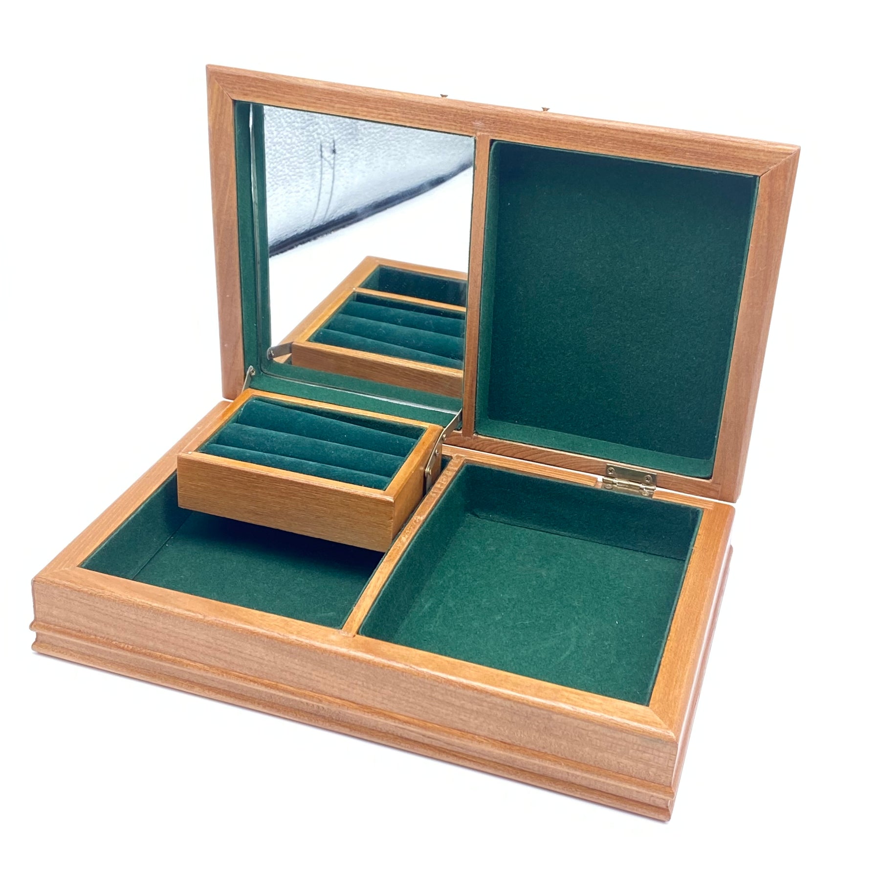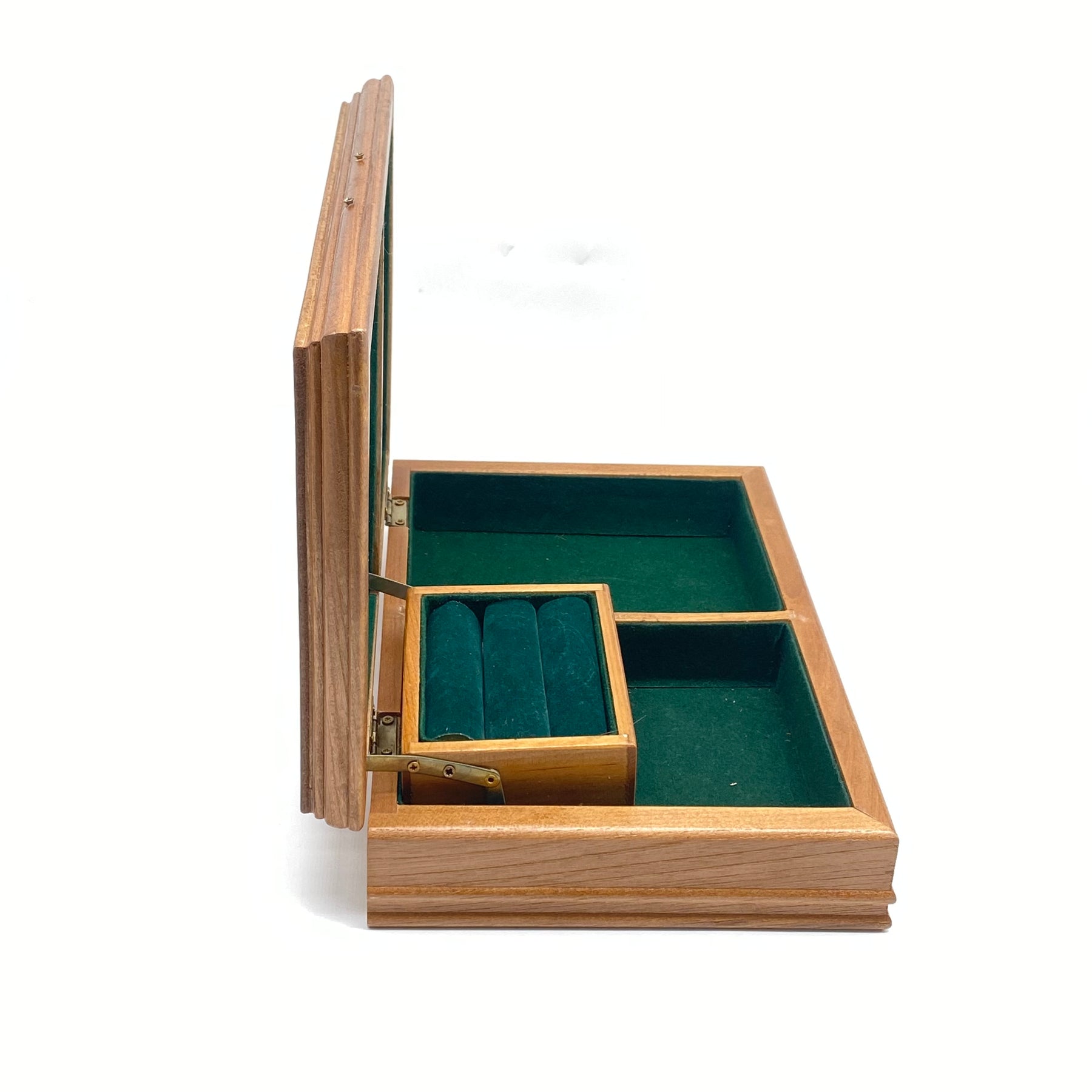 Denna eleganta förvaringsbox är tillverkad av trä och designad för att hålla ordning på allt från smycken till minnessaker. Locket har ett inbyggt spegel, och flera fack med mjuk grön sammetsinredning tillför en extra lyxig känsla. Den är idealisk för den som uppskattar ordning och retrostil i hemmet. Förvaringsboxen är begagnad men i mycket gott skick, vilket gör den till ett utmärkt tillskott i alla hem.