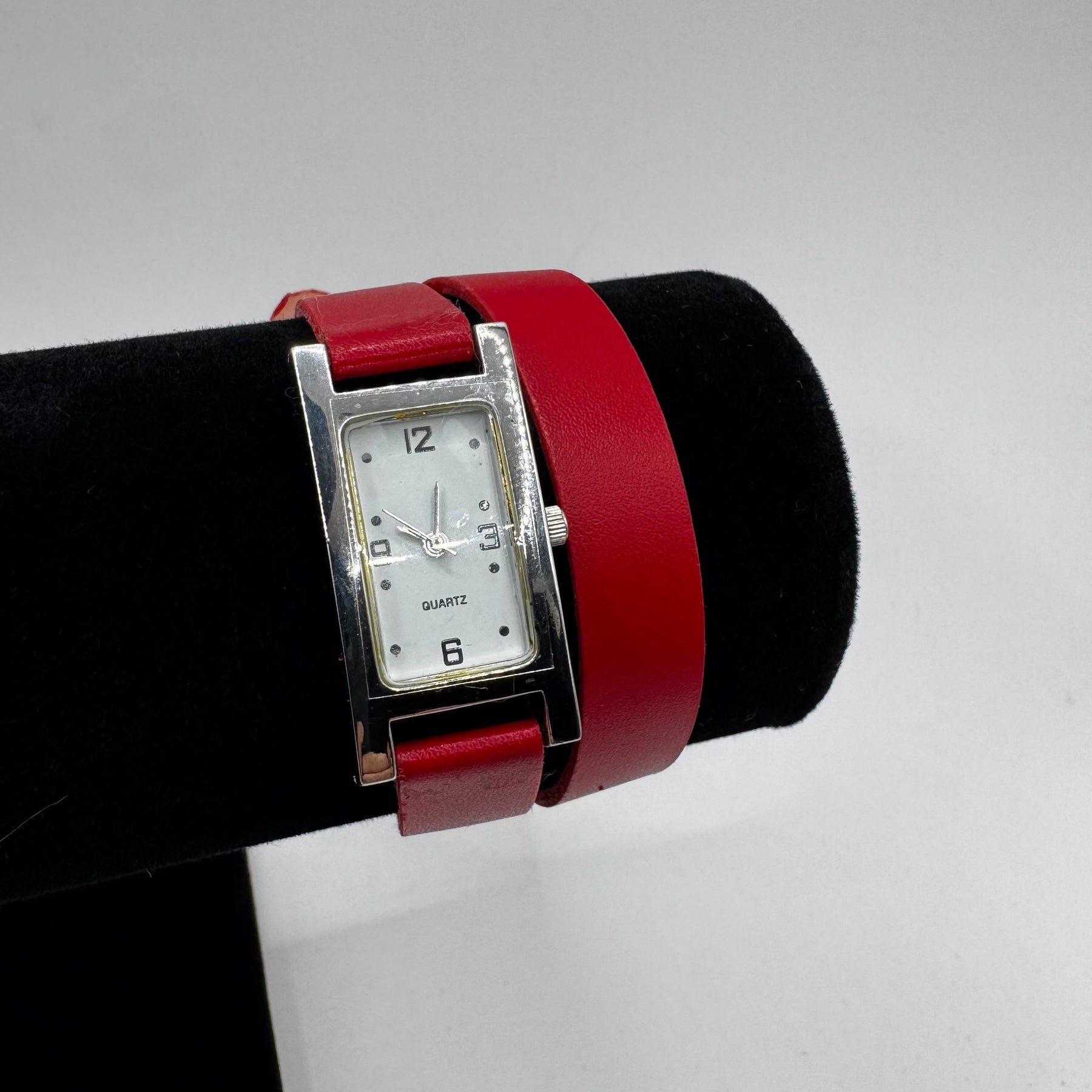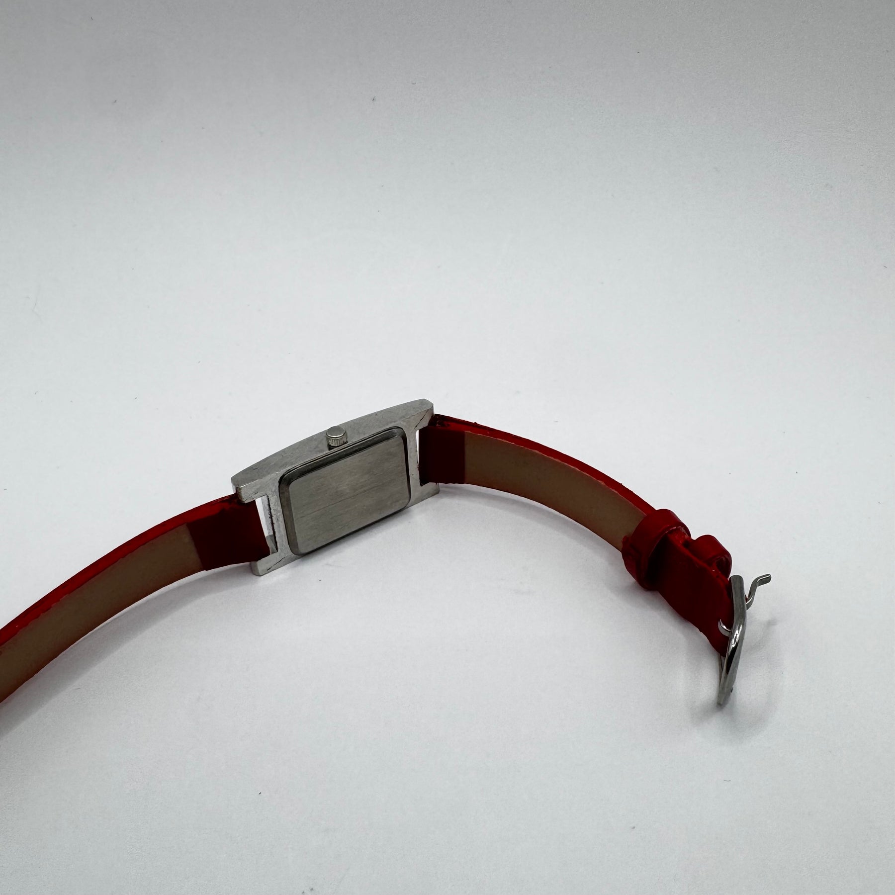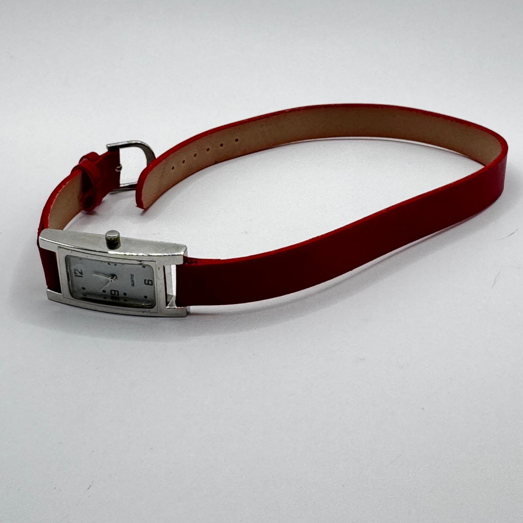 Detta stilrena kvartsur kombinerar klassisk design med moderna funktioner. Uret har en unik rektangulär urtavla och en iögonfallande röd läderrem som ger en distinkt och sofistikerad look. Tillverkat för precision och hållbarhet, är detta ur inte bara en praktisk tidsmätare utan också en elegant modeaccessoar. Klockan är begagnad men i mycket gott skick, vilket gör den till ett utmärkt val för både vardagligt bruk och speciella tillfällen.Produktspecifikationer