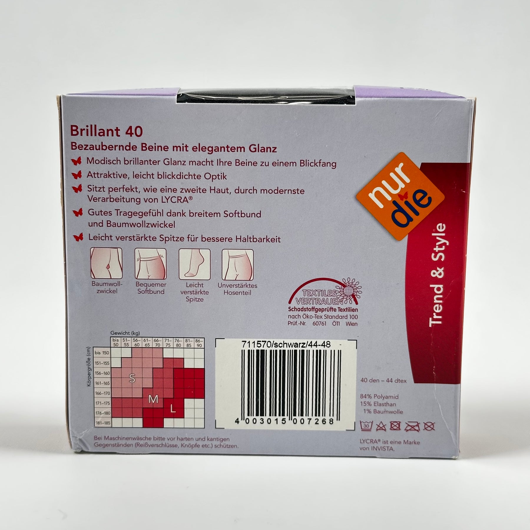 Dessa strumpbyxor från Nur Die modellen "Brillant 40" är designade för att framhäva dina ben med en fascinerande glans. Tillverkade med en blandning av polyamid och elastan som erbjuder både komfort och hållbarhet. Den kompakta storleken och det diskreta, sofistikerade utseendet gör dem till ett utmärkt val för varje tillfälle. Begagnade men i mycket gott skick.Produktspecifikationer