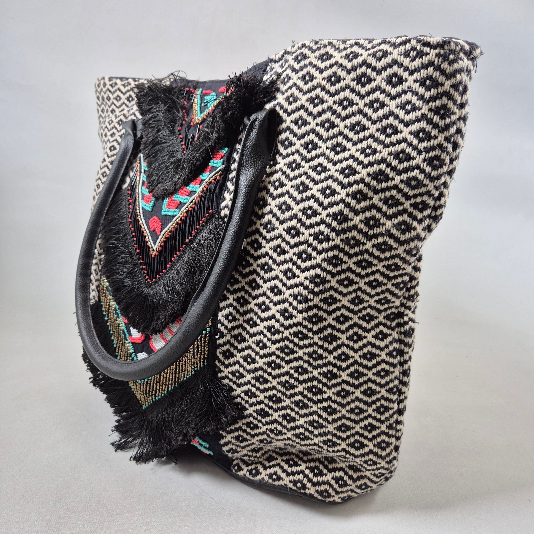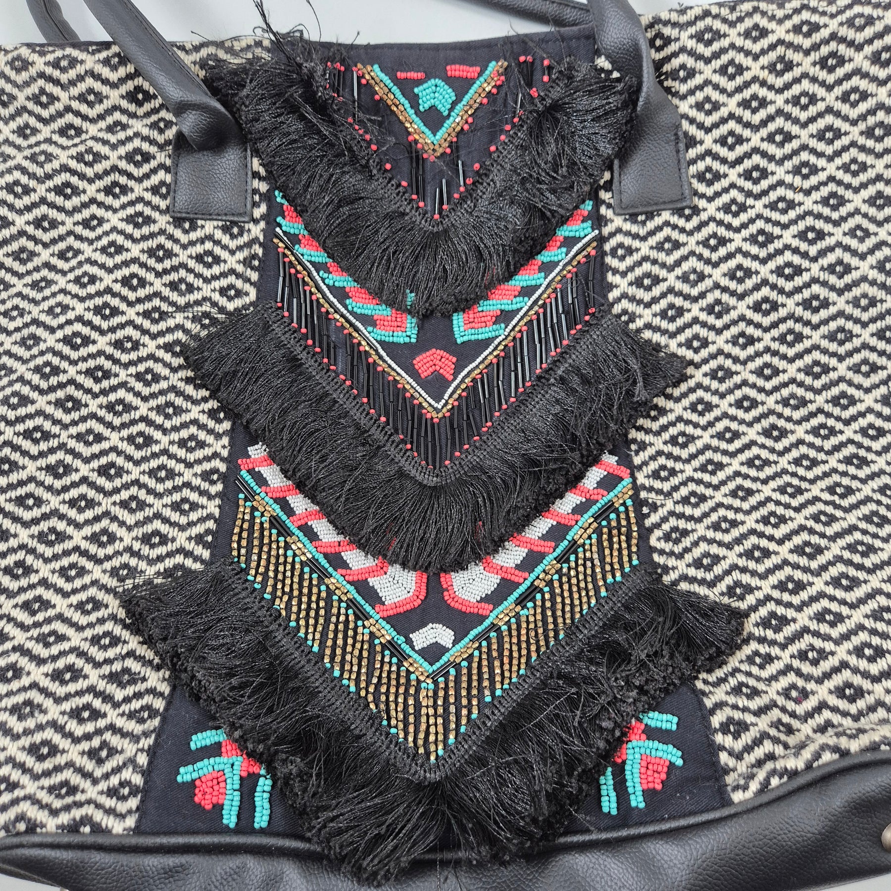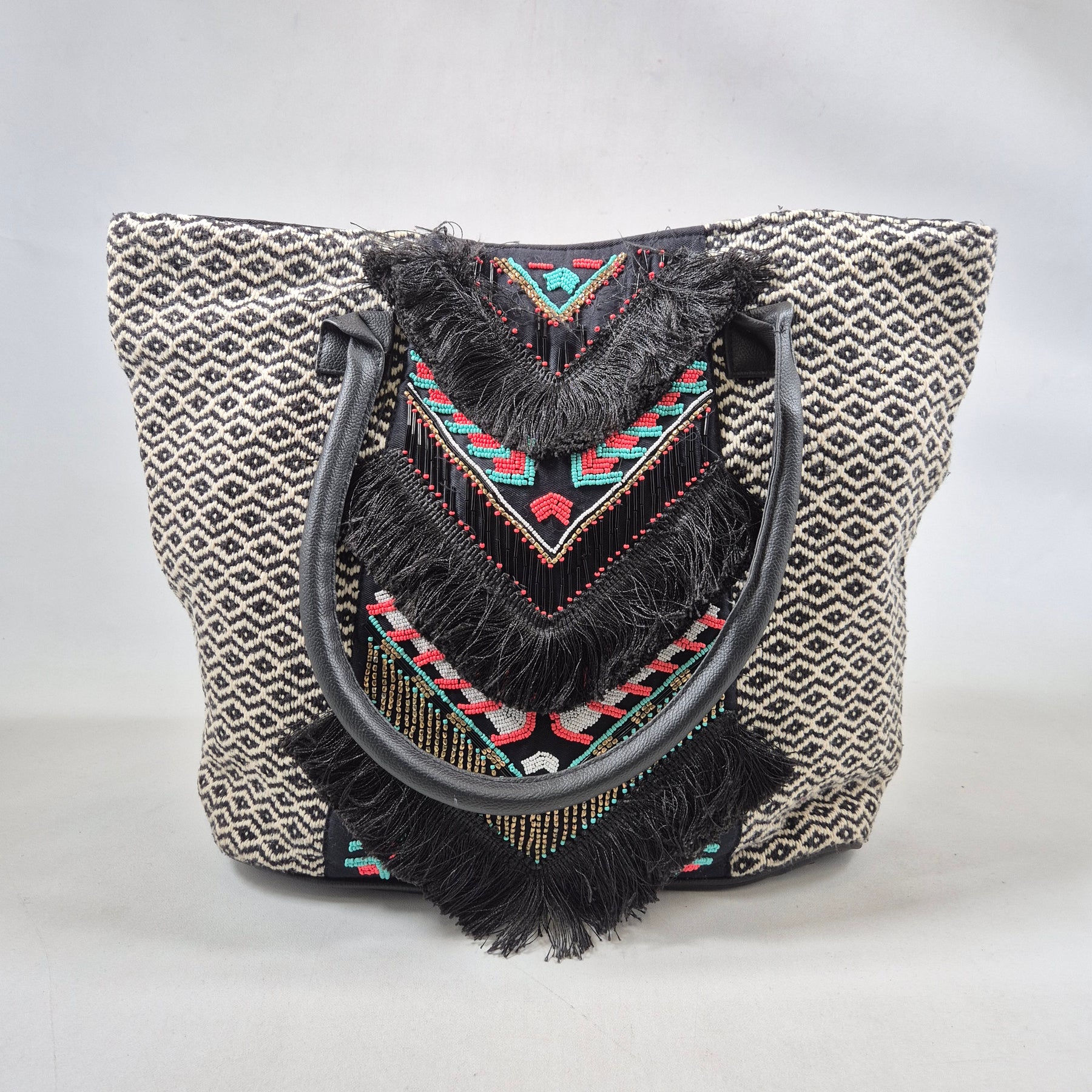 Denna handväska är utsmyckad med intrikata tribal-mönster och fluffiga detaljer, vilket gör varje tillfälle speciellt. Den rymliga designen och mjuka handtagen erbjuder både stilsäkerhet och bekvämlighet. Den är idealisk för den modeintresserade som värderar både estetik och användbarhet. Väskan är begagnad men i utmärkt skick och visar bara lätta tecken på tidigare användning.Kategori | Handväskor |
