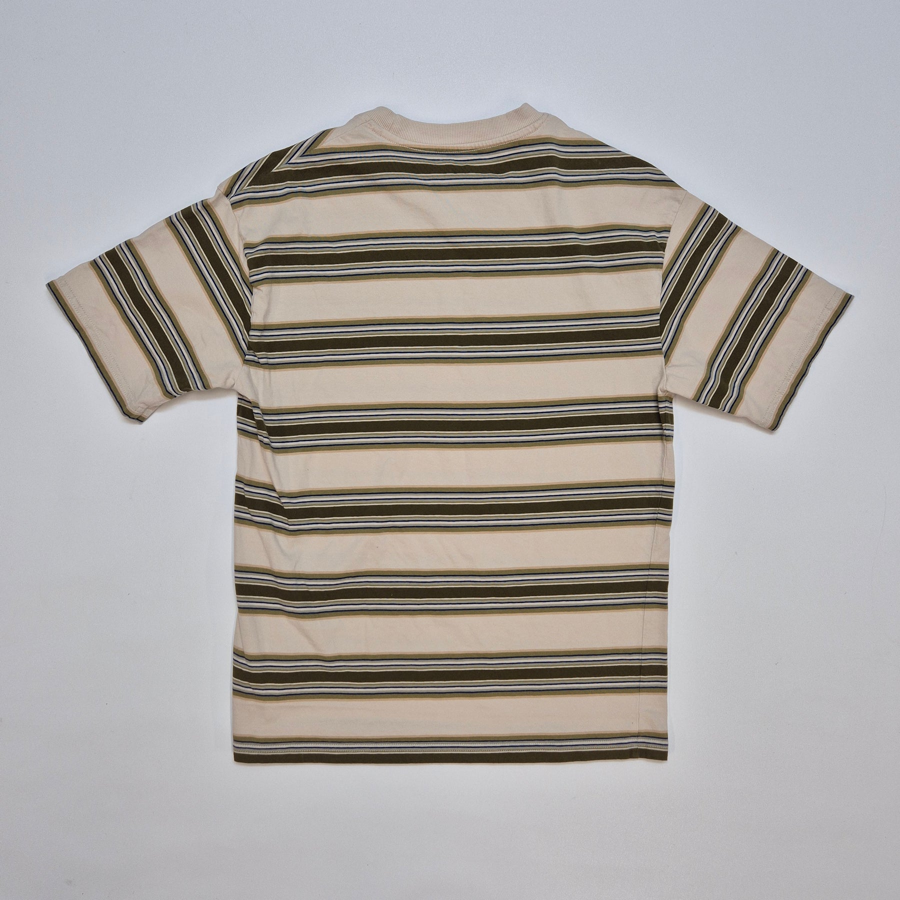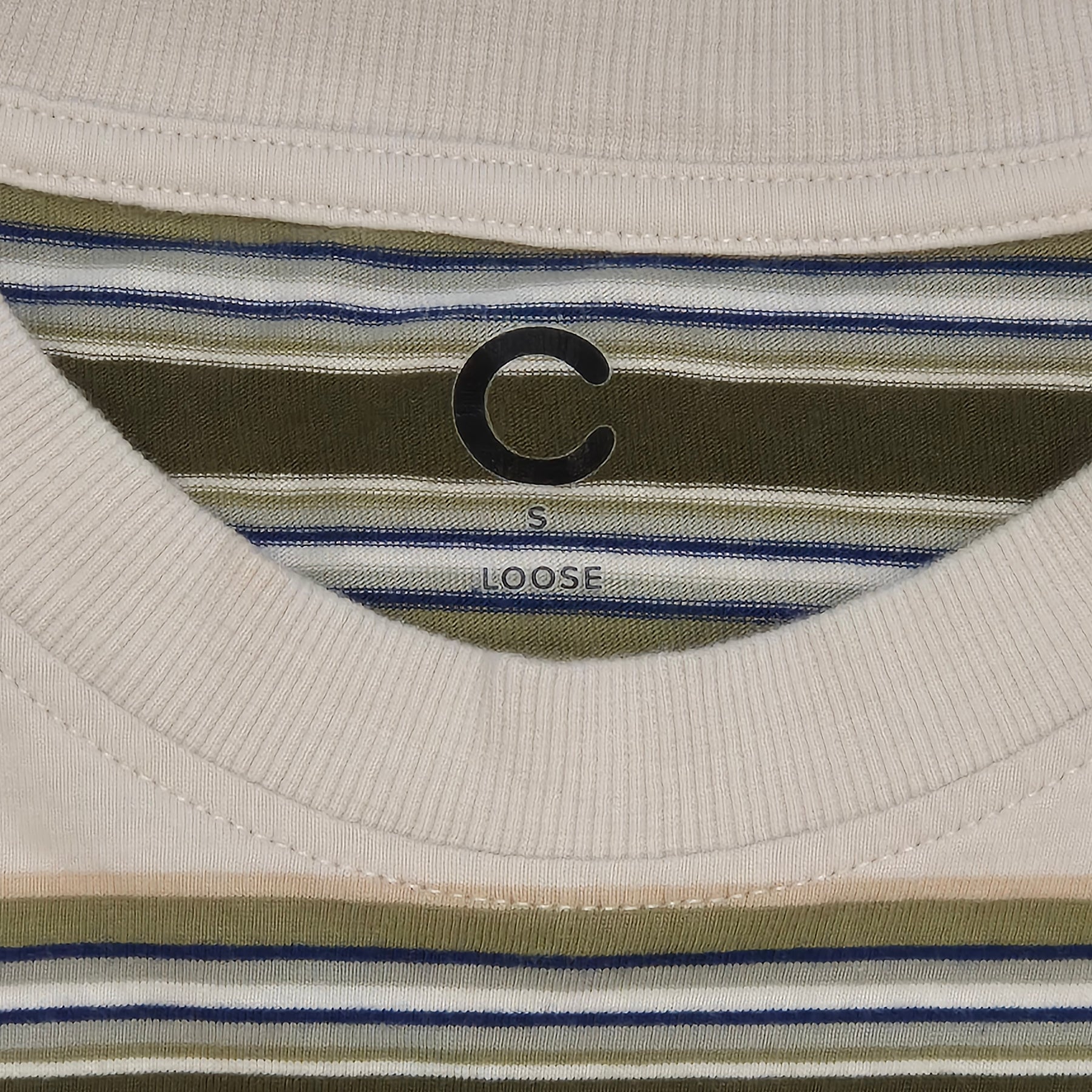 Denna kortärmade randiga t-shirt är sofistikerad med sitt enkla men iögonfallande mönster i beige, grönt och blått. Med en avslappnad passform och en diskret etikett från märket 'C', erbjuder den både komfort och stil. Dess tidlösa design gör den idealisk för såväl vardagsbruk som för mer avslappnade sociala tillställningar. Skjortan är använt men är i mycket gott skick, vilket gör den till ett utmärkt köp för den modeintresserade.Produktspecifikationer