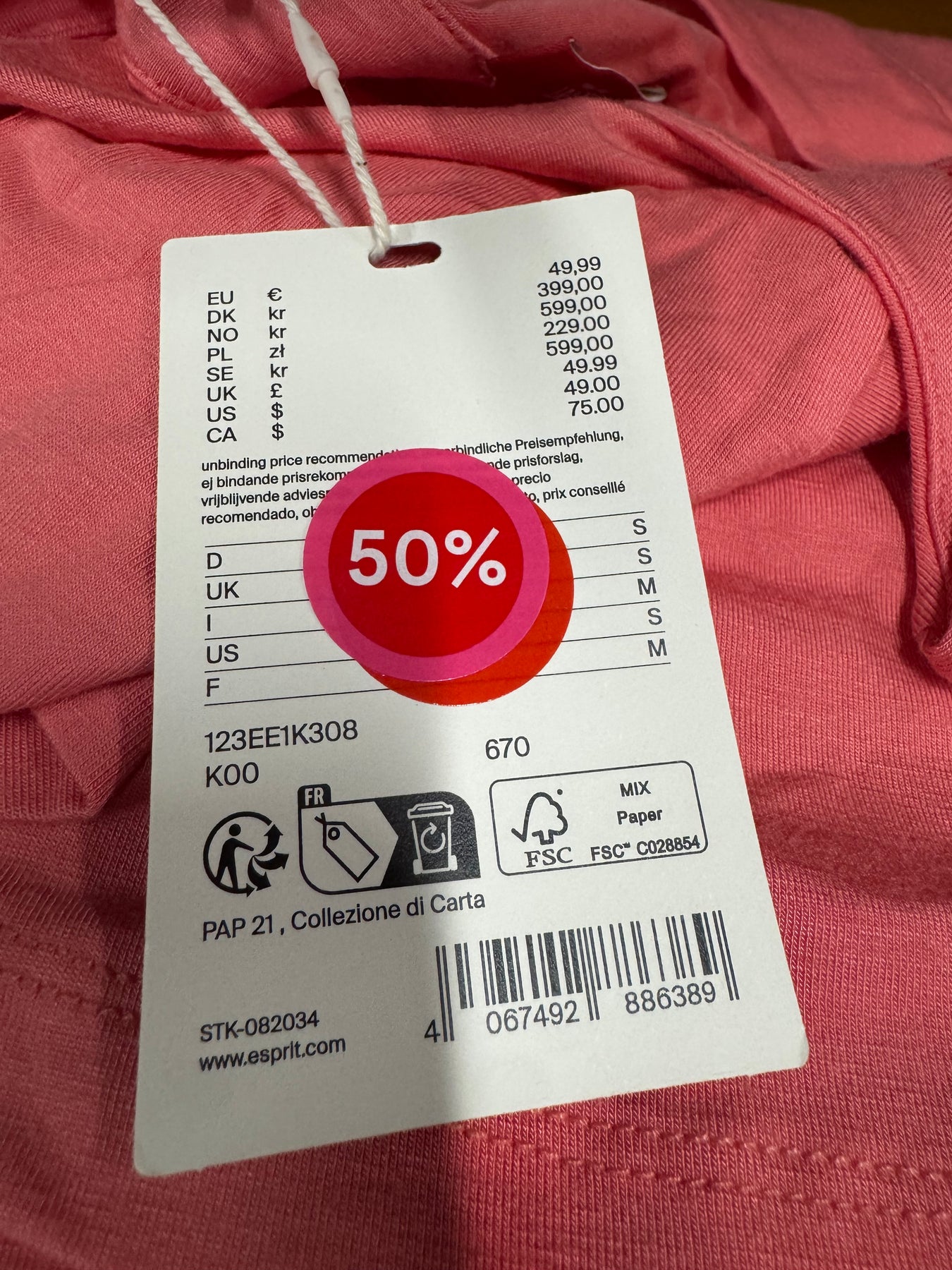 Denna eleganta, korallrosa tröja från anrika Esprit är perfekt för både vardagligt och kontorsbruk. Tillverkad i en mjuk blandning som erbjuder både komfort och hållbarhet. Med en ren design och diskret logotyp är den idealisk för den som söker både stil och funktionalitet. Produkten är ny med etiketter, komplett med en förmånlig 50% rabatt.Produktspecifikationer