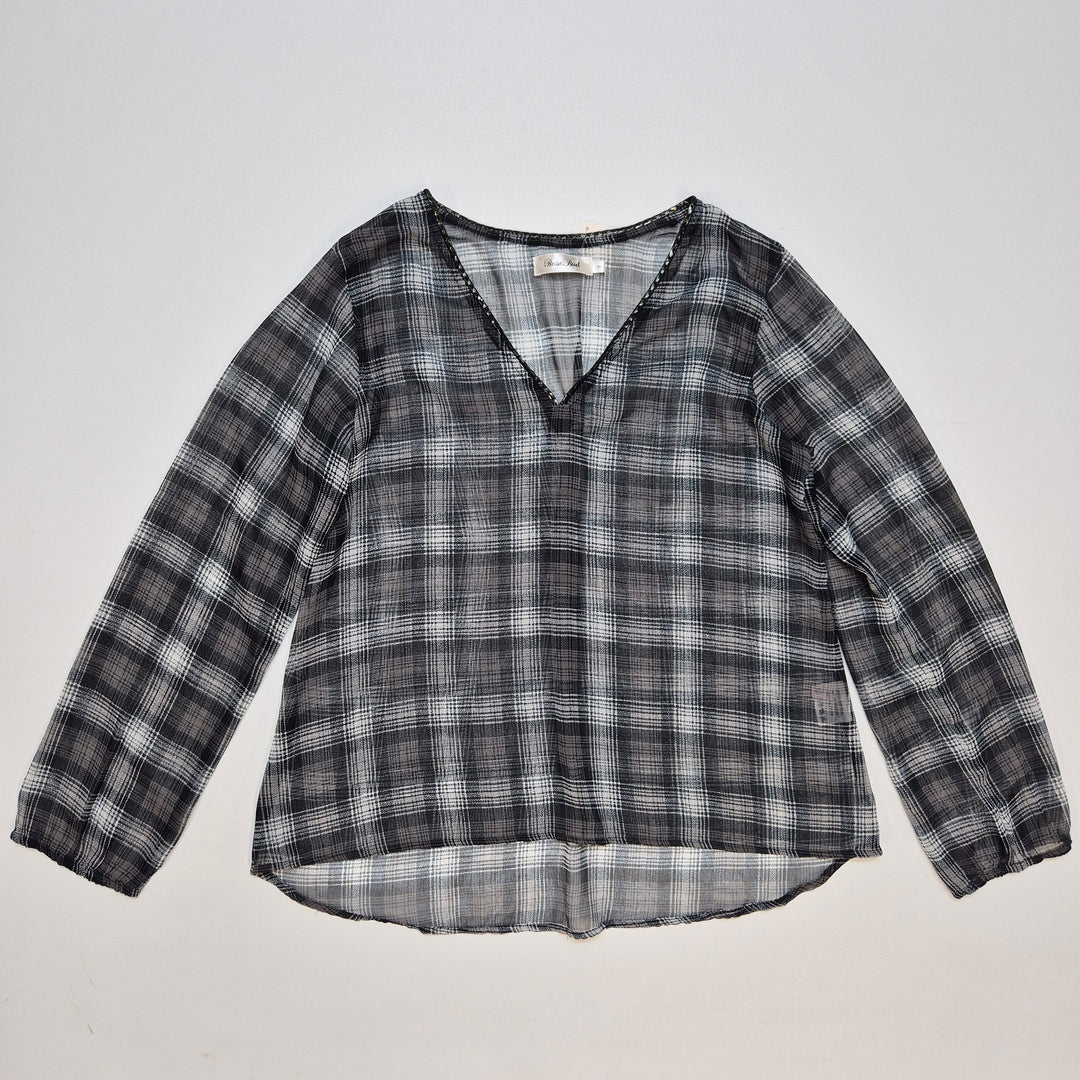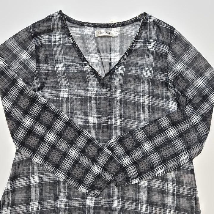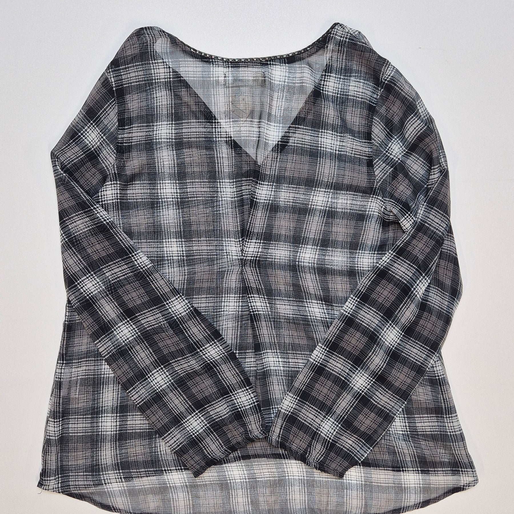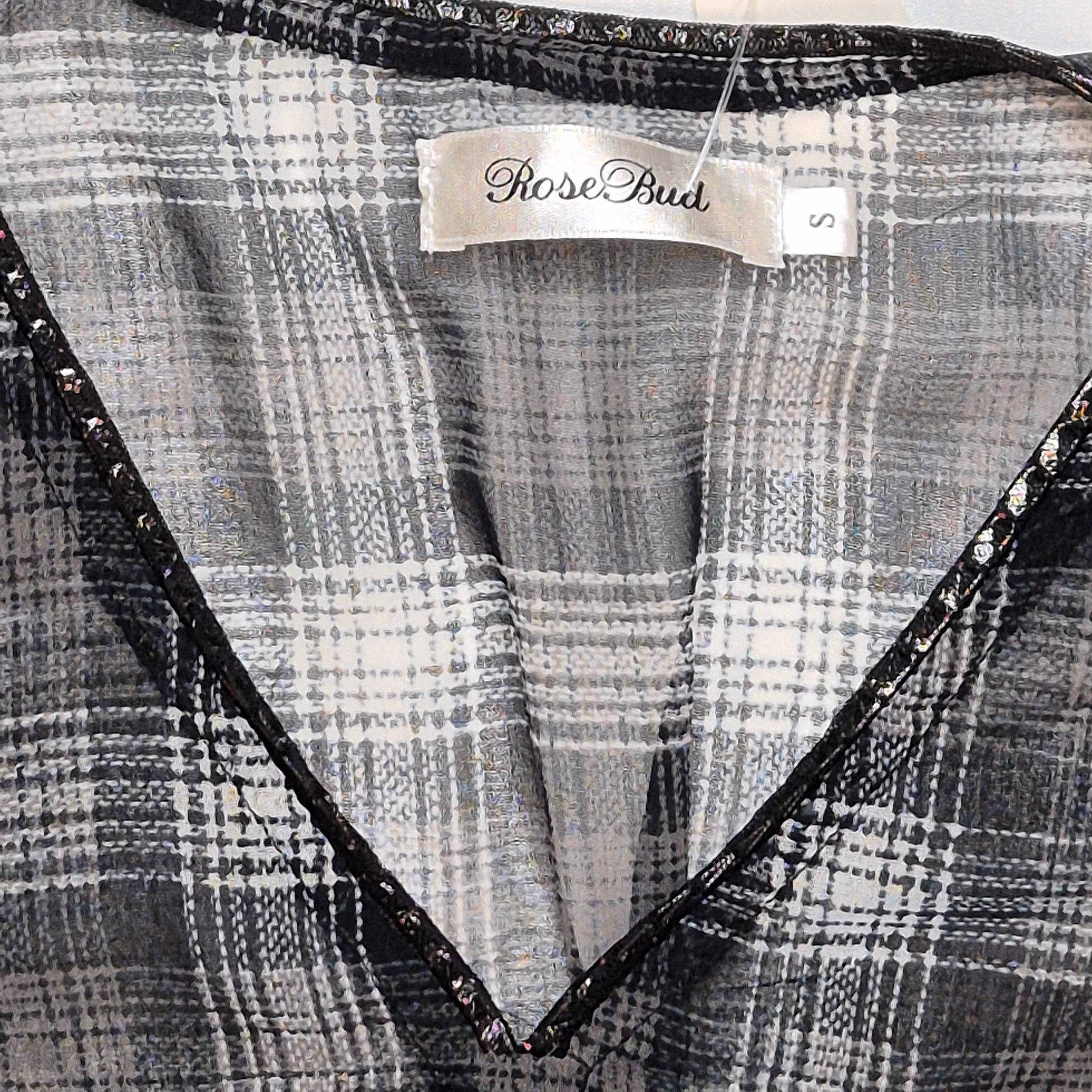 Denna snygga långärmade blus har en subtil och sofistikerad rutig design i nyanser av grått och svart. Tillverkad av RoseBud, känd för att skapa bekväma och stilfulla plagg. Blusen har en snygg V-ringning med dekorativa detaljer som ger en unik touch. Produkten är begagnad men i mycket gott skick, vilket gör den till ett smart och stilfullt val för alla som uppskattar klassisk mode.Produktspecifikationer