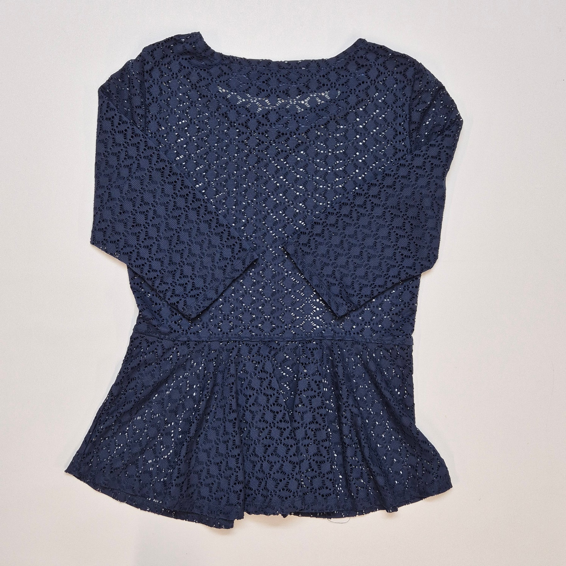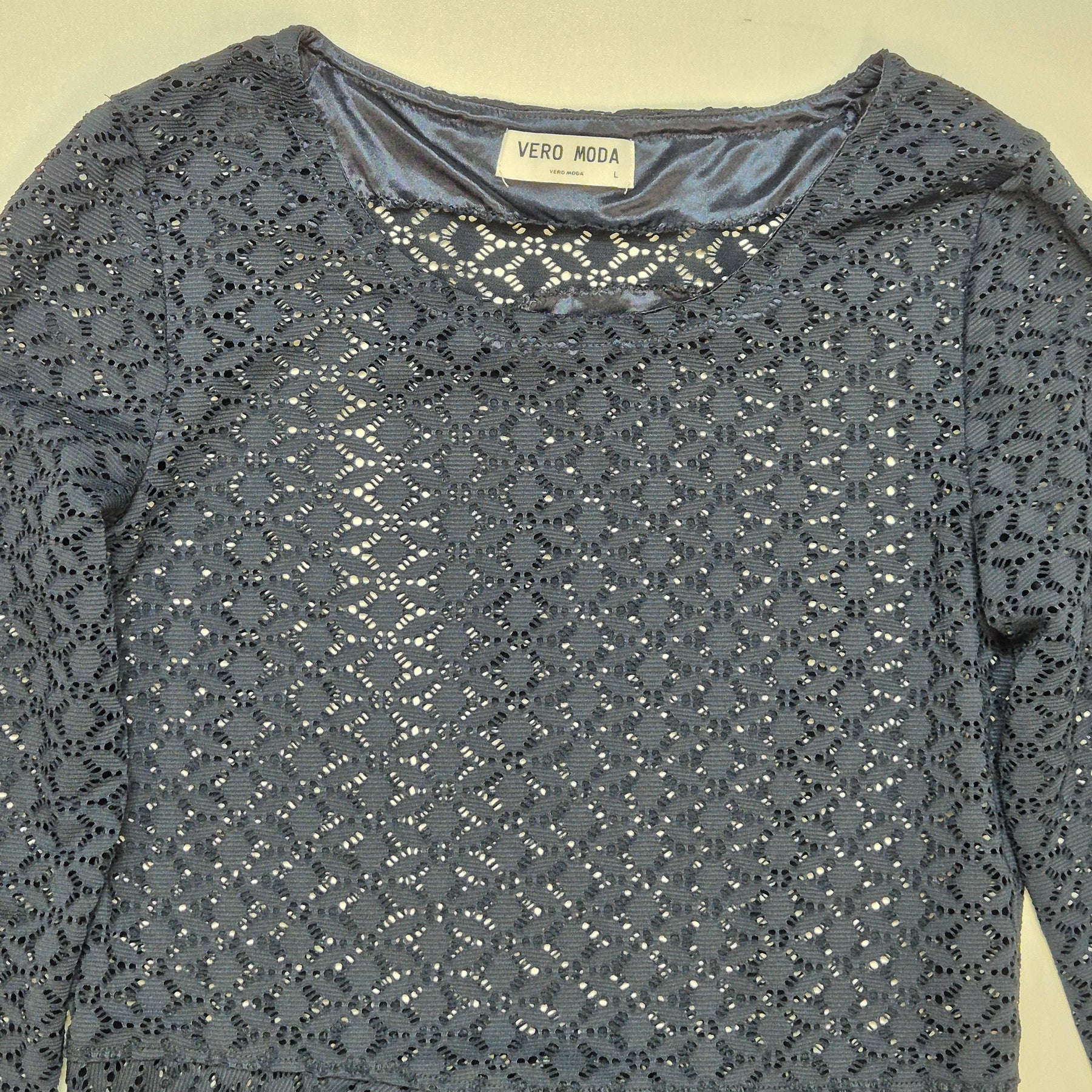 Denna charmiga mörkblå tröja är från det populära märket VERO MODA. Den är designad med en detaljrik spets som ger ett sofistikerat och feminint uttryck. Den är perfekt för både vardagliga och festliga tillfällen, och dess tidlösa snitt gör den till ett måste i garderoben. Klänningen är begagnad men fortfarande i mycket gott skick.