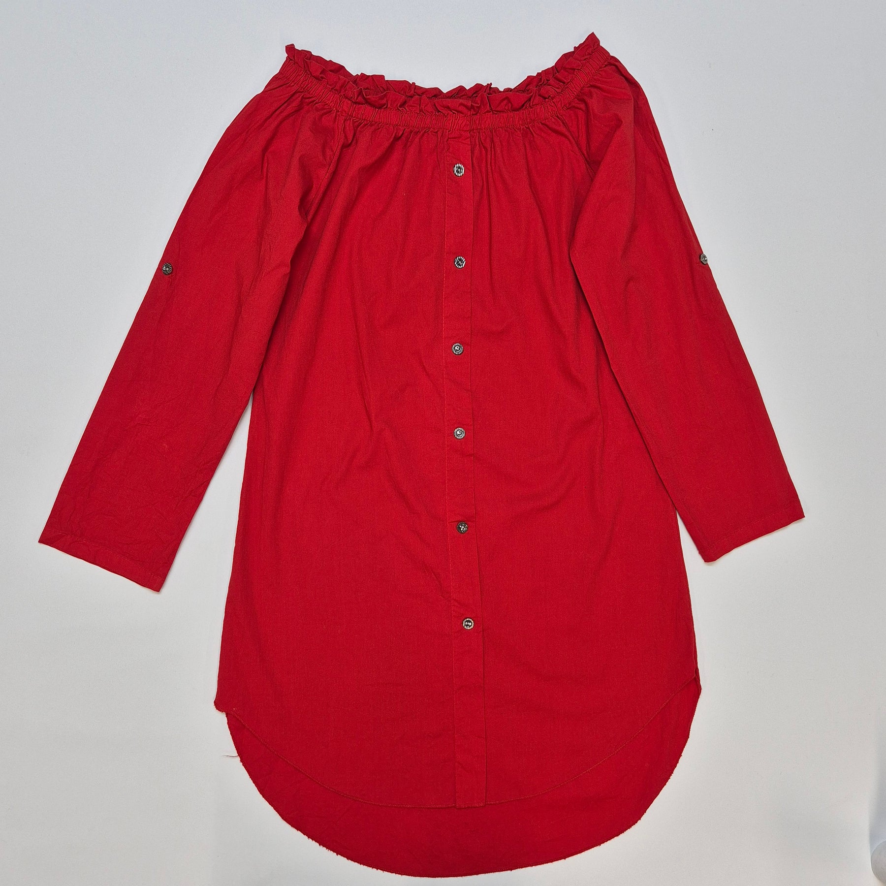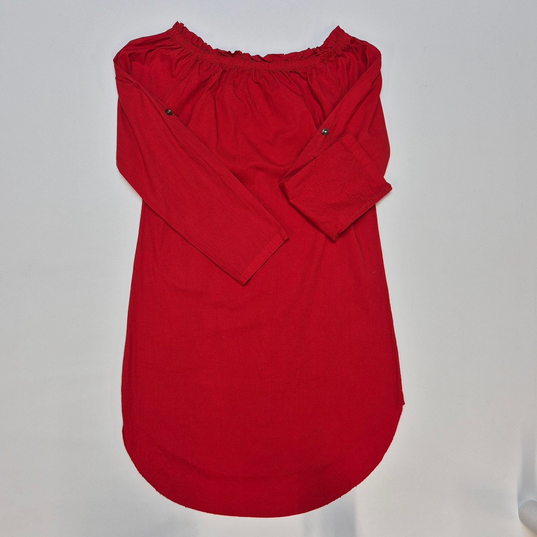 Denna stilfulla blus är tillverkad av en komfortabel blandning av bomull och elastan, vilket ger både komfort och en smickrande passform. Den röda nyansen kombinerad med dess enkla och rena design gör den perfekt för såväl kontoret som en utekväll. Blusen är i gott skick och har en diskret elastisk detalj vid nacken, vilket bidrar till en flexibel passform.Produktspecifikationer
