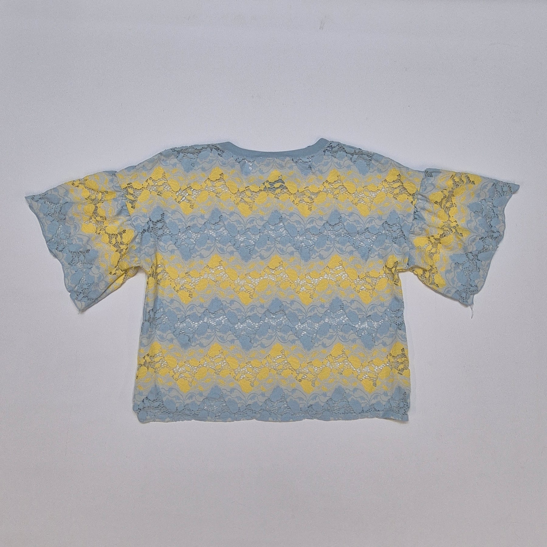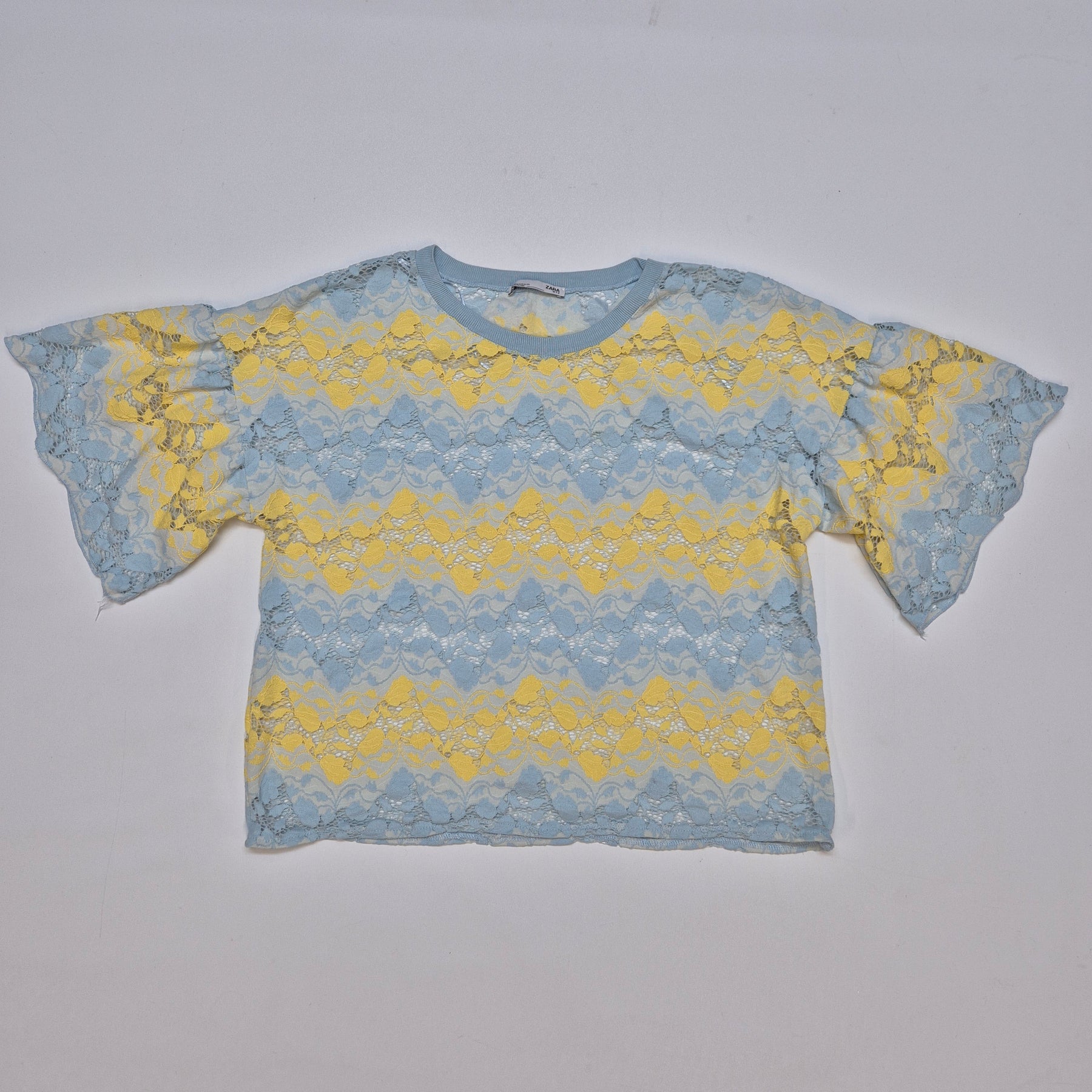 Denna charmiga spetstopp från Zara är en sann blickfångare. Toppen har ett lager av intrikat blå och gul spets med genomskinliga detaljer, perfekt för att addera en touch av färg till din garderob. Den är idealisk för både festliga tillfällen och vardagligt bruk. Toppen är använd men befinner sig i gott skick, trots några mindre tecken på tidigare användning vilket bidrar till dess vintage charm.