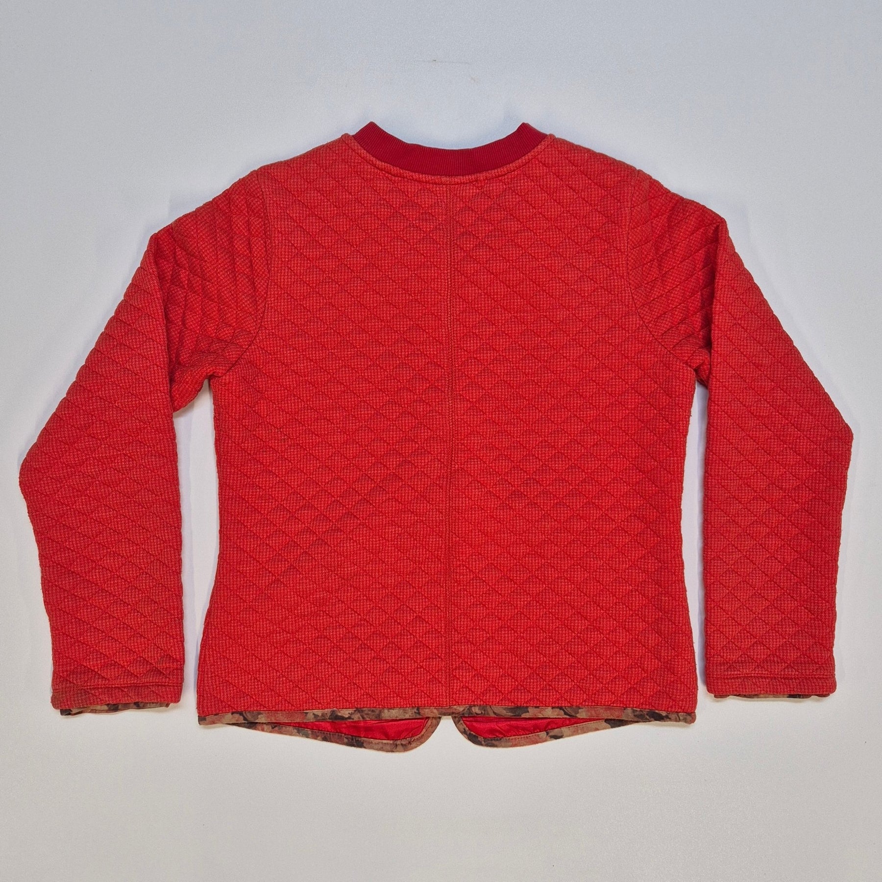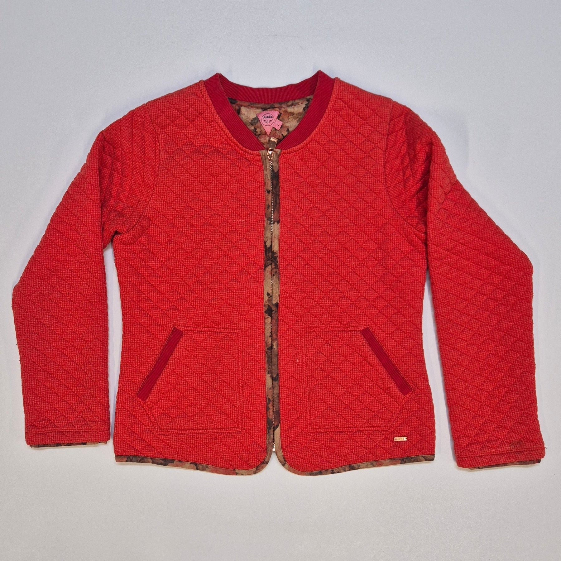 Denna trendiga röda stickade jacka är perfekt för vardagligt bruk. Jackan har långa ärmar och en framträdande dragkedja, kompletterad med en unik blommig invändig foder. Använd men i gott skick, vilket ger ett stilfullt och bekvämt plagg till din garderob.