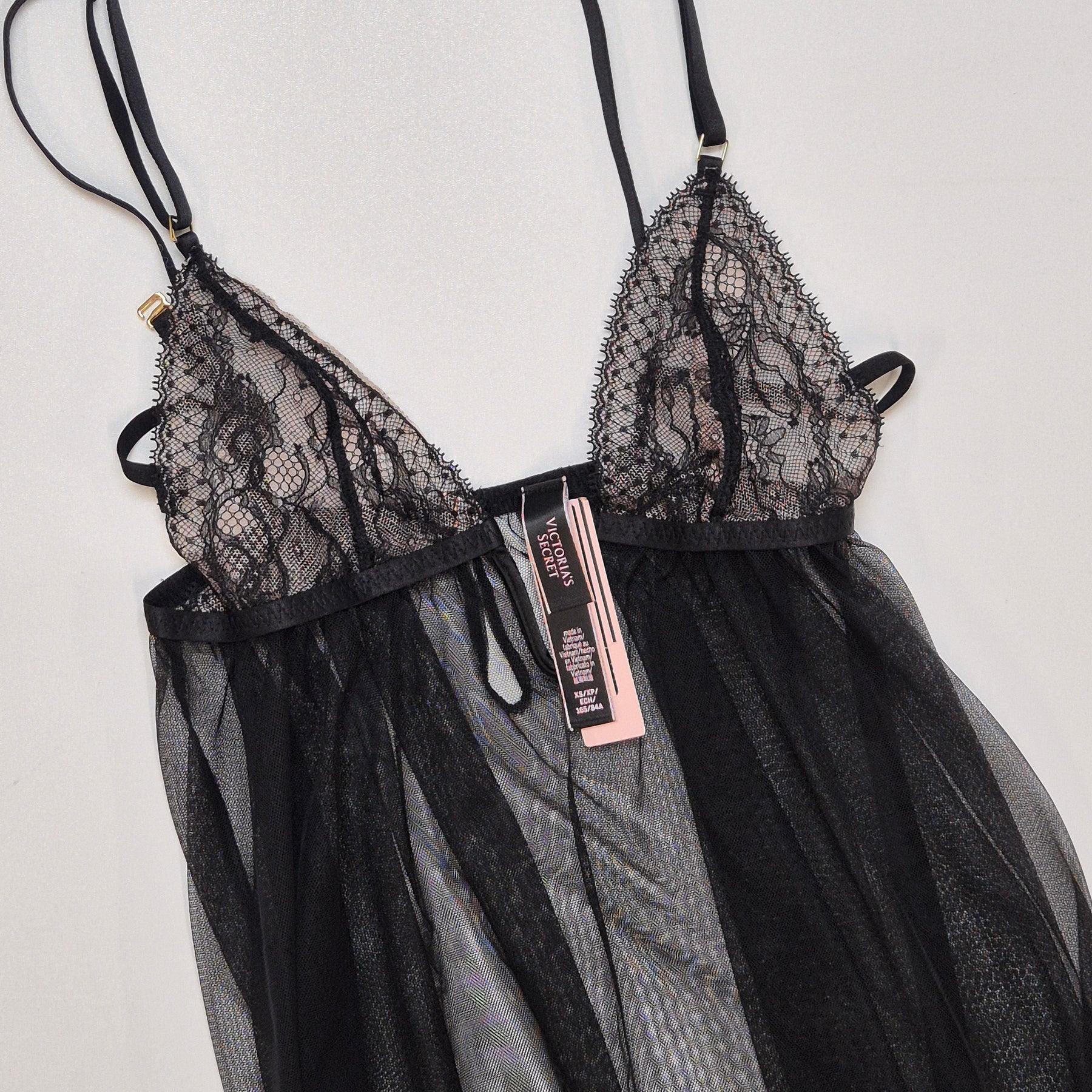 Elegant svart babydoll från Victoria’s Secret, tillverkad i tunn tyll med vackra spetsdetaljer. Justerbara axelband för perfekt passform. En sensuell och lyxig nattplagg som kombinerar komfort med feminin design.