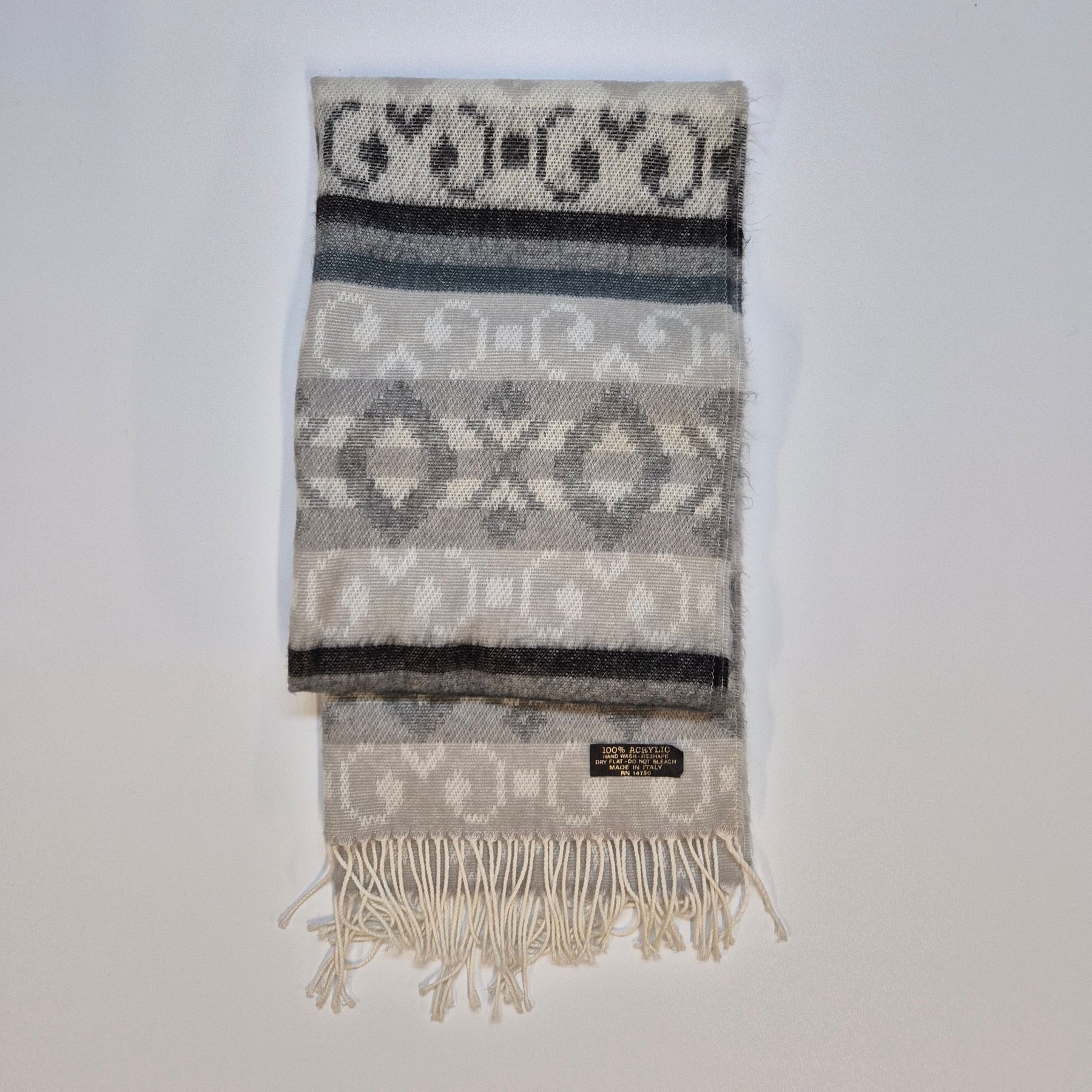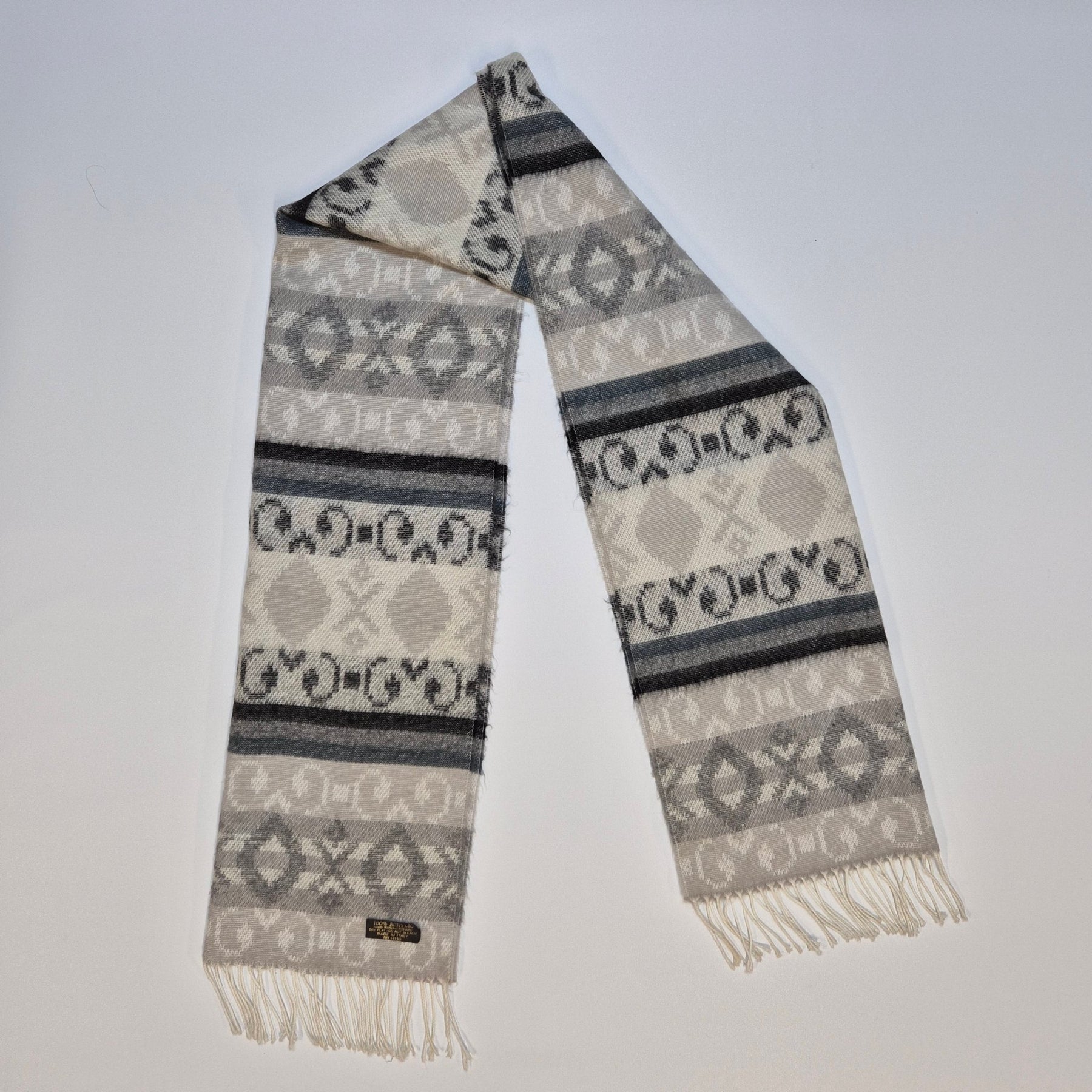 En stilig och varm halsduk tillverkad i akryl. Den har ett geometriskt mönster i nyanser av grått och vitt. Perfekt för kyliga dagar och kan bäras av alla. Skicket är begagnat men välskött.