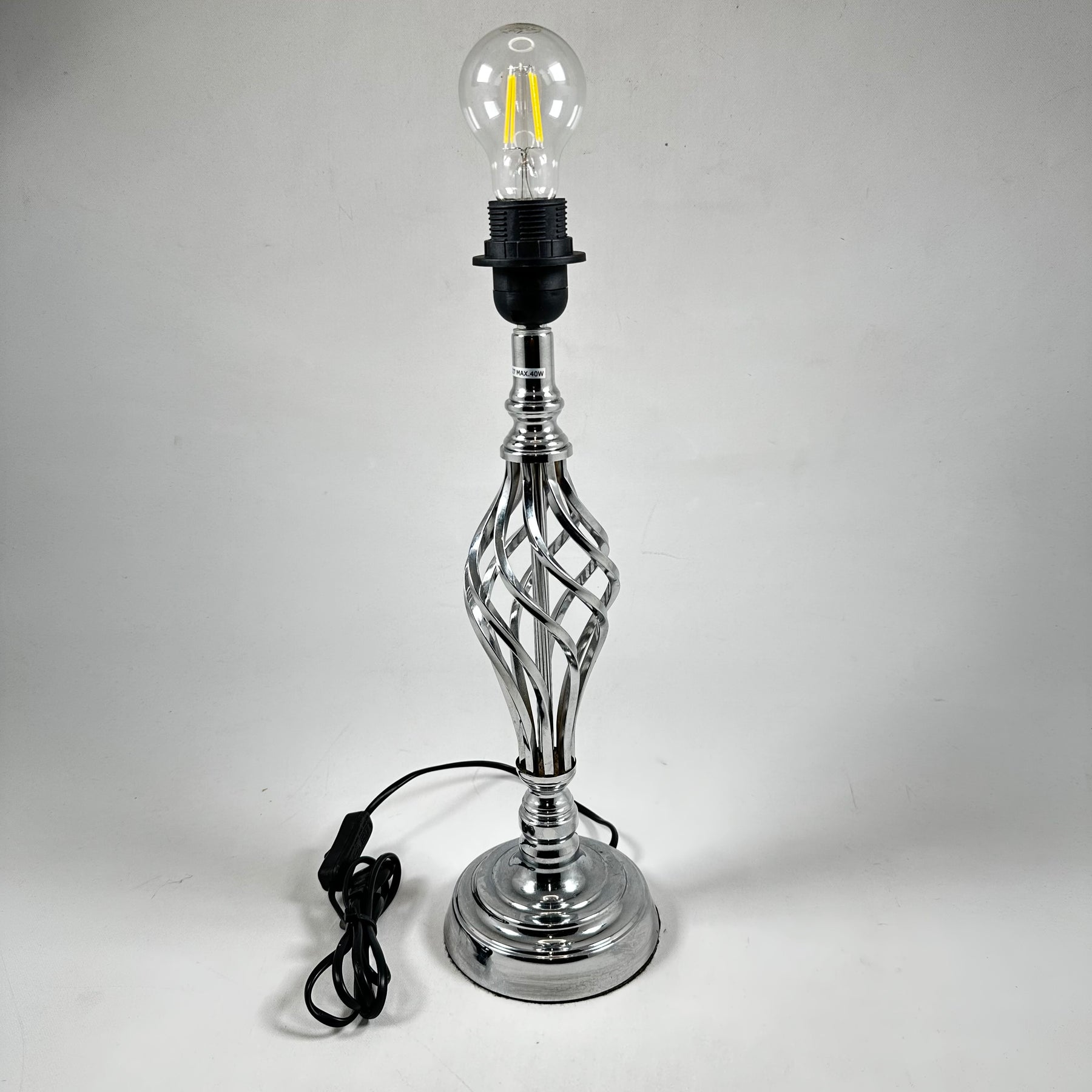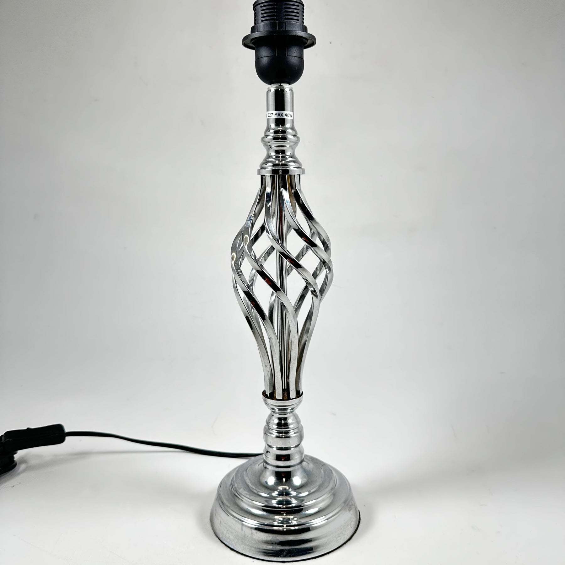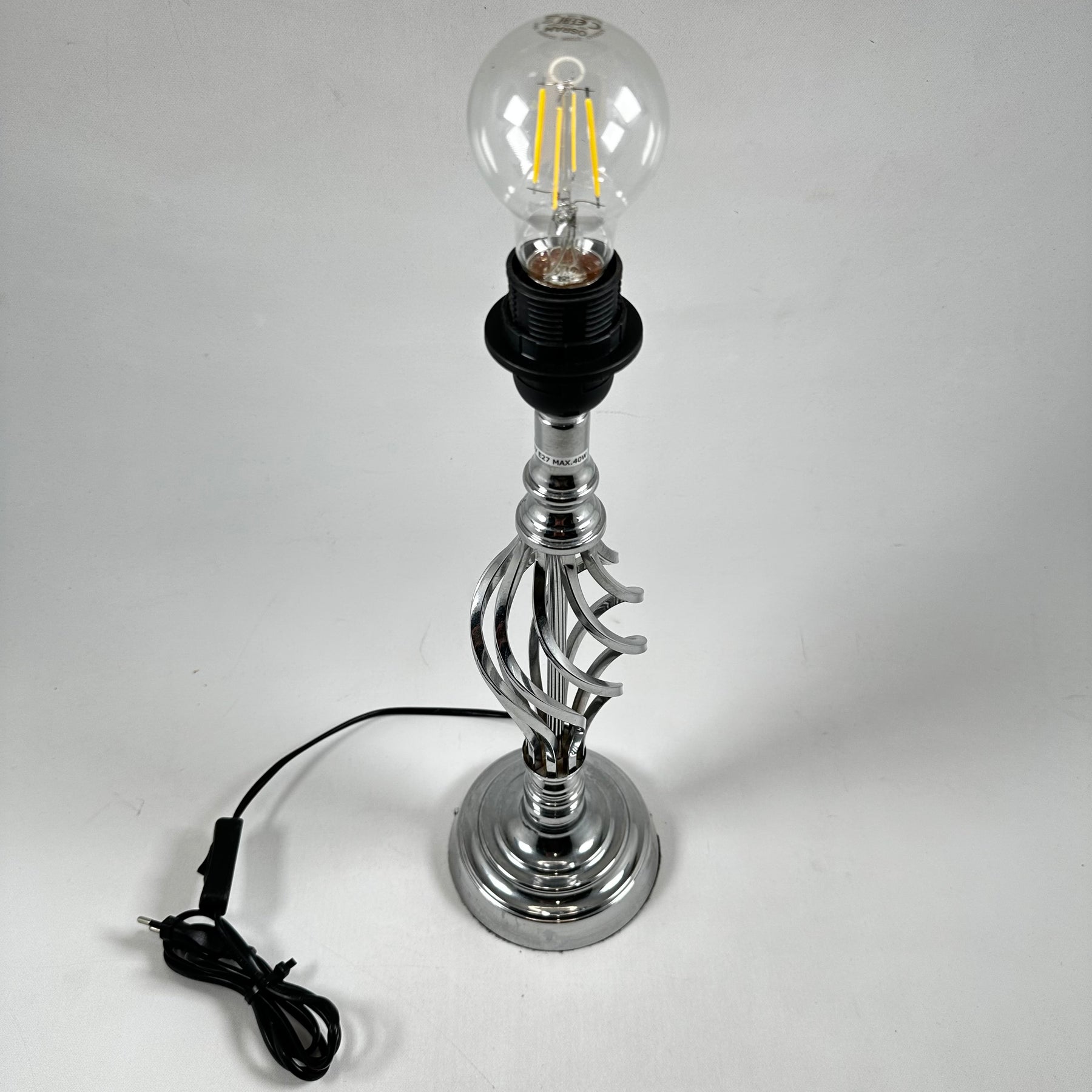 Denna sofistikerade bordlampa har en tidlös design med en vriden kromfot som ger en modern touch till varje rum. Lampan är tillverkad av Ellos, kända för sin höga kvalitet och stilrena designobjekt. Den kompakta storleken gör den idealisk för placering på små bord eller i bokhyllor. Begagnad men i utmärkt skick, vilket gör den till ett utmärkt val för både hem och kontor.Produktspecifikationer