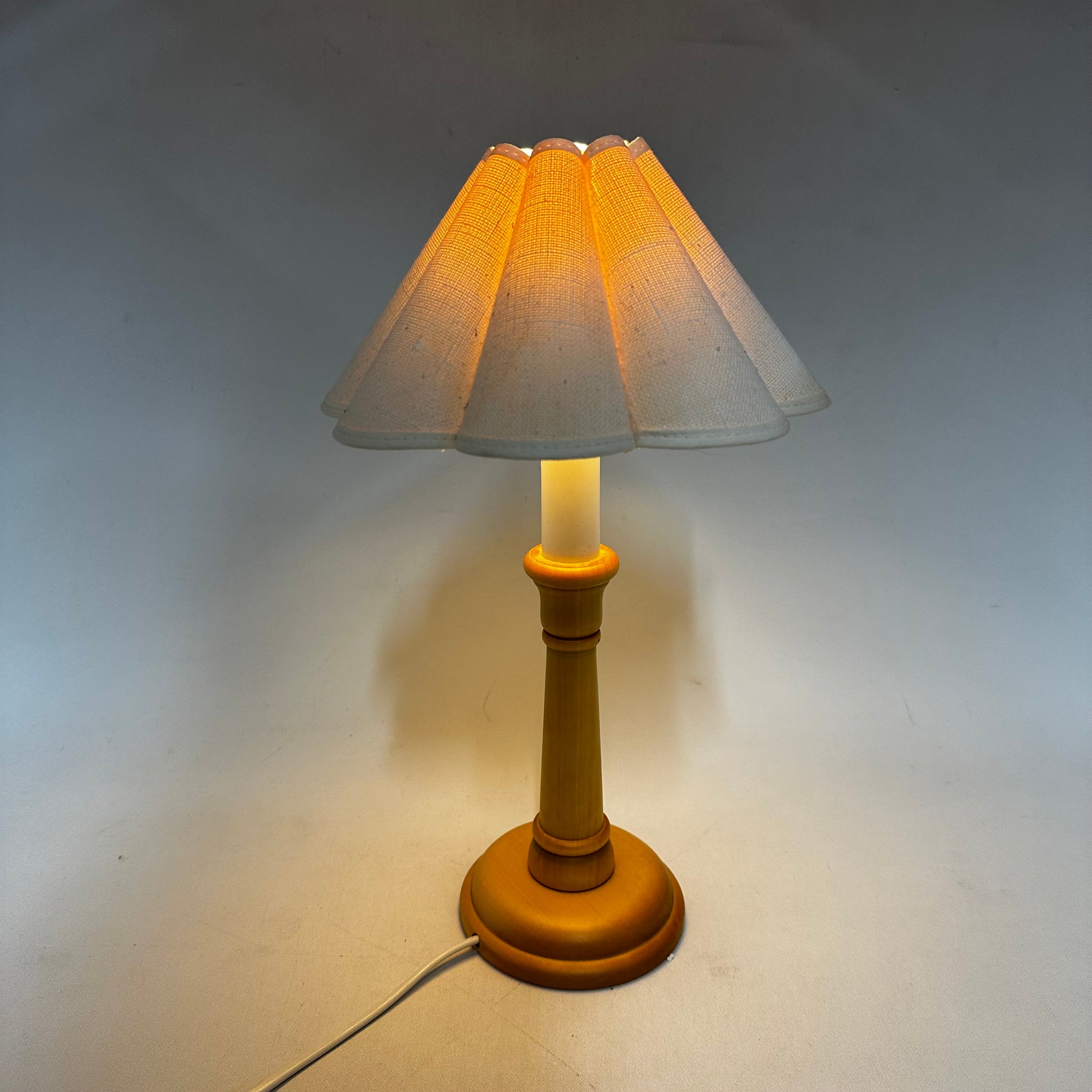 Denna vackra bordslampa har en varm träfot och en textilskärm i neutralfärg, som tillsammans skapar ett mjukt och inbjudande ljus. Den är en perfekt kombination av funktionell belysning och klassisk design, och passar utmärkt i ett vardagsrum eller på ett skrivbord. Skicklig tillverkning syns i varje detalj, och lampan är i gott skick med mindre tecken på användning.Produktspecifikationer