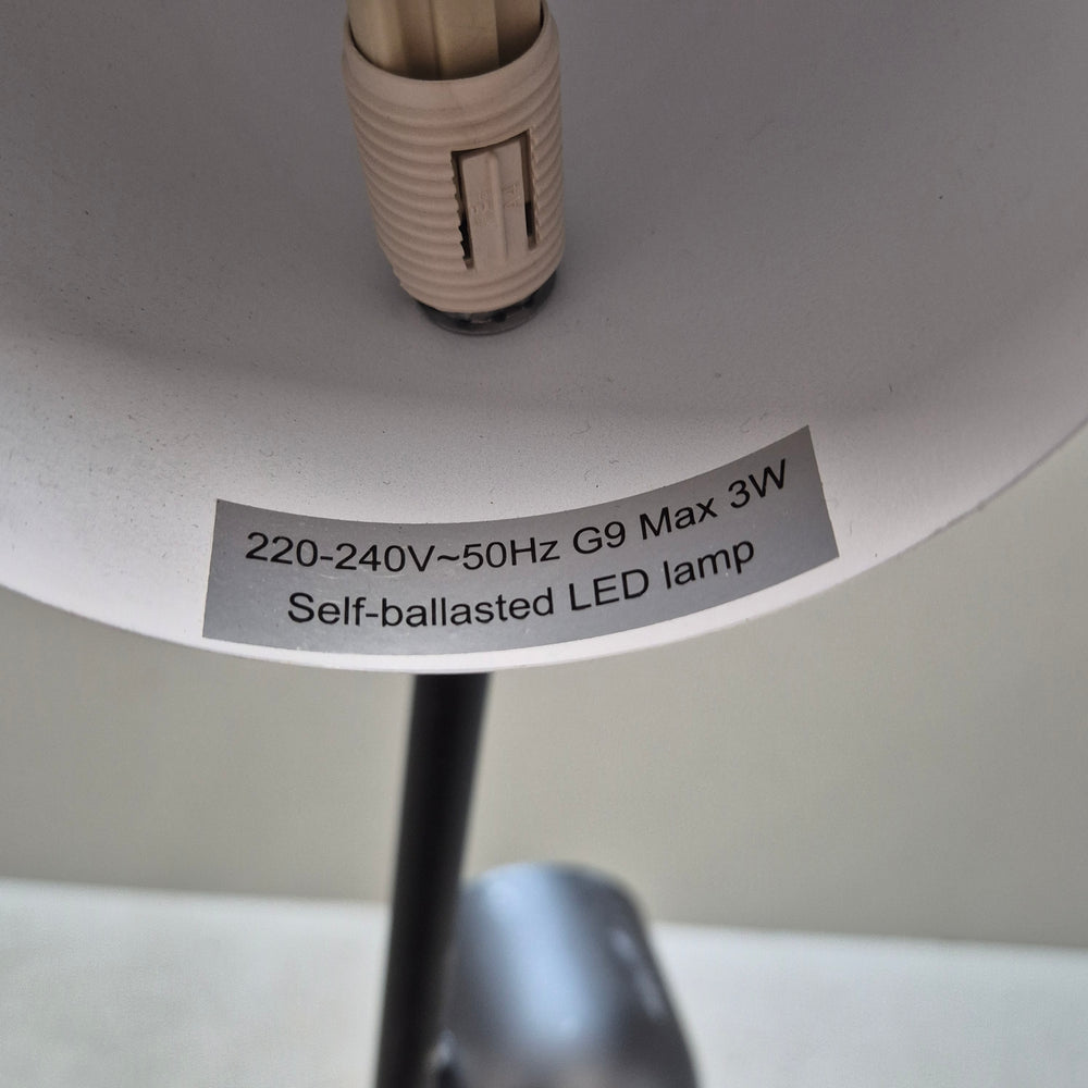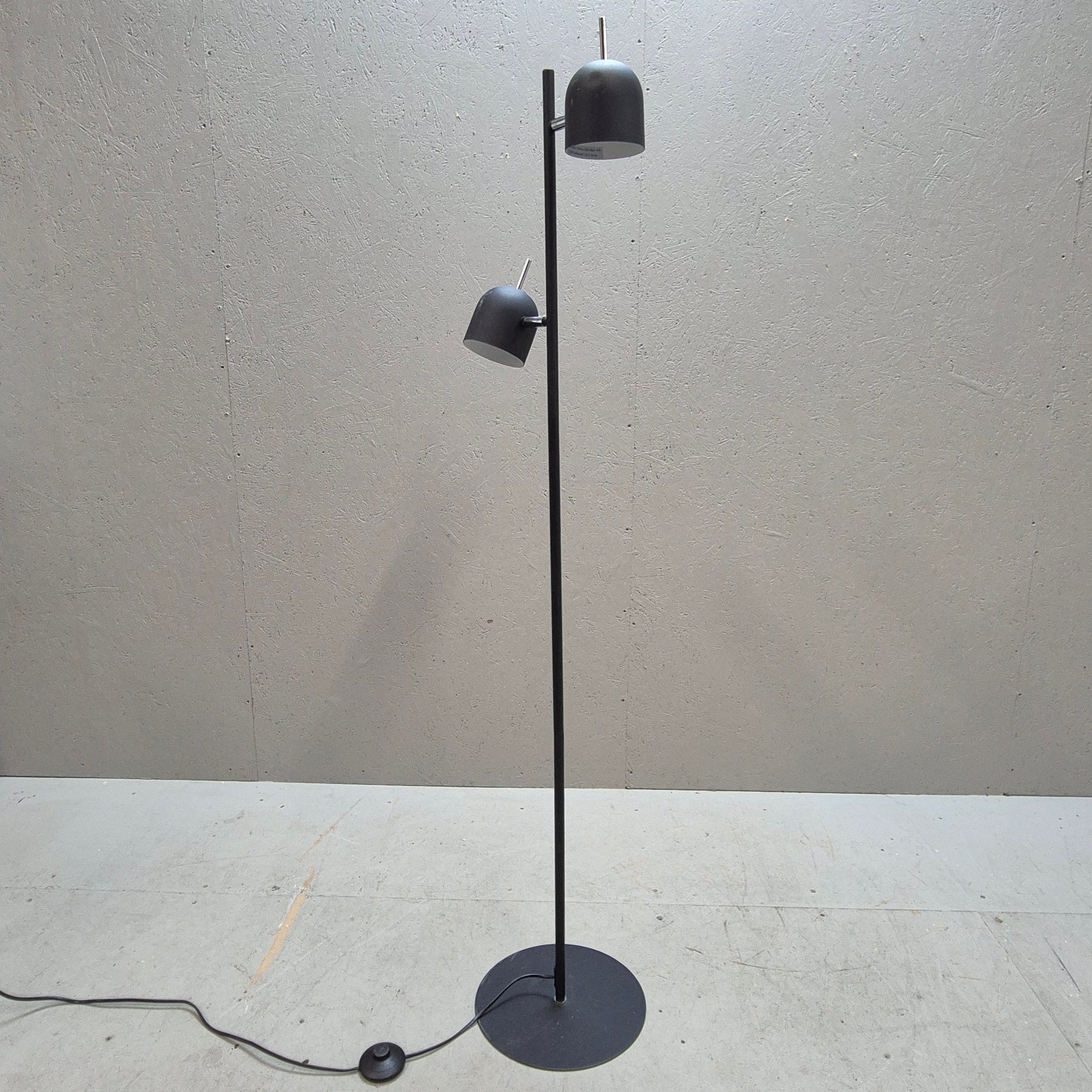 Denna eleganta golvlampa har två oberoende, justerbara lampskärmar som ger dig möjligheten att rikta ljuset precis där du behöver det. Tillverkad för att passa både LED och traditionella glödlampor. Golvlampan har en stilren design i svart färg, vilket gör den till en attraktiv inredningsdetalj i både kontoret och vardagsrummet. Lampan är begagnad men i mycket gott skick och väntar på sitt nya hem.